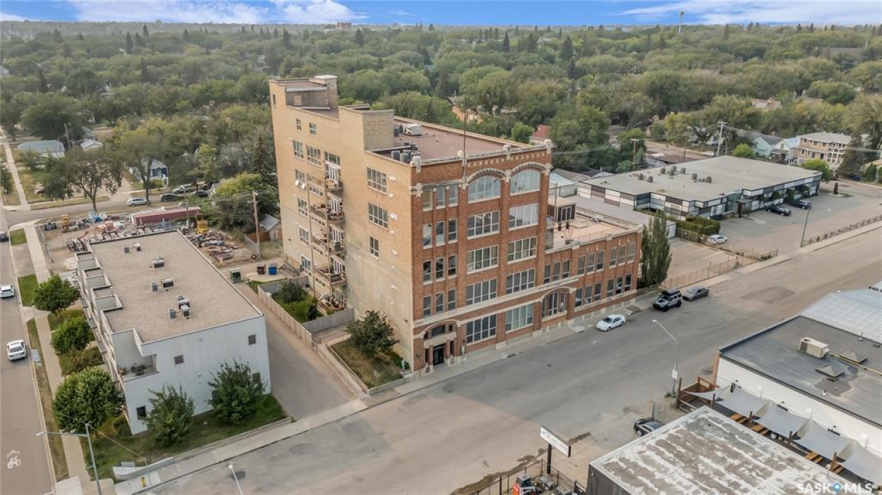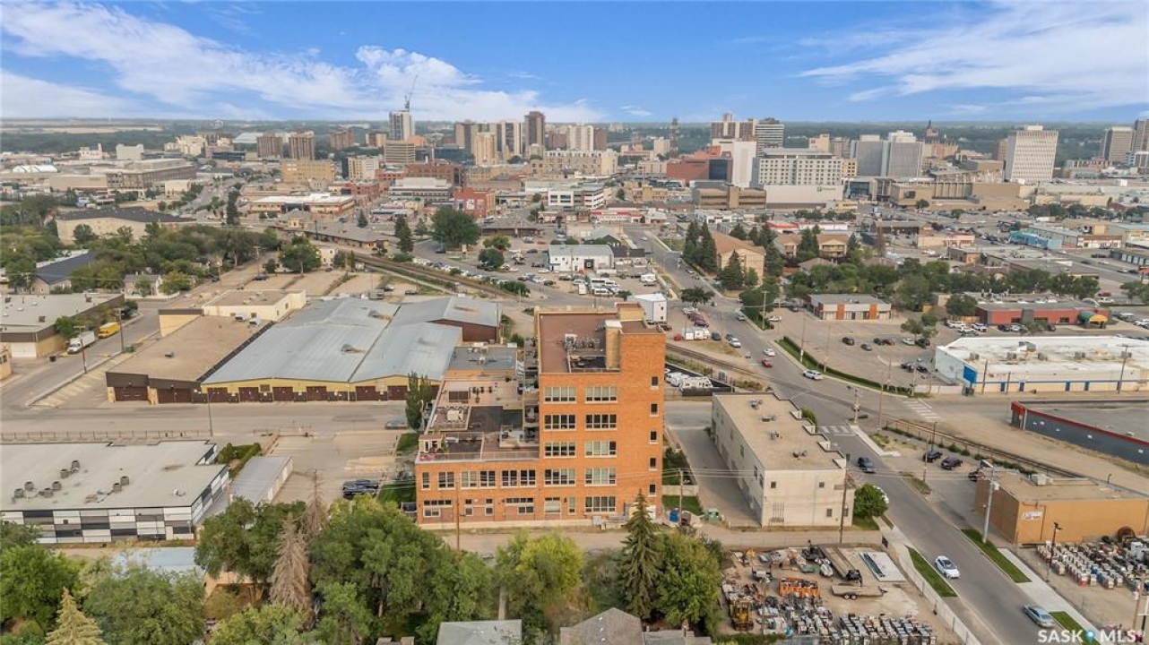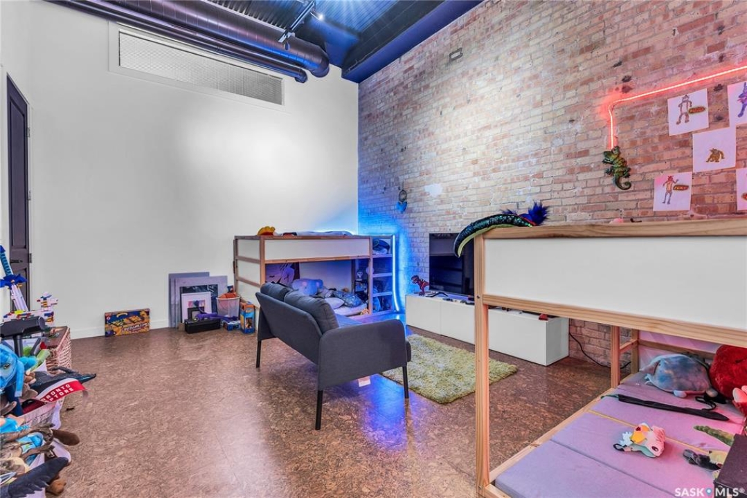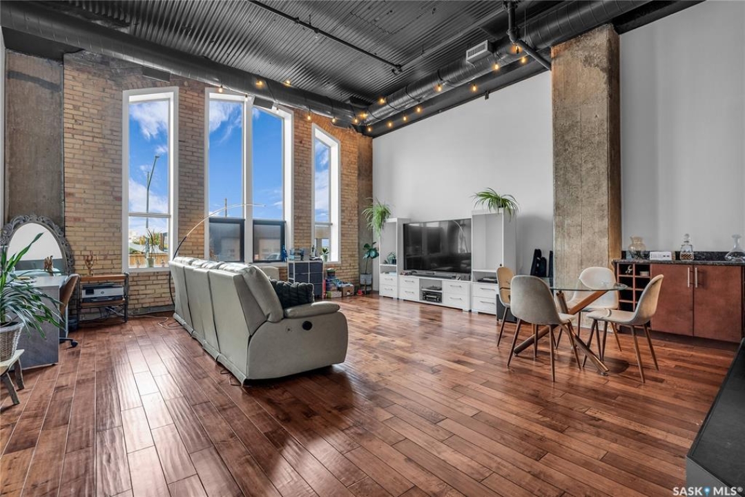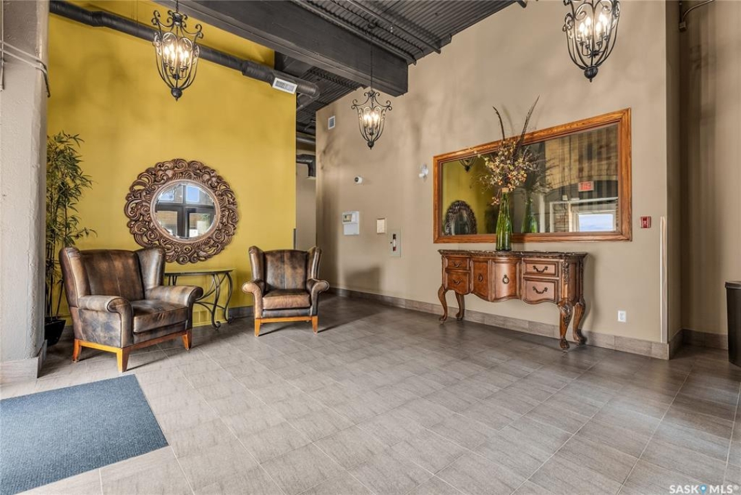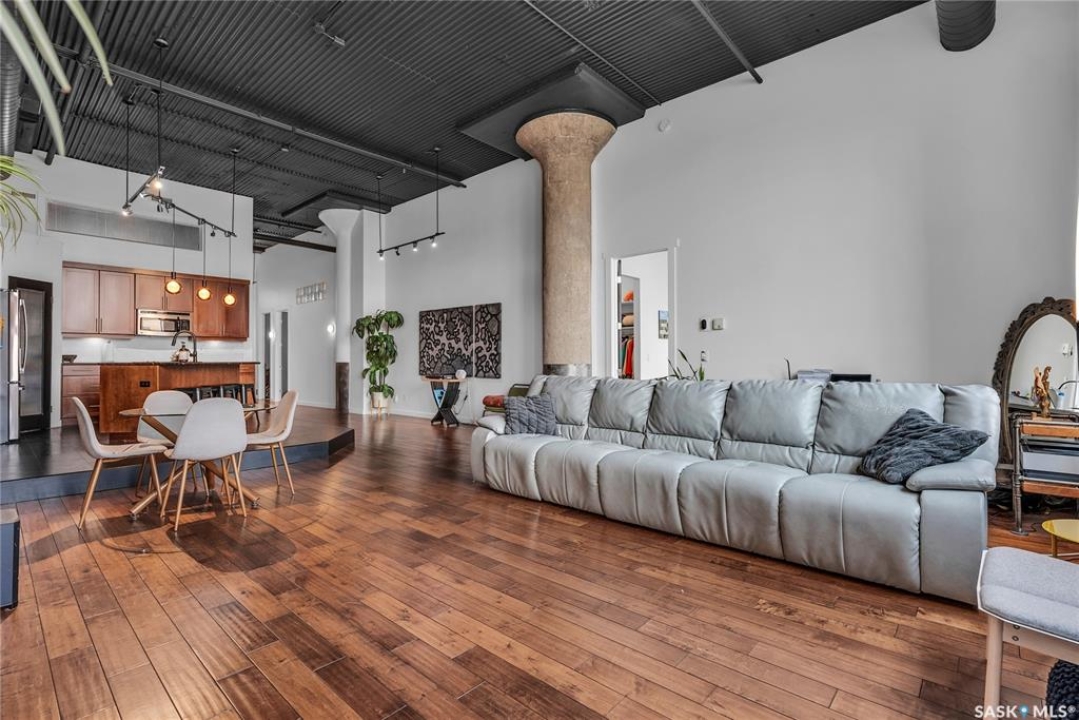Welcome home to 211 Ave D North unit 105. This executive condo delivers an impressive space with over 1900sqft and 14' ceilings. Industrial design and natural textures. The exposed concrete, brick, and steel are softened with the warm colors and natural light. The front entry is set for welcoming you in with an oversized closet and plenty of space to kick off your shoes. Laundry/Utility is found adjacent with more room for storage here and the following leads you to a large secondary bathroom that boasts a shower and oversized soaker tub. The first bedroom is found next with a spacious 13' x 17' dimension & walk-in closet. The kitchen provides an anchor to the main room with an island looking out. Entertain with ease! From prep to serving - there is a generous layout of high-end cabinetry, counter space, and large pantry. East facing windows tease the city skyline and bring in plenty of natural light here. Let your imagination flow with layout placement; dining, living, work or play. The primary retreat is separated from here and shows an oversized bedroom sharing the exterior windows. A walk-in closet has two sides and leads to a customized 3 piece ensuite. There is one above-ground parking stall included that you will find within the gated area and often other options available for rent. As well there is a gym space, and the roof top terrace with lounging chairs, a BBQ included, and incredible views!