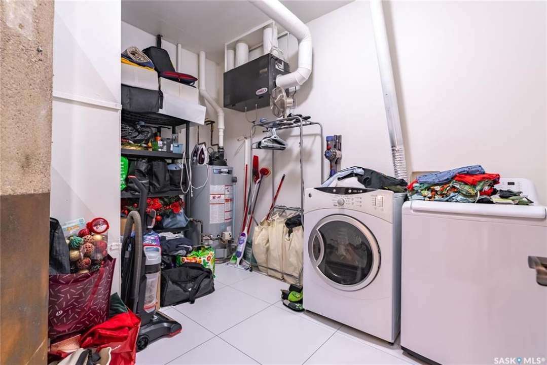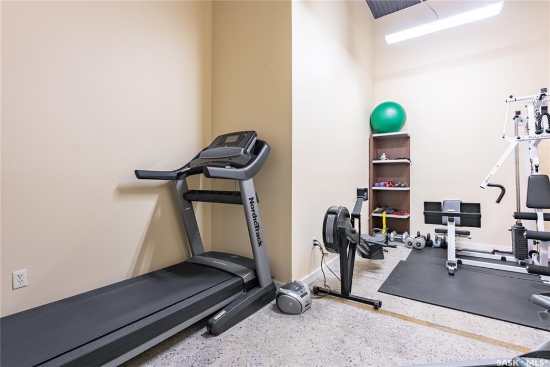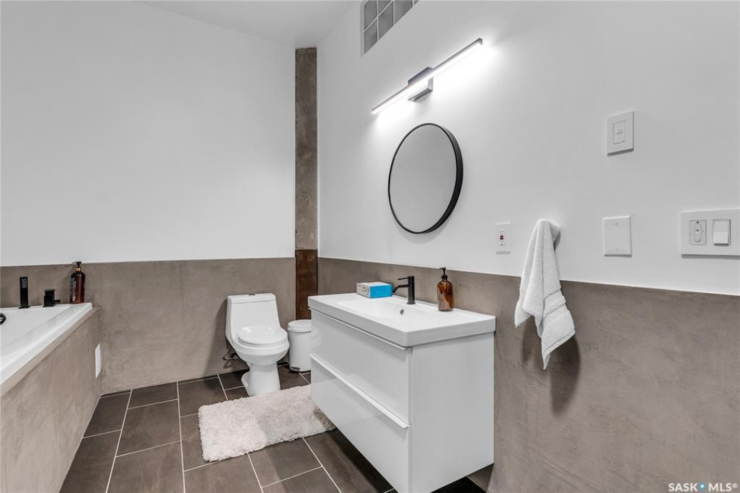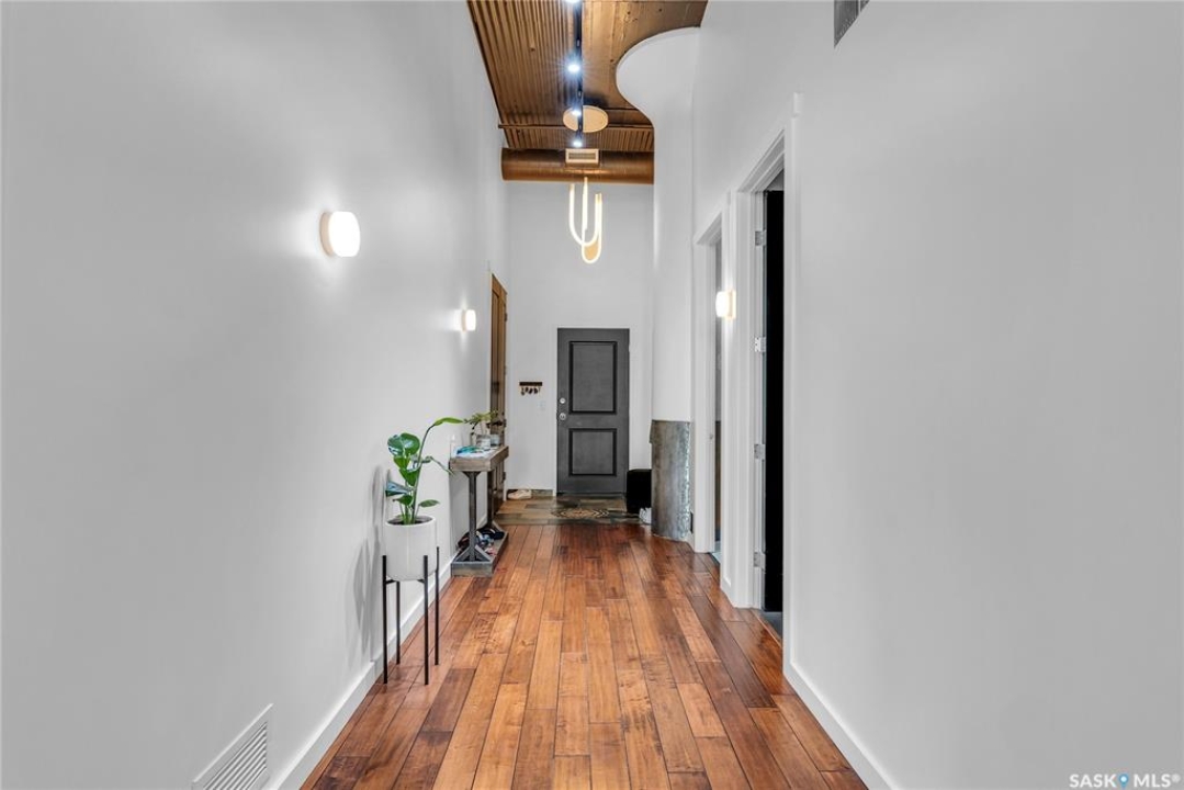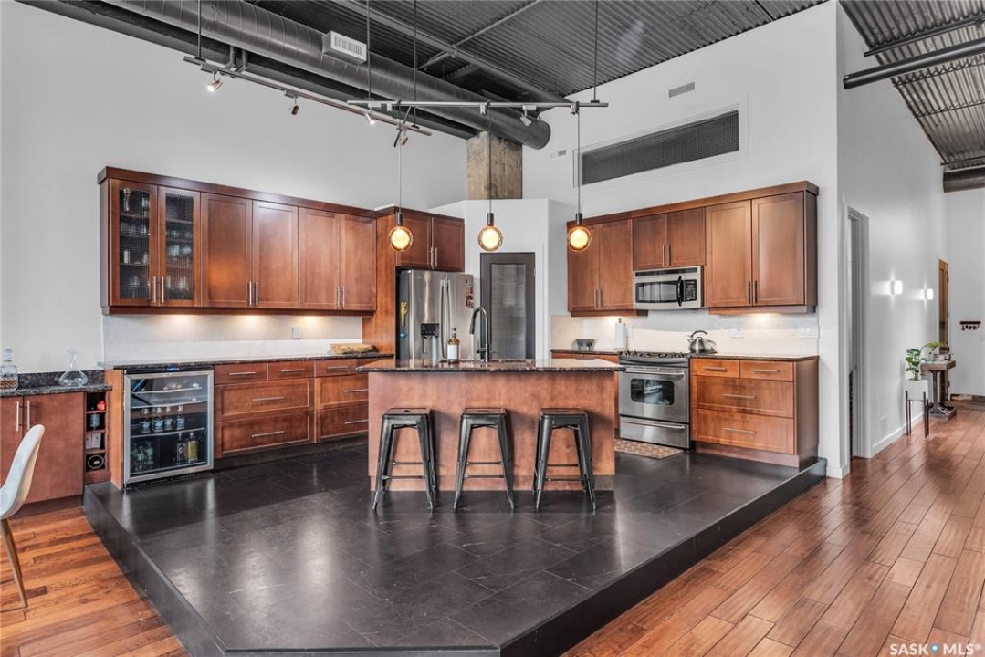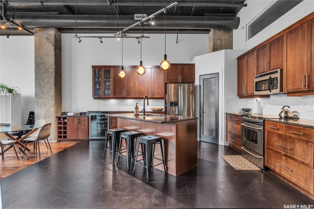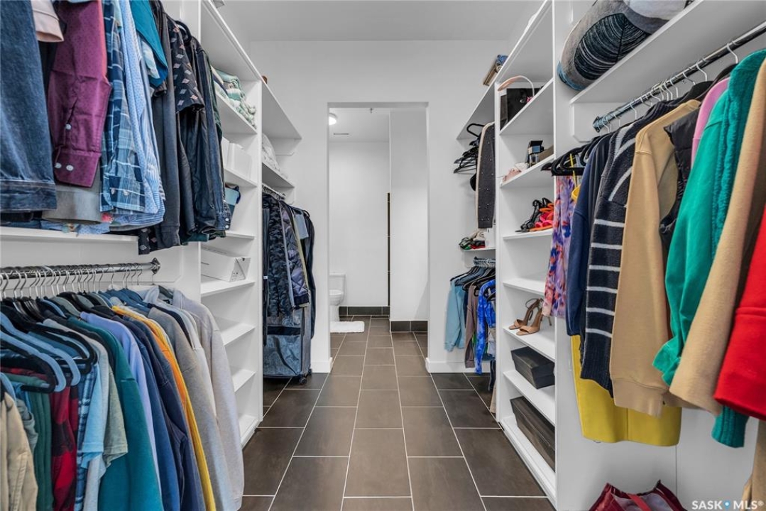Welcome home to 211 Ave D North unit 105. This executive condo delivers an impressive space with over 1900sqft and 14' ceilings. Industrial design and natural textures. The exposed concrete, brick, and steel are softened with the warm colors and natural light. The front entry is set for welcoming you in with an oversized closet and plenty of space to kick off your shoes. Laundry/Utility is found adjacent with more room for storage here and the following leads you to a large secondary bathroom that boasts a shower and oversized soaker tub. The first bedroom is found next with a spacious 13' x 17' dimension & walk-in closet. The kitchen provides an anchor to the main room with an island looking out. Entertain with ease! From prep to serving - there is a generous layout of high-end cabinetry, counter space, and large pantry. East facing windows tease the city skyline and bring in plenty of natural light here. Let your imagination flow with layout placement; dining, living, work or play. The primary retreat is separated from here and shows an oversized bedroom sharing the exterior windows. A walk-in closet has two sides and leads to a customized 3 piece ensuite. There is one above-ground parking stall included that you will find within the gated area and often other options available for rent. As well there is a gym space, and the roof top terrace with lounging chairs, a BBQ included, and incredible views!