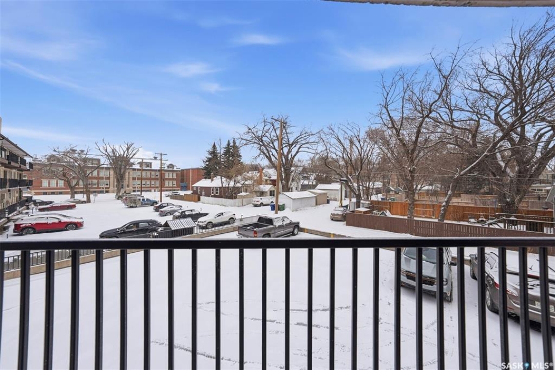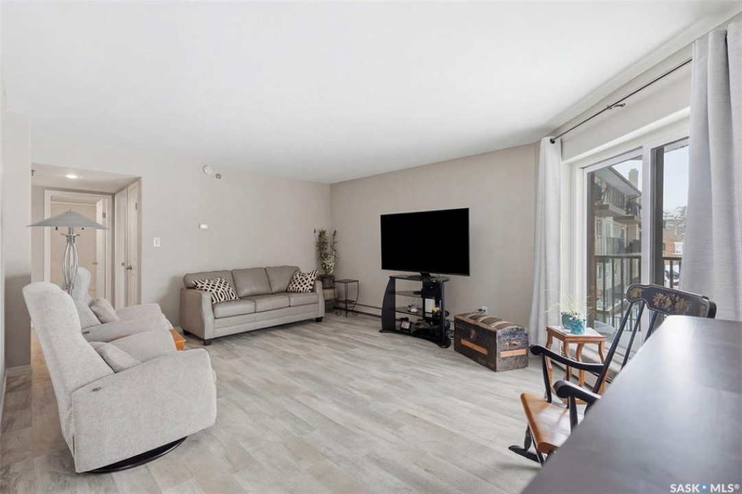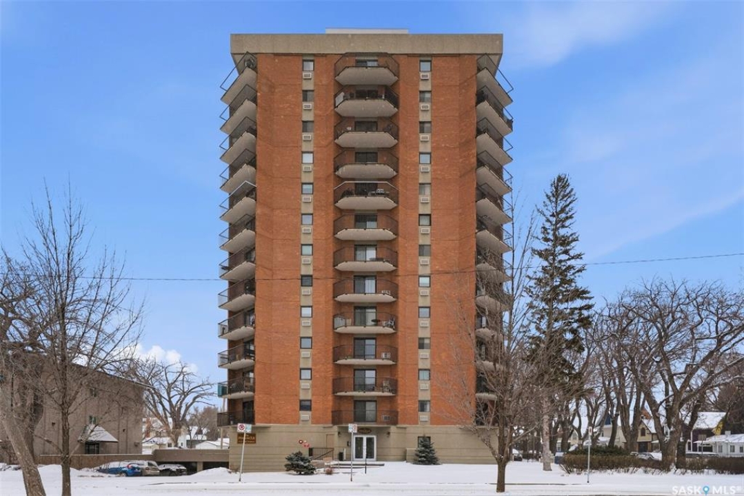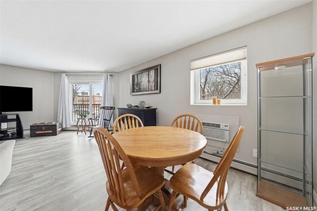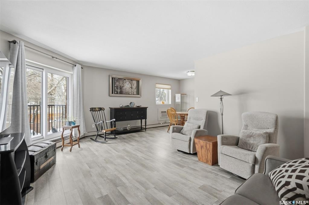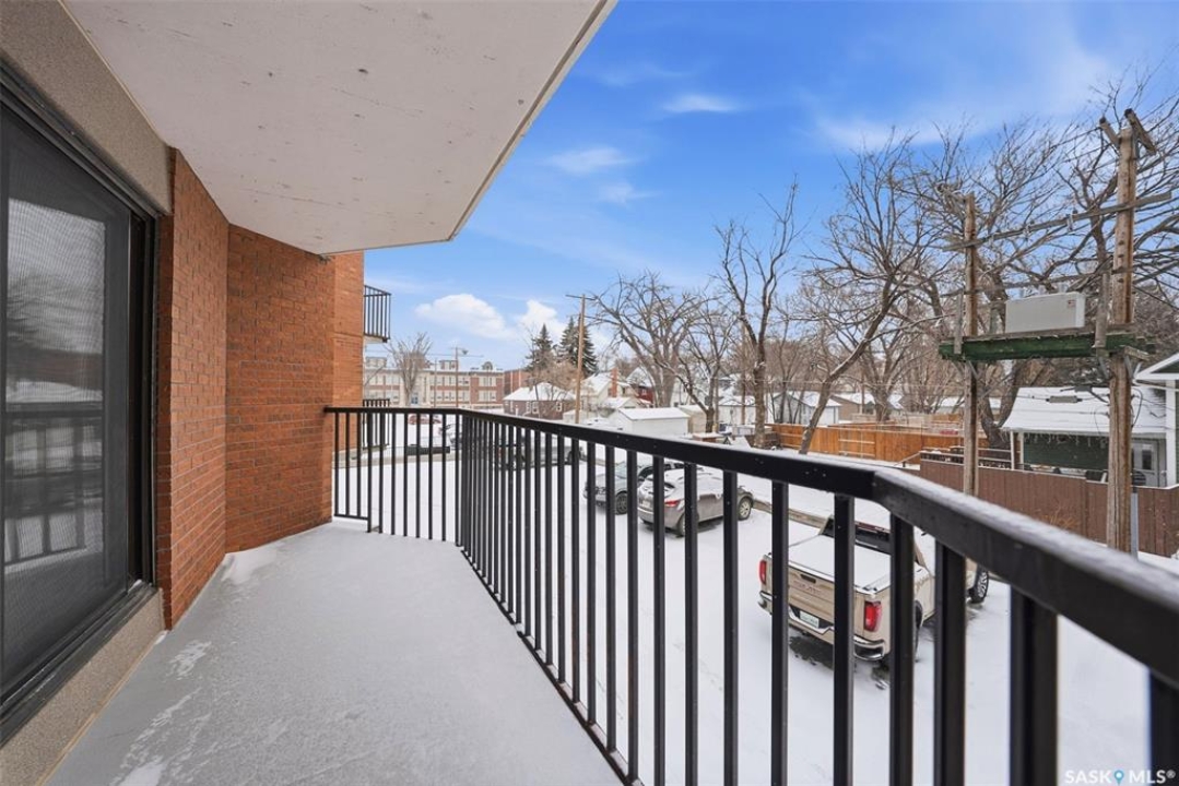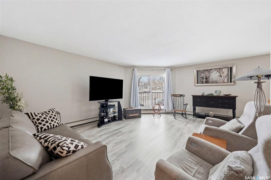 Amazing location on this fully renovated 2-bedroom, 2-bathroom condo in the heart of Nutana! This move-in-ready unit boasts two private balconies and two parking stalls for convenience and outdoor space. This unit has been updated in meticulous detail, including upgraded vinyl flooring and carpet throughout, refreshed lighting, trim, paint, baseboards, and doors. The kitchen has been completely redone with white cabinetry, a modern backsplash, upgraded countertops, and stainless steel appliances. The kitchen flows seamlessly into the dining area and living area. The large living room flows to the east facing deck, perfect for relaxing or entertaining. The primary bedroom is generously sized and includes double closets and a 4-piece en-suite, and its own private deck, while the secondary bedroom is also spacious and adjacent to the full main bathroom. A large laundry and storage room provide practical space for everyday living. Upgraded windows, doors, and blinds enhance the bright, open feel of the home, while a newer wall-mounted air conditioning unit keeps the space comfortable year-round. Residents enjoy building amenities such as a meeting room, gym, and sauna. The quiet, concrete building offers both privacy and durability. This building features recently replaced elevators and a redone entry and foyer. Ideally located just steps from the South Saskatchewan River, this condo is also close to restaurants, local shops, and the University of Saskatchewan. Perfect for those seeking a stylish, turn-key home in a vibrant, convenient neighborhood, this fully renovated Nutana condo is ready for you to move in and enjoy. Don't miss this opportunity to own a modern, updated condo in one of Saskatoon's most desirable areas!
