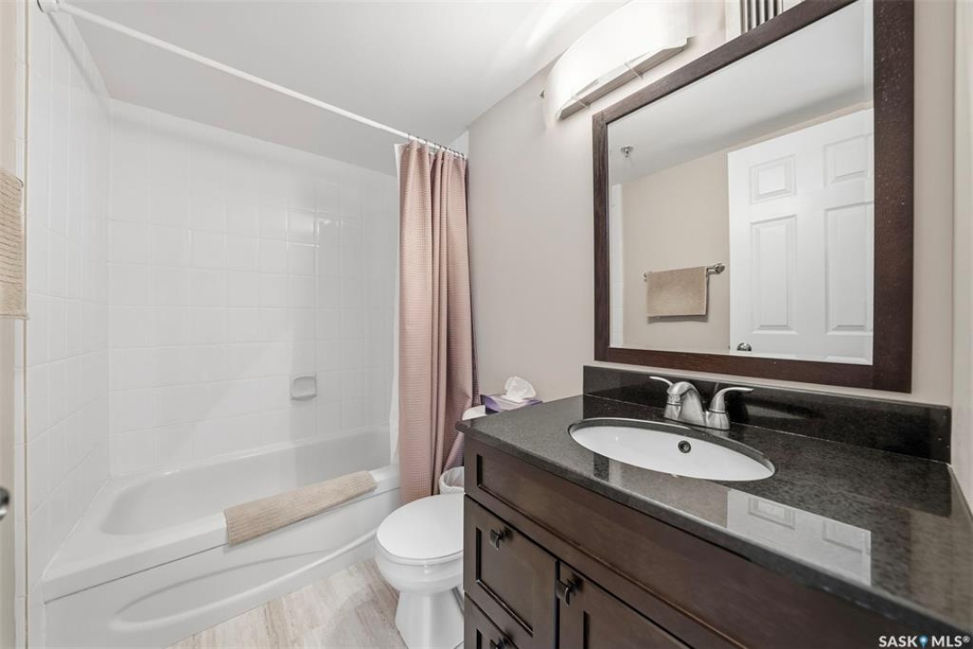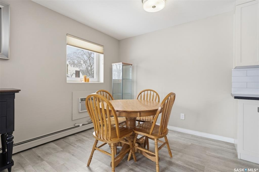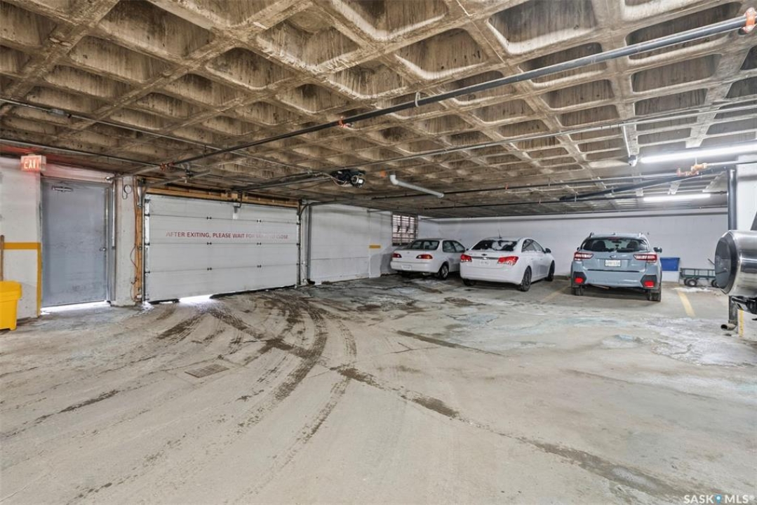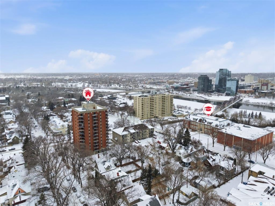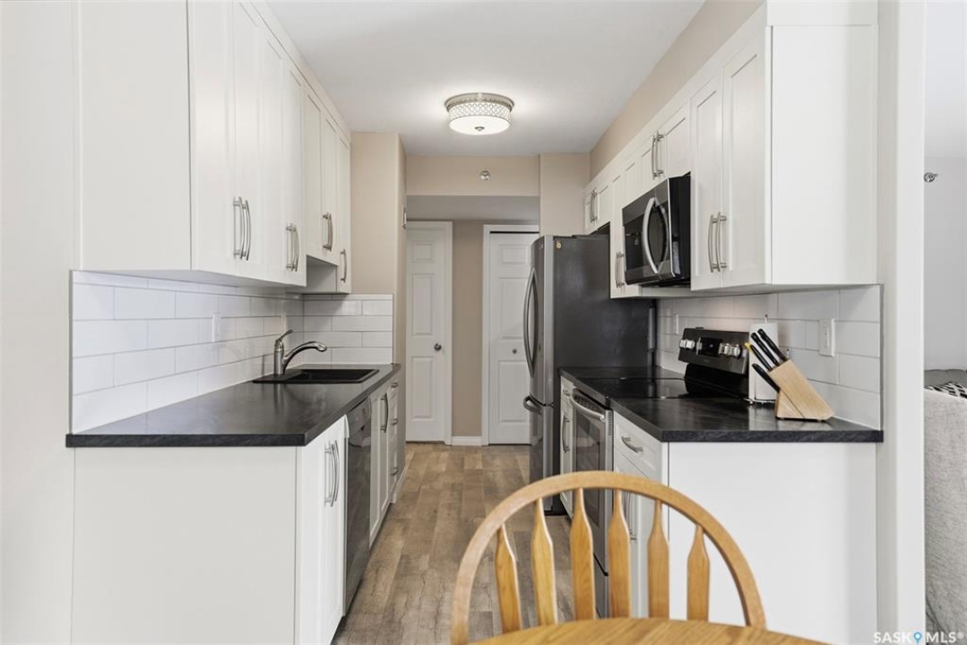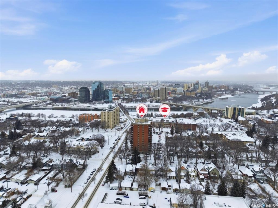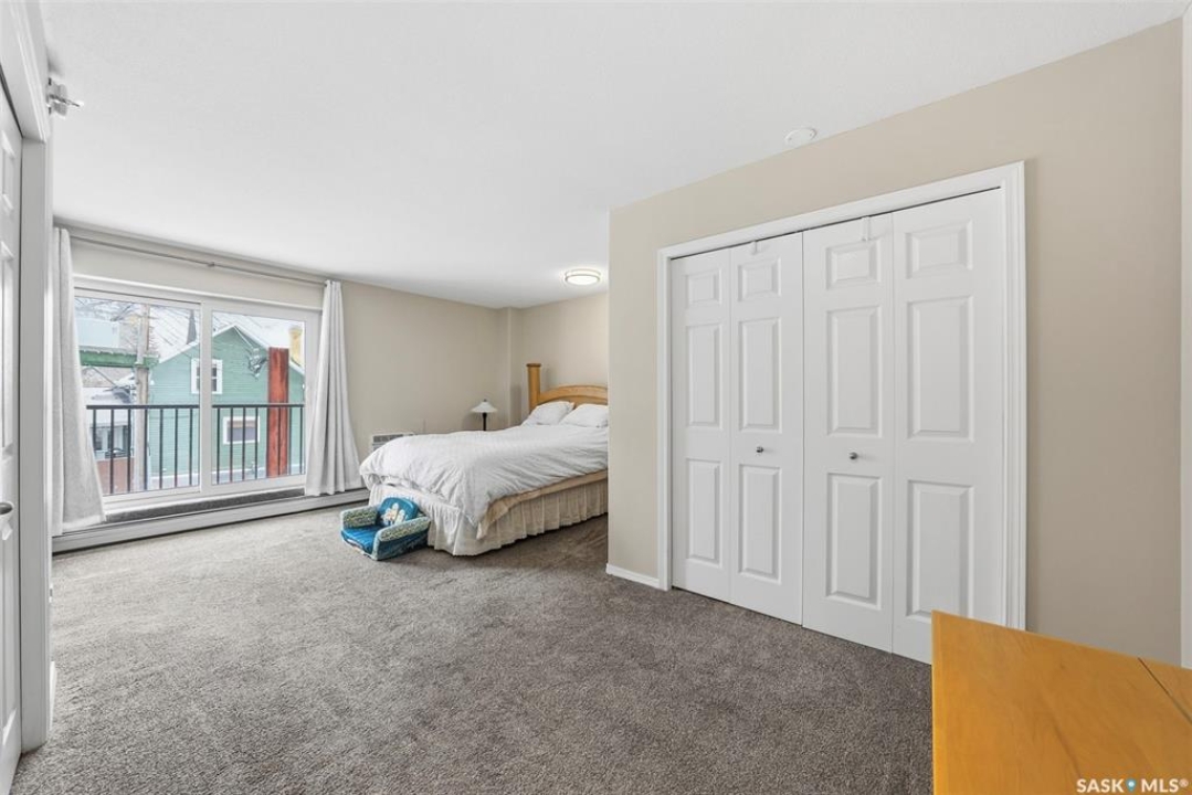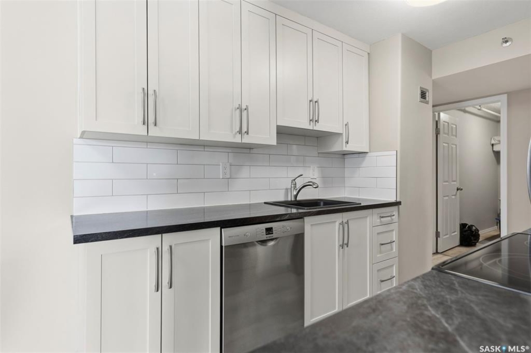 Amazing location on this fully renovated 2-bedroom, 2-bathroom condo in the heart of Nutana! This move-in-ready unit boasts two private balconies and two parking stalls for convenience and outdoor space. This unit has been updated in meticulous detail, including upgraded vinyl flooring and carpet throughout, refreshed lighting, trim, paint, baseboards, and doors. The kitchen has been completely redone with white cabinetry, a modern backsplash, upgraded countertops, and stainless steel appliances. The kitchen flows seamlessly into the dining area and living area. The large living room flows to the east facing deck, perfect for relaxing or entertaining. The primary bedroom is generously sized and includes double closets and a 4-piece en-suite, and its own private deck, while the secondary bedroom is also spacious and adjacent to the full main bathroom. A large laundry and storage room provide practical space for everyday living. Upgraded windows, doors, and blinds enhance the bright, open feel of the home, while a newer wall-mounted air conditioning unit keeps the space comfortable year-round. Residents enjoy building amenities such as a meeting room, gym, and sauna. The quiet, concrete building offers both privacy and durability. This building features recently replaced elevators and a redone entry and foyer. Ideally located just steps from the South Saskatchewan River, this condo is also close to restaurants, local shops, and the University of Saskatchewan. Perfect for those seeking a stylish, turn-key home in a vibrant, convenient neighborhood, this fully renovated Nutana condo is ready for you to move in and enjoy. Don't miss this opportunity to own a modern, updated condo in one of Saskatoon's most desirable areas!