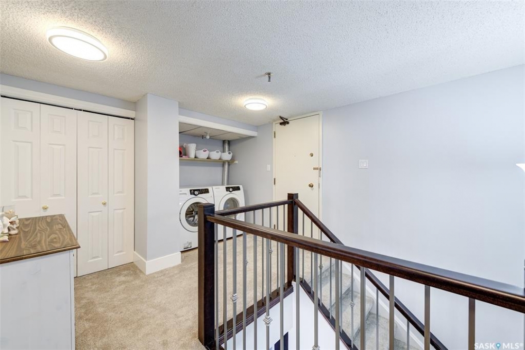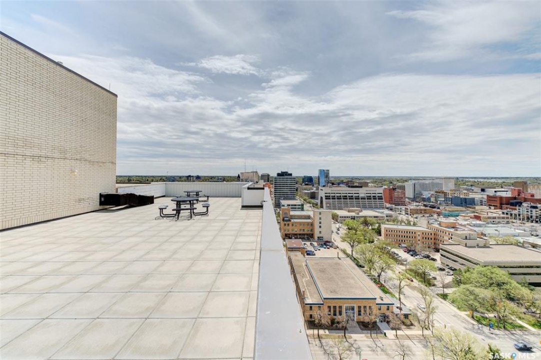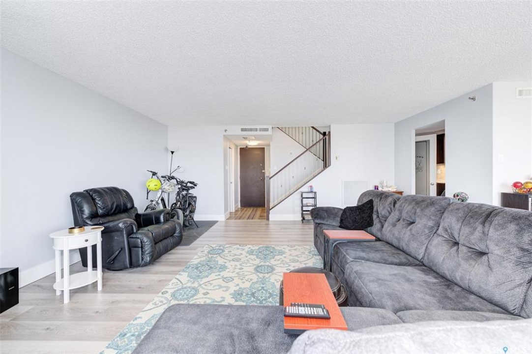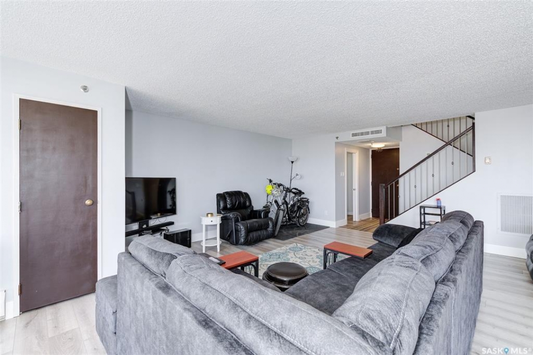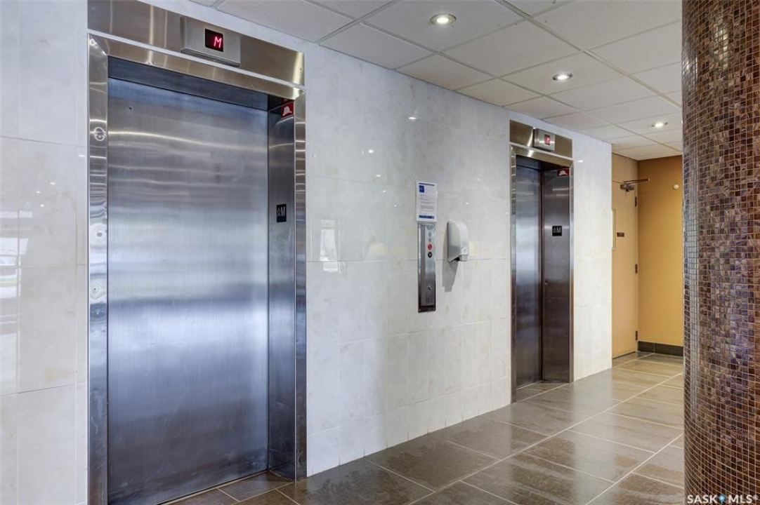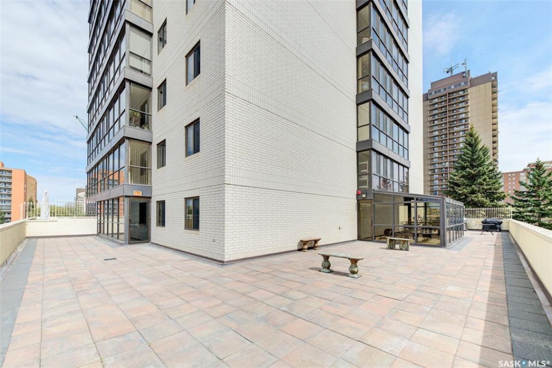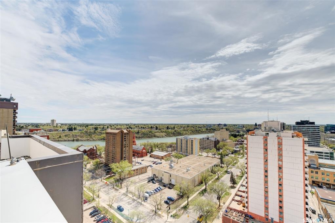 ALL UTILITIES INCLUDED IN CONDO FEES! Incredible price for this amount of Square Footage and building ammenities. Welcome to the Terrace on 5th Ave. Location, location, location!! Within walking distance to River, U of S, hospitals, trendy downtown shops, restaurants and anything else you need! You'll love living in the prestigious Terrace, this solid concrete building features a pool, hot tub, saunas, 4th floor patio, amenities room, guest suite, live-in building manager and stunning Roof Top Balcony-a must see!! Enjoy your summer nights on the roof for beautiful sunsets, Canada Day fireworks, music from the Jazz festival and much more (ask your agent to view it for yourself). This rare and unique 2 storey condo on the 14th and 15th floor. Main level features open concept living and dining room and beautiful dark maple kitchen with granite countertops, tile backsplash and floors, stainless steel appliances and walk-in pantry. Main floor entrance features a large foyer with convenient half bathroom. Main floor also has floor to ceiling windows with custom blinds that open from the top and bottom, allowing for plenty of privacy and stunning North facing City views. The North facing view is perfect for tons of natural light but no direct sunlight, which will keep your home nice and cool, never having to close the blinds during those hot summer days! Open staircase with iron railings leads up to 2nd level with 2nd door exiting to the hall on the 15th floor-perfect for moving in and wheelchair friendly! 2nd floor features large master suite with spa like ensuite. Both bathrooms are renovated with beautiful tile work and trendy barn style doors. Very large 2nd bedroom and laundry closet complete the 2nd level. With rising costs of utilities, you can feel at ease with all those costs built into your condo fees! You have to see this one for yourself, call today! Have your own 2 storey home 14 floors up!