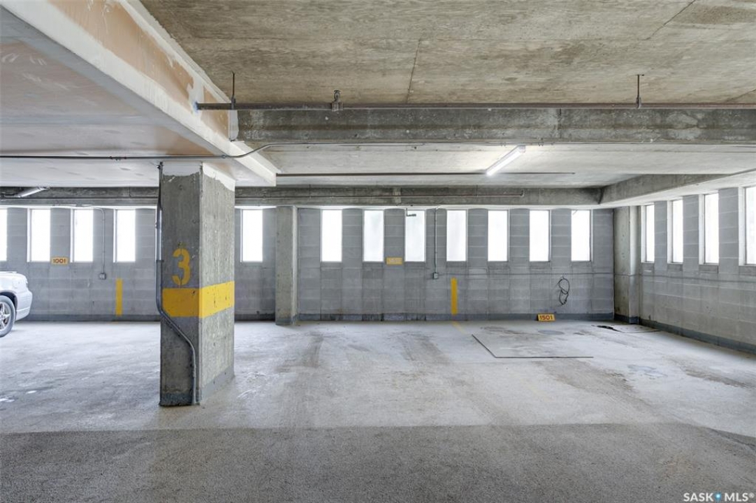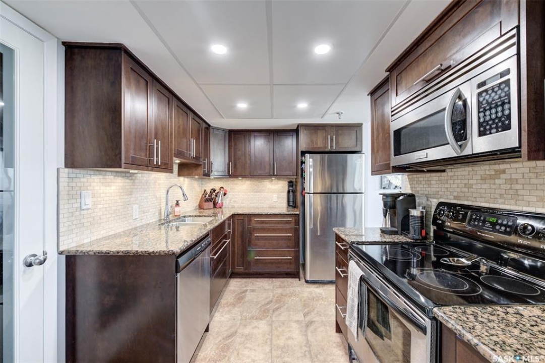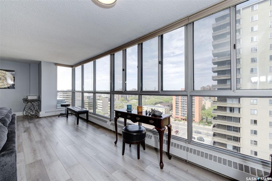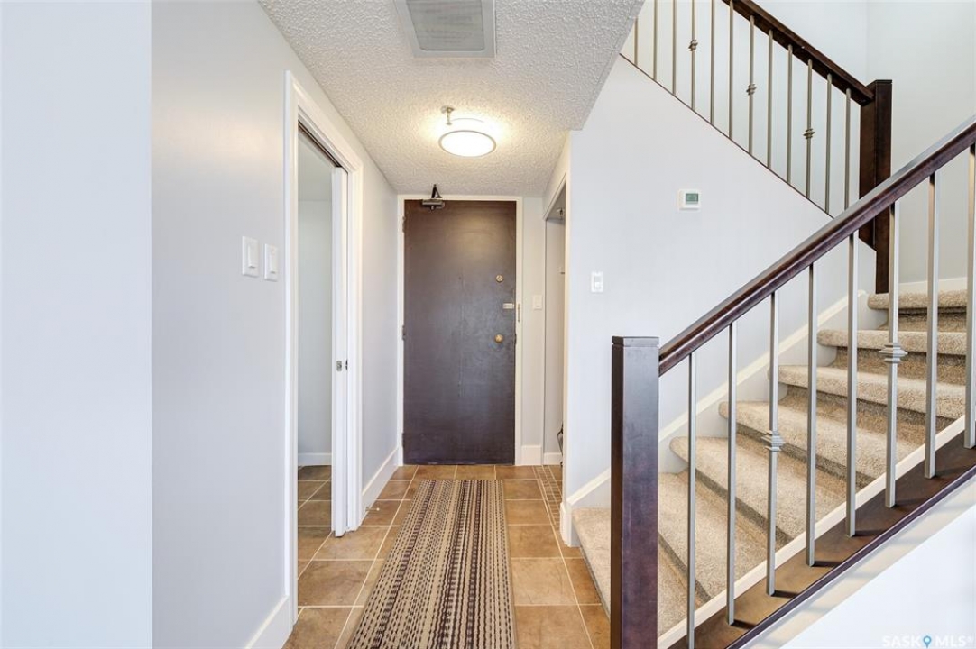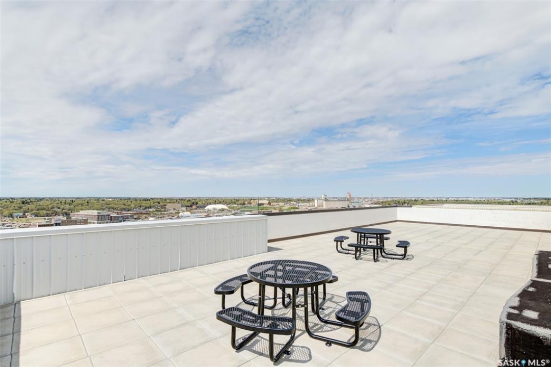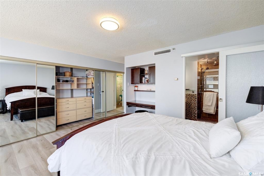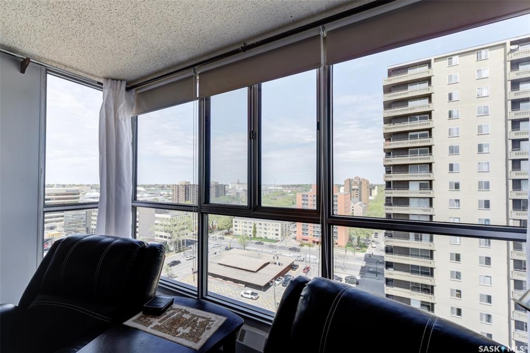 ALL UTILITIES INCLUDED IN CONDO FEES! Incredible price for this amount of Square Footage and building ammenities. Welcome to the Terrace on 5th Ave. Location, location, location!! Within walking distance to River, U of S, hospitals, trendy downtown shops, restaurants and anything else you need! You'll love living in the prestigious Terrace, this solid concrete building features a pool, hot tub, saunas, 4th floor patio, amenities room, guest suite, live-in building manager and stunning Roof Top Balcony-a must see!! Enjoy your summer nights on the roof for beautiful sunsets, Canada Day fireworks, music from the Jazz festival and much more (ask your agent to view it for yourself). This rare and unique 2 storey condo on the 14th and 15th floor. Main level features open concept living and dining room and beautiful dark maple kitchen with granite countertops, tile backsplash and floors, stainless steel appliances and walk-in pantry. Main floor entrance features a large foyer with convenient half bathroom. Main floor also has floor to ceiling windows with custom blinds that open from the top and bottom, allowing for plenty of privacy and stunning North facing City views. The North facing view is perfect for tons of natural light but no direct sunlight, which will keep your home nice and cool, never having to close the blinds during those hot summer days! Open staircase with iron railings leads up to 2nd level with 2nd door exiting to the hall on the 15th floor-perfect for moving in and wheelchair friendly! 2nd floor features large master suite with spa like ensuite. Both bathrooms are renovated with beautiful tile work and trendy barn style doors. Very large 2nd bedroom and laundry closet complete the 2nd level. With rising costs of utilities, you can feel at ease with all those costs built into your condo fees! You have to see this one for yourself, call today! Have your own 2 storey home 14 floors up!
