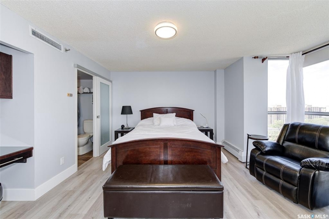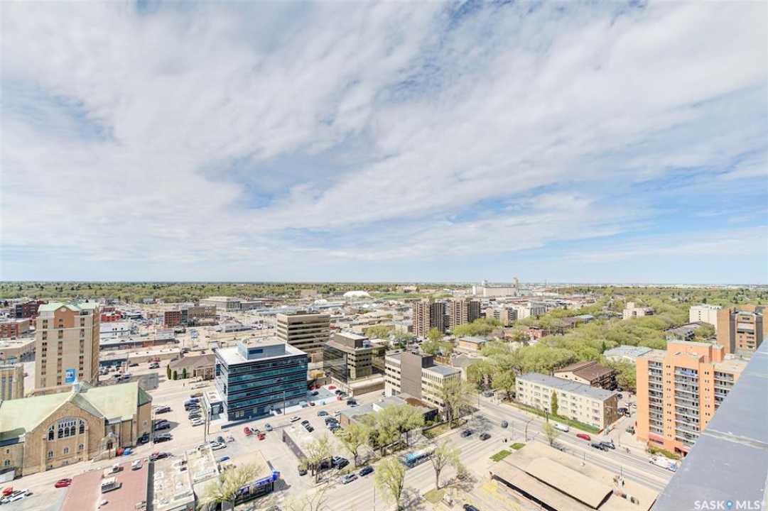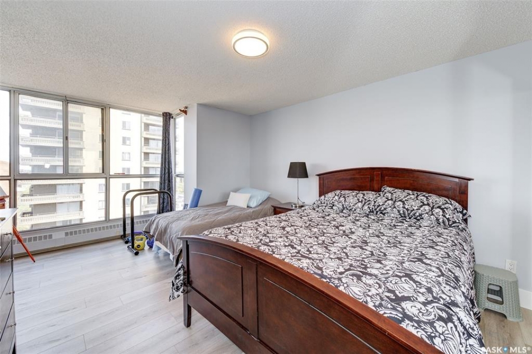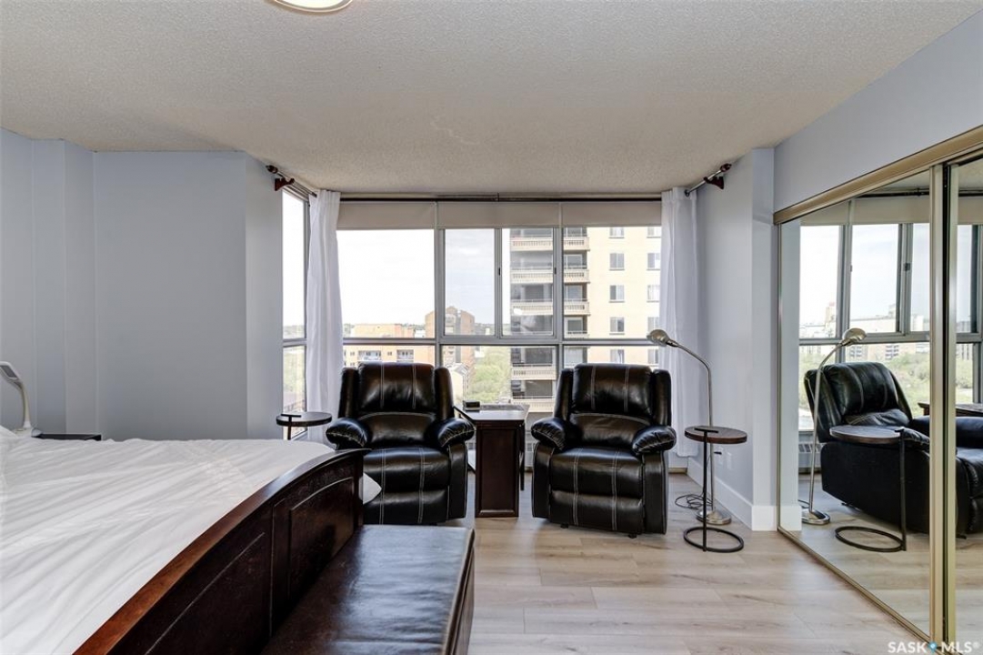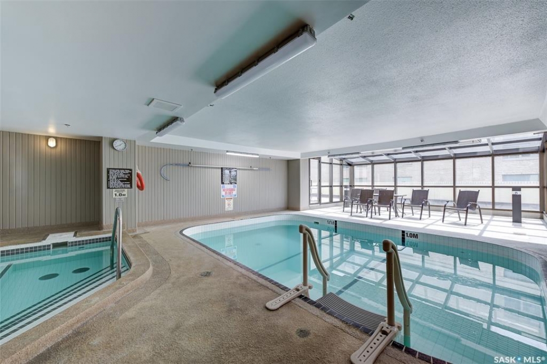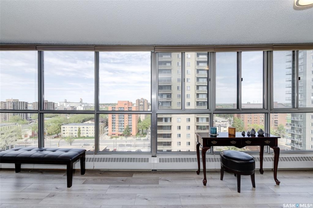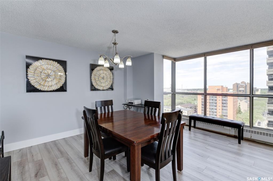 ALL UTILITIES INCLUDED IN CONDO FEES! Incredible price for this amount of Square Footage and building ammenities. Welcome to the Terrace on 5th Ave. Location, location, location!! Within walking distance to River, U of S, hospitals, trendy downtown shops, restaurants and anything else you need! You'll love living in the prestigious Terrace, this solid concrete building features a pool, hot tub, saunas, 4th floor patio, amenities room, guest suite, live-in building manager and stunning Roof Top Balcony-a must see!! Enjoy your summer nights on the roof for beautiful sunsets, Canada Day fireworks, music from the Jazz festival and much more (ask your agent to view it for yourself). This rare and unique 2 storey condo on the 14th and 15th floor. Main level features open concept living and dining room and beautiful dark maple kitchen with granite countertops, tile backsplash and floors, stainless steel appliances and walk-in pantry. Main floor entrance features a large foyer with convenient half bathroom. Main floor also has floor to ceiling windows with custom blinds that open from the top and bottom, allowing for plenty of privacy and stunning North facing City views. The North facing view is perfect for tons of natural light but no direct sunlight, which will keep your home nice and cool, never having to close the blinds during those hot summer days! Open staircase with iron railings leads up to 2nd level with 2nd door exiting to the hall on the 15th floor-perfect for moving in and wheelchair friendly! 2nd floor features large master suite with spa like ensuite. Both bathrooms are renovated with beautiful tile work and trendy barn style doors. Very large 2nd bedroom and laundry closet complete the 2nd level. With rising costs of utilities, you can feel at ease with all those costs built into your condo fees! You have to see this one for yourself, call today! Have your own 2 storey home 14 floors up!