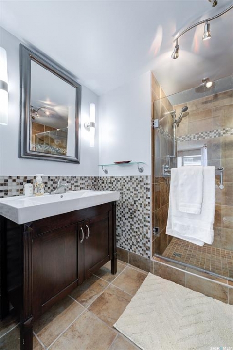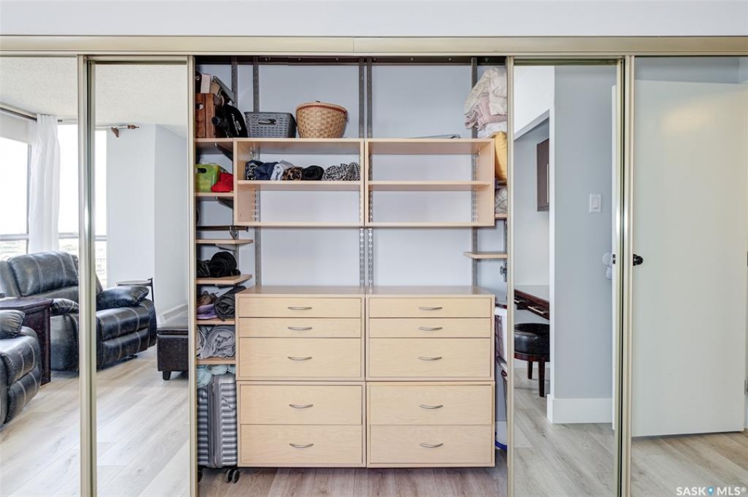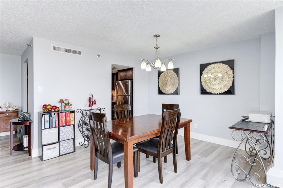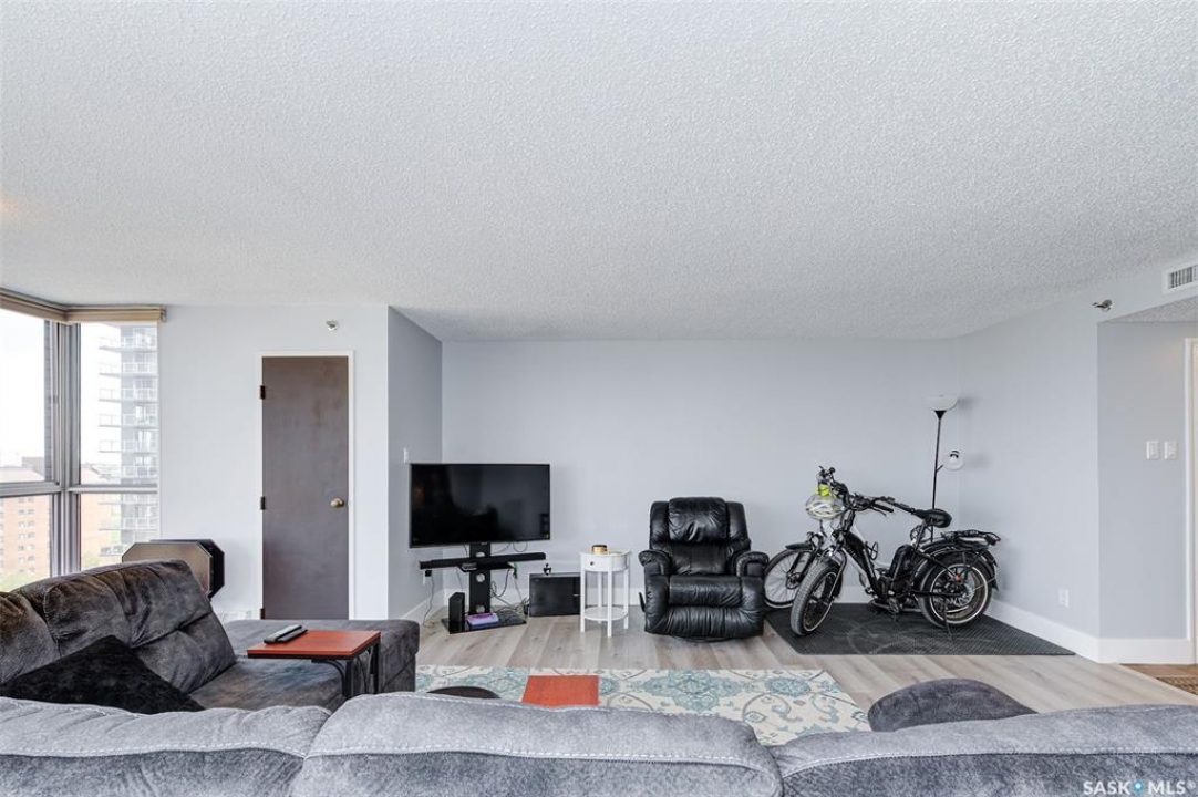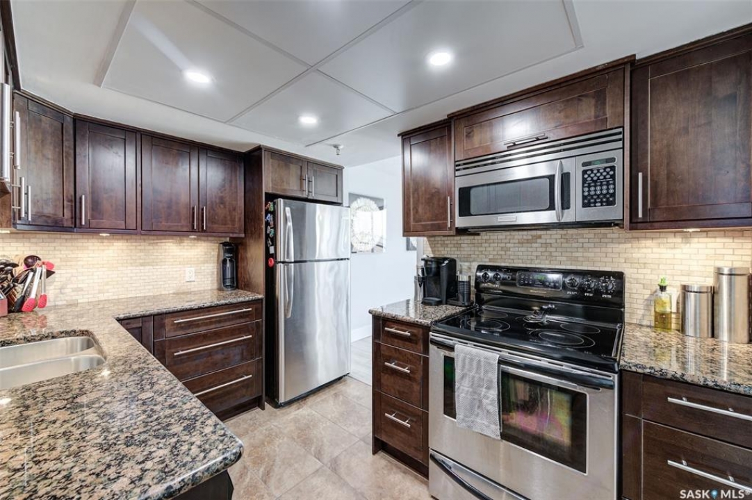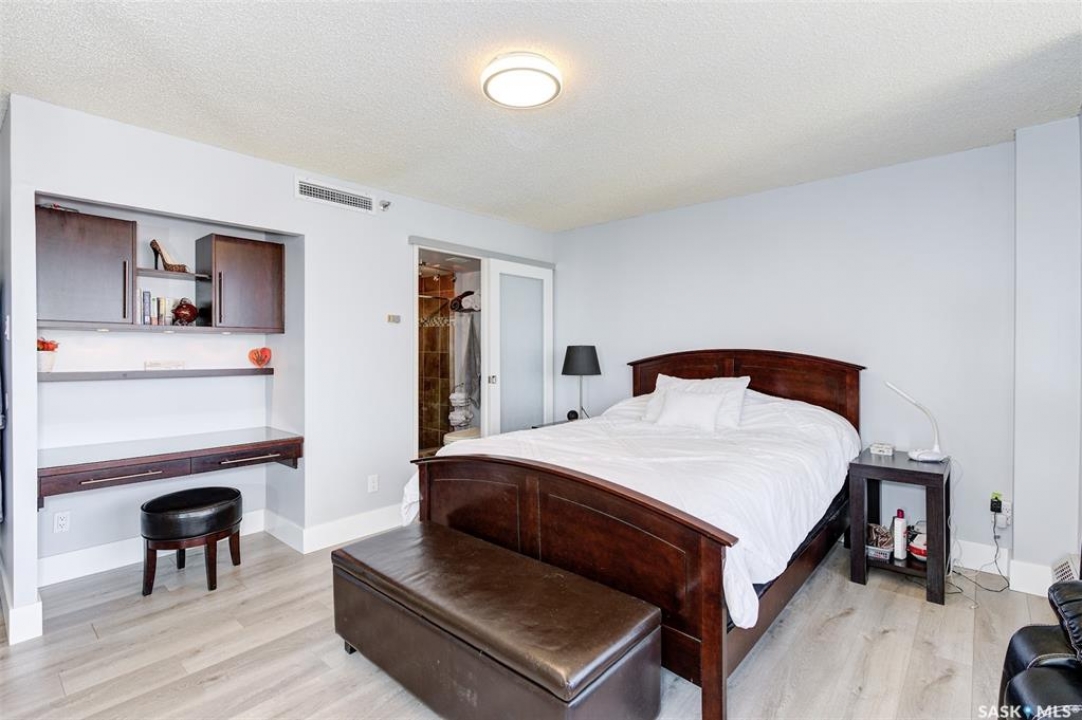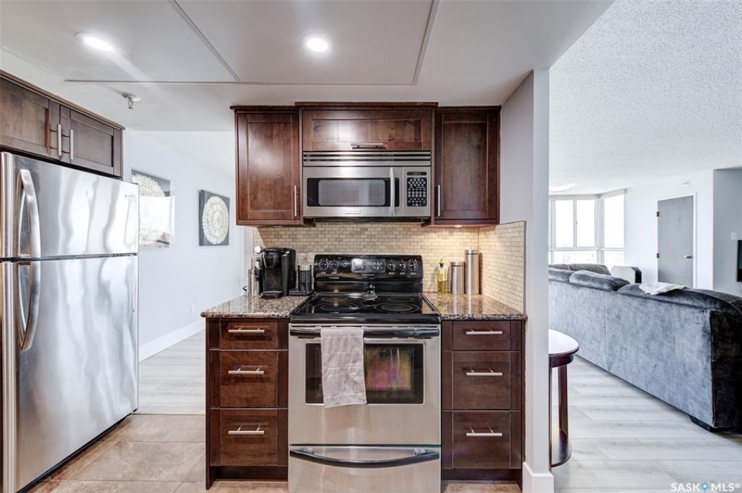 ALL UTILITIES INCLUDED IN CONDO FEES! Incredible price for this amount of Square Footage and building ammenities. Welcome to the Terrace on 5th Ave. Location, location, location!! Within walking distance to River, U of S, hospitals, trendy downtown shops, restaurants and anything else you need! You'll love living in the prestigious Terrace, this solid concrete building features a pool, hot tub, saunas, 4th floor patio, amenities room, guest suite, live-in building manager and stunning Roof Top Balcony-a must see!! Enjoy your summer nights on the roof for beautiful sunsets, Canada Day fireworks, music from the Jazz festival and much more (ask your agent to view it for yourself). This rare and unique 2 storey condo on the 14th and 15th floor. Main level features open concept living and dining room and beautiful dark maple kitchen with granite countertops, tile backsplash and floors, stainless steel appliances and walk-in pantry. Main floor entrance features a large foyer with convenient half bathroom. Main floor also has floor to ceiling windows with custom blinds that open from the top and bottom, allowing for plenty of privacy and stunning North facing City views. The North facing view is perfect for tons of natural light but no direct sunlight, which will keep your home nice and cool, never having to close the blinds during those hot summer days! Open staircase with iron railings leads up to 2nd level with 2nd door exiting to the hall on the 15th floor-perfect for moving in and wheelchair friendly! 2nd floor features large master suite with spa like ensuite. Both bathrooms are renovated with beautiful tile work and trendy barn style doors. Very large 2nd bedroom and laundry closet complete the 2nd level. With rising costs of utilities, you can feel at ease with all those costs built into your condo fees! You have to see this one for yourself, call today! Have your own 2 storey home 14 floors up!