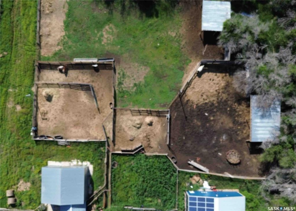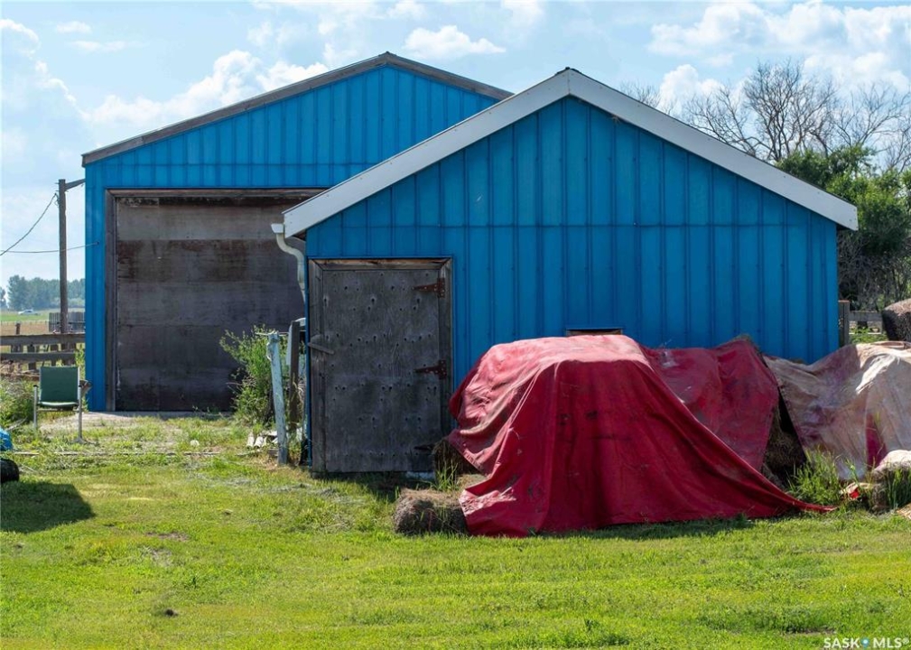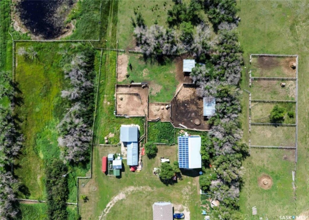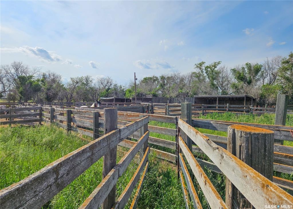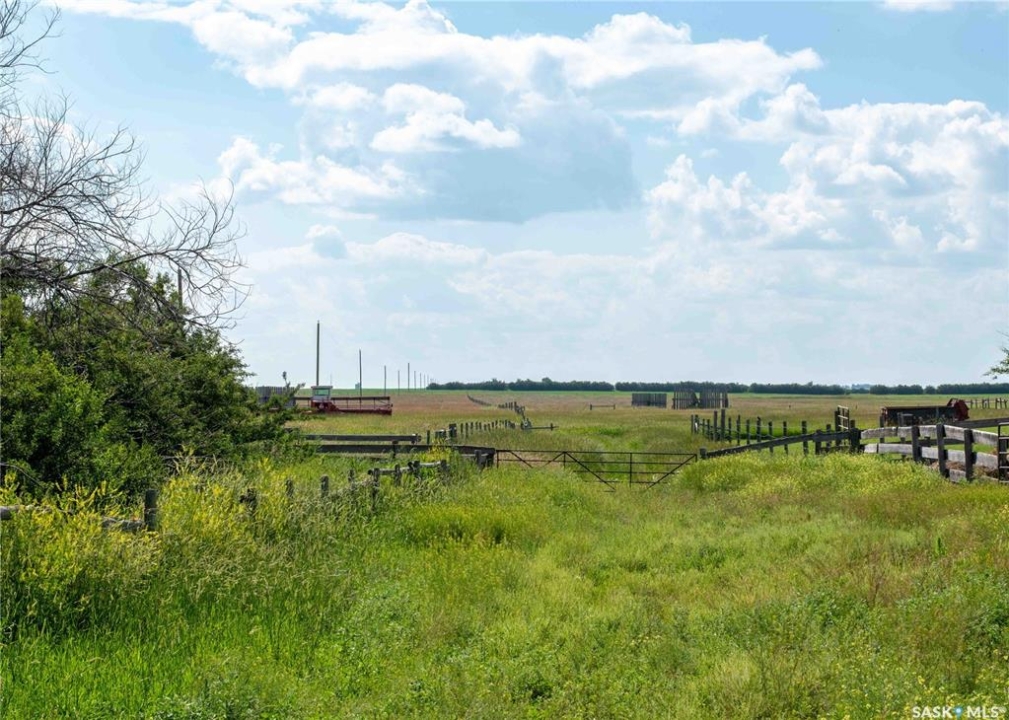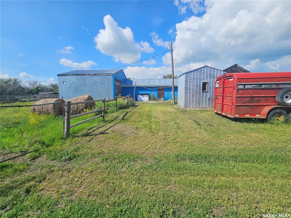Located just minutes south of Milden and right on the pavement, this versatile quarter section features two homes, multiple outbuildings, and everything you need for a mixed farm or hobby operation. The main home, built in 2008, offers 1,788 sq ft of well designed living space on a fully finished ICF basement, along with an attached double garage. A heated mudroom/breezeway connects the home and garage—perfect for farm dogs, boots, and outerwear. Inside, a spacious kitchen with island and pantry flows into a generous dining area with garden doors leading to a two tier deck. The front door opens to a small balcony, adding another charming outdoor space. Down the hall is a 4 pc bath, and three bedrooms, one of which is the primary suite with its own 3 pc ensuite. A convenient main floor laundry with 2 pc bath is located just off the kitchen. The lower level features in floor heat, two additional bedrooms, a 4 pc bath, and a large family room. -- A separate 864 sq ft residence on a full basement offers two bedrooms, one bath, and its own garage. With its own power meter, it's an excellent option for rental income, hired help, or extended family. -- West of the home sits a 36' x 50' heated shop with an overhead door large enough for a semi. The exterior is equipped with 63 solar panels that feed back to the grid, offsetting roughly 10 months of electricity costs each year. A second smaller shop with overhead door connects to a compact calving barn with hay storage and direct access to the corrals. Additional structures include multiple sheds, a well house, a small greenhouse, run in shelters, and bins. The property has two wells and four livestock watering bowls. The quarter is partially fenced, with much of the land currently in hay production. Smaller pastures near the yard are ideal for keeping livestock close to the handling facilities and shelters.