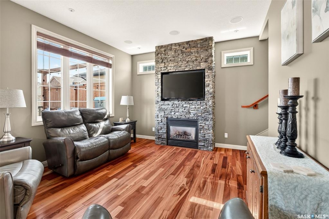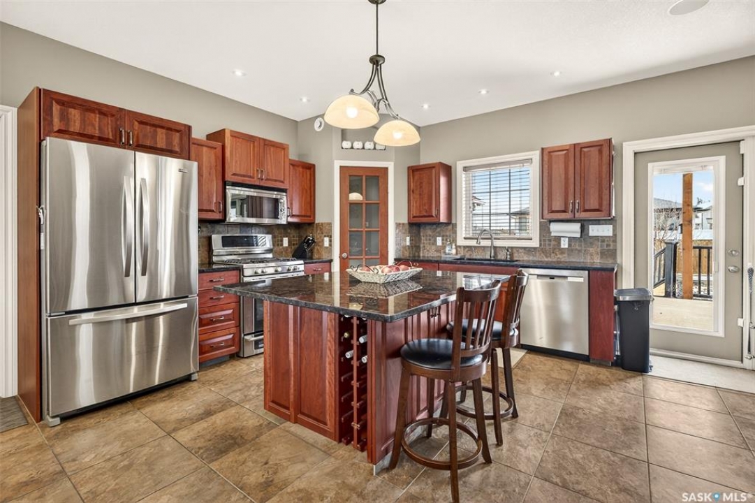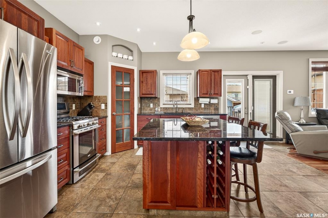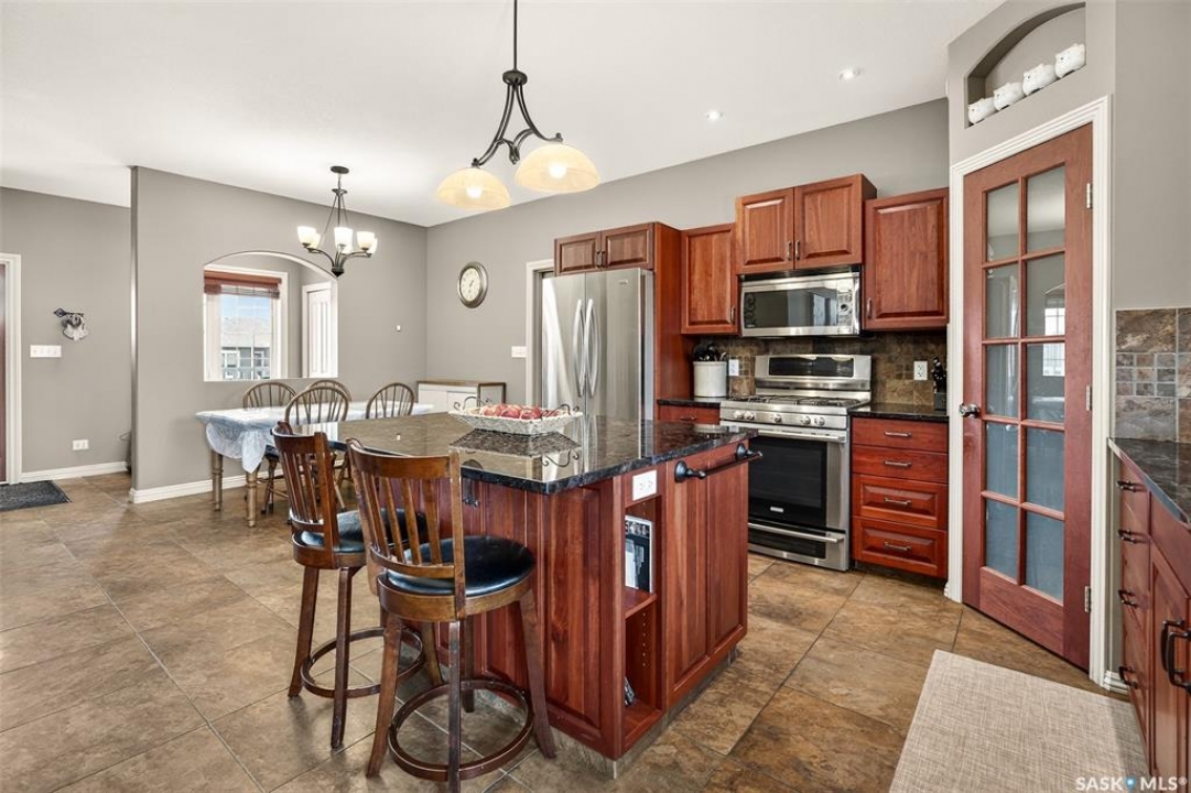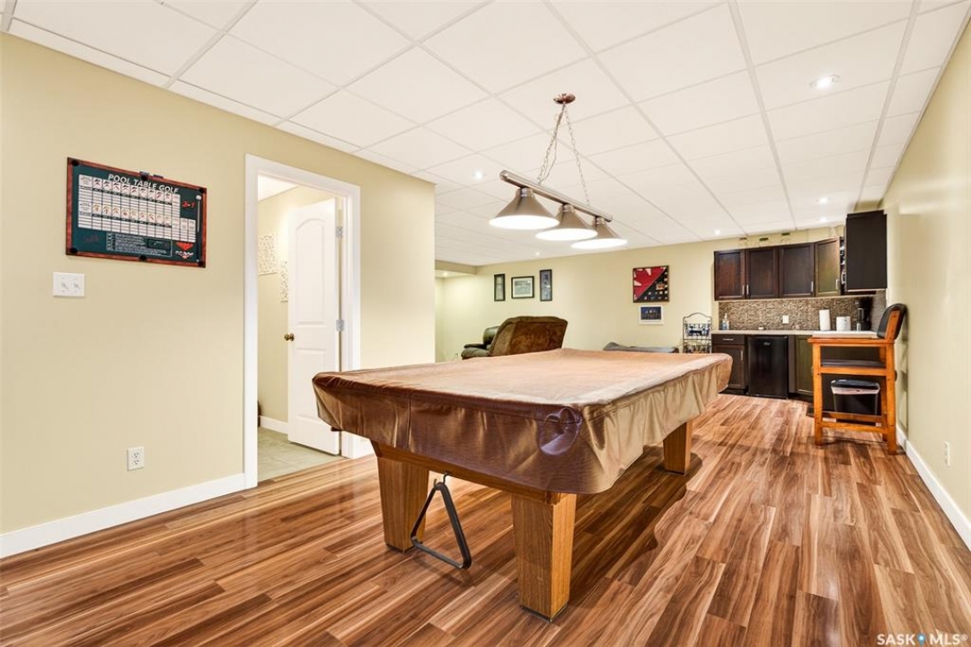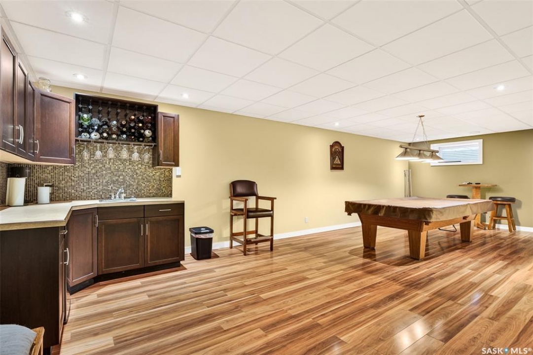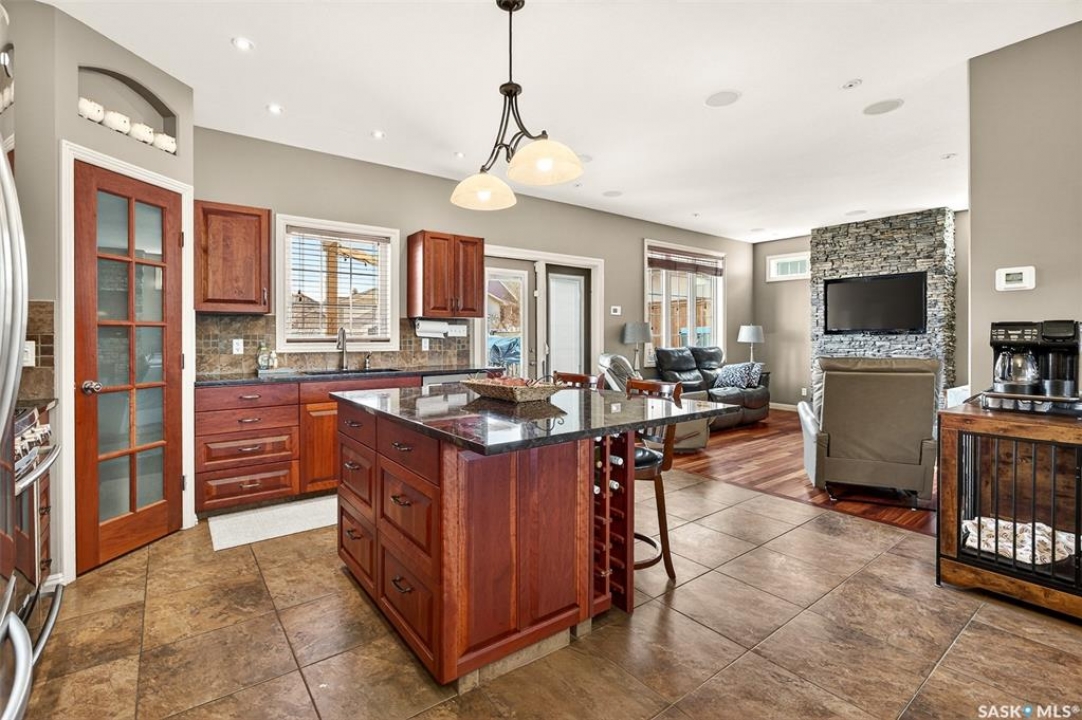 WHAT. A. BEAUTIFUL. HOME. CUSTOM DESIGNED TWO-STOREY within walking distance to the new JOINT-USE ELEMENTARY SCHOOL. An impressive layout, offering 3 BEDROOMS UP, plus a bonus bedroom/flex/office space on the main level. Features DIRECT-ENTRY, IN-FLOOR HEATED 24' x 40' GARAGE, with dedicated WORKSHOP/GYM area INCLUDING a 2-PIECE BATH. The ‘park-like' outdoor living space is equally remarkable, highlighted by a lower-level BRICK PATIO with a built-in cooking centre and concrete island, complete with a natural gas BBQ and an AUTHENTIC PIZZA OVEN crafted with imported Italian masonry. The home boasts excellent curb appeal with durable HARDIE fibre-cement siding, a welcoming COVERED FRONT PORCH, and a spacious front entry that opens into a bright, open-concept living, dining, & kitchen area. The kitchen showcases custom cherry wood cabinetry, GRANITE countertops, and a convenient corner pantry. Elegant tile (IN-FLOOR HEAT under main floor tile) and Brazilian TIGERWOOD flooring flow throughout most of the main and second levels. Upstairs, you'll find a versatile BONUS SPACE, with dedicated 2nd FLOOR LAUNDRY room. A luxurious PRIMARY SUITE with a spa-like ENSUITE and spacious WALK-IN CLOSET rounds out this large 2nd level. The fully developed lower level offers cozy IN-FLOOR HEATING and a generous family/rec room complete with a wet bar and pool table (included), perfect for entertaining and hosting. Completing the home is a built-in audio system with smartphone compatibility, featuring integrated audio both inside and outdoors. A ONE-OF-A-KIND PROPERTY. Priced to sell. Book your viewing today!