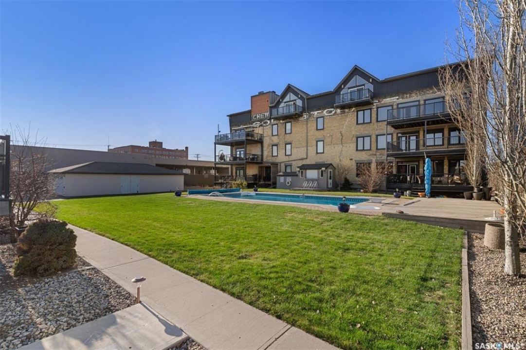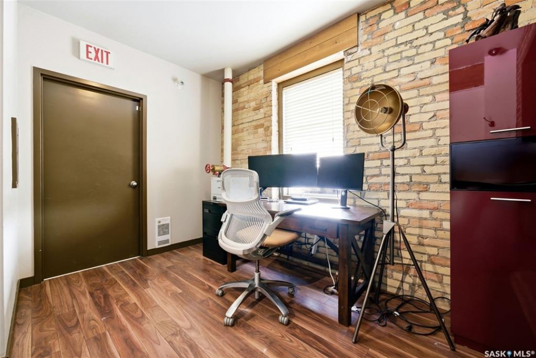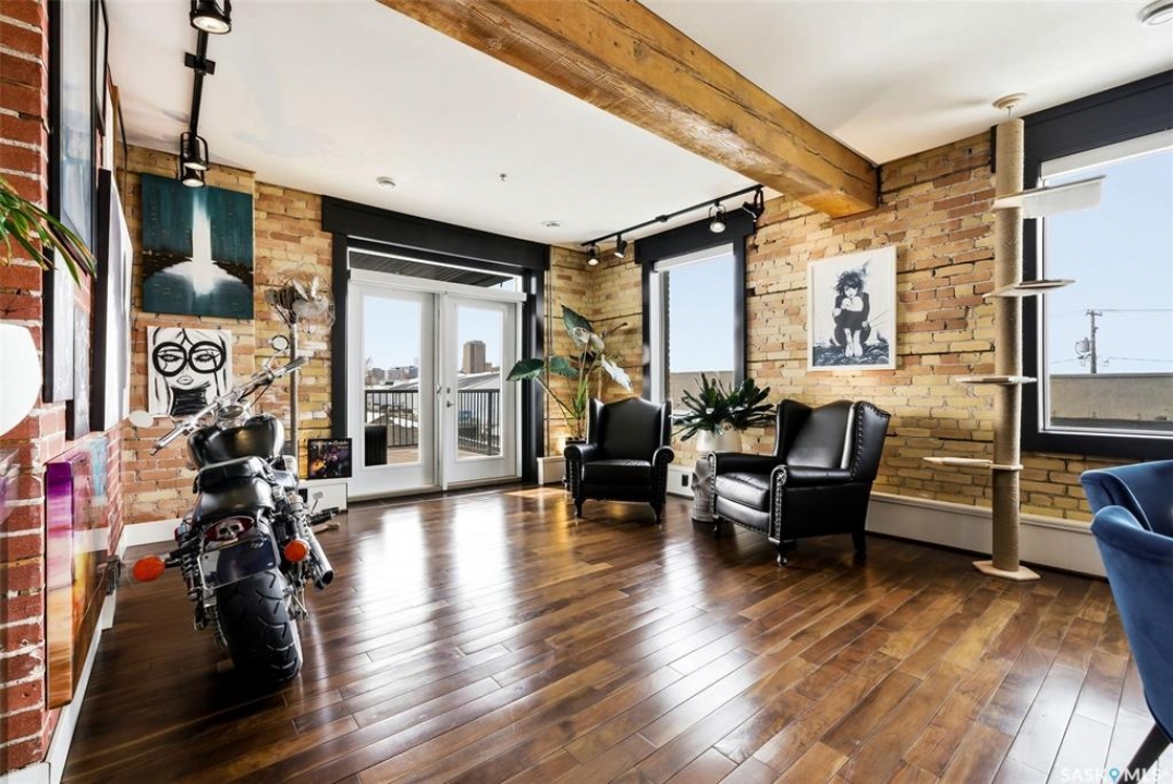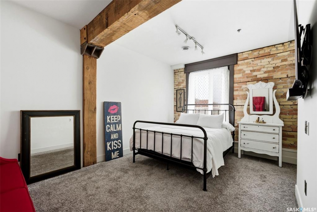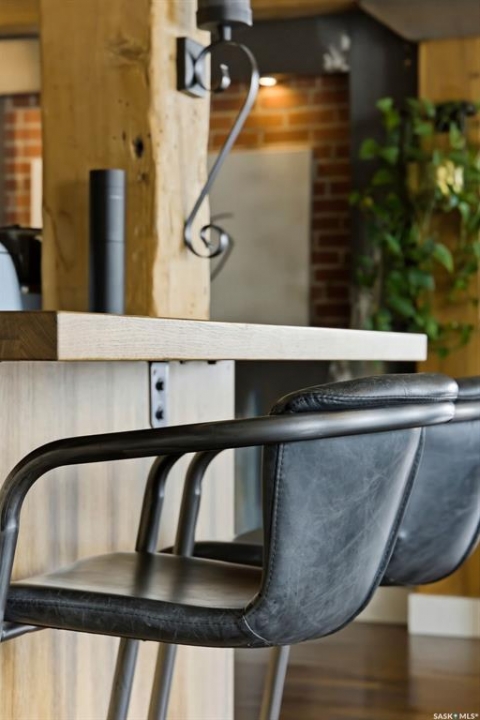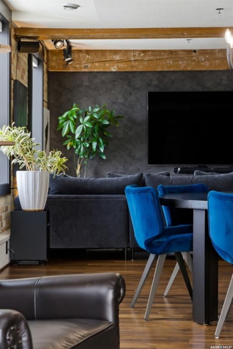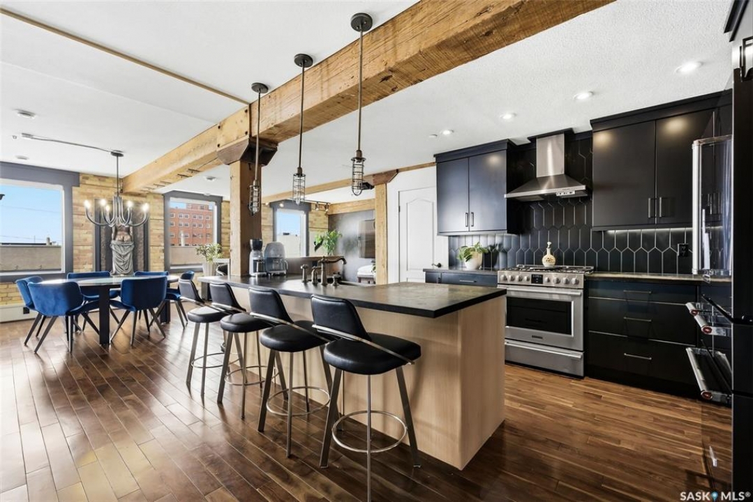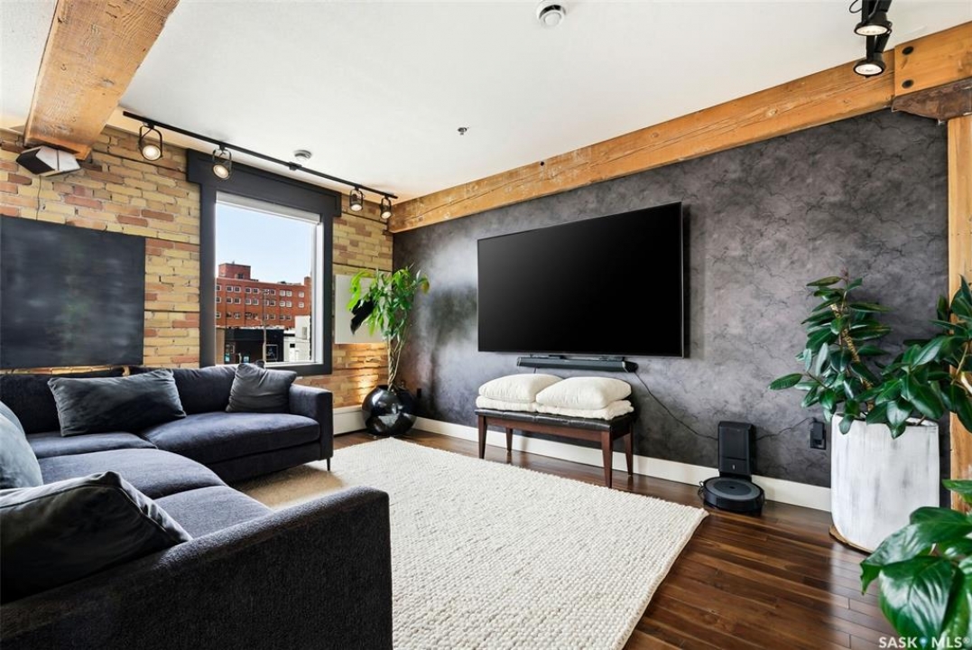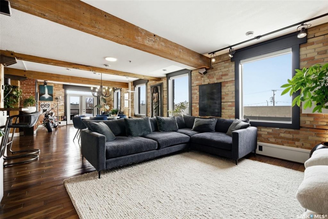 Located in Regina's Warehouse District, this stunning one-of-kind loft delivers a rare blend of character, space, and modern updates. The open-concept design features two distinct living areas, formal dining space, and beautifully updated kitchen—all anchored by rich American walnut hardwood and framed by original exposed brick and beam construction. The space feels both effortlessly cool & very functional. South & west-facing exposures flood the space with natural light while offering views of the downtown skyline, and our iconic prairie sunsets. The spacious primary suite features a walk-in closet and an updated ensuite complete with soaker tub, custom tile shower, & double vanity. The 2nd bedroom also includes a walk-in closet w/custom organizers. The main bath has also been updated, elevating everyday comfort with heated floors and a jetted tub/shower combo. The kitchen is both stylish & functional, showcasing updated dark-stained Gun Metal Blue maple cabinetry, concrete countertops, stainless appliances, tiled backsplash & statement feature wall by Justine Marie Studios. The solid wood stand-up eating bar creates the perfect hub for hosting. And we can't forget about the newly added sleek glass-front wine cellar—an elegant focal point for entertaining and display. A versatile laundry/bonus room offers flexibility for a home office, den, guest space, or gym. Step outside to your impressive 19' x 23' private deck complete with a natural gas BBQ hookup, water line for plants, low-maintenance decking, and electronic sunshades. This outdoor space overlooks the landscaped courtyard & pool shared by only nine owners. Highlights include: Double detached garage + parking stall inside the gated compound; large basement storage unit; Updated appliances (KitchenAid French Door fridge & dishwasher); Owned water heater; Updated lighting, paint & remote blinds throughout. Contact your agent to schedule your private viewing.