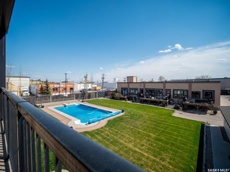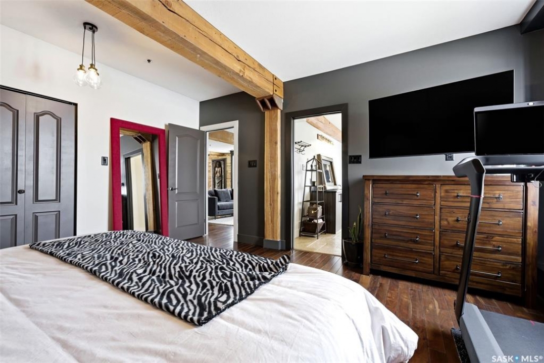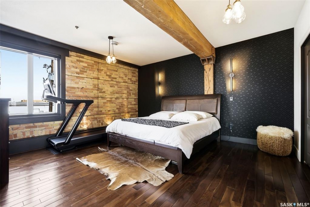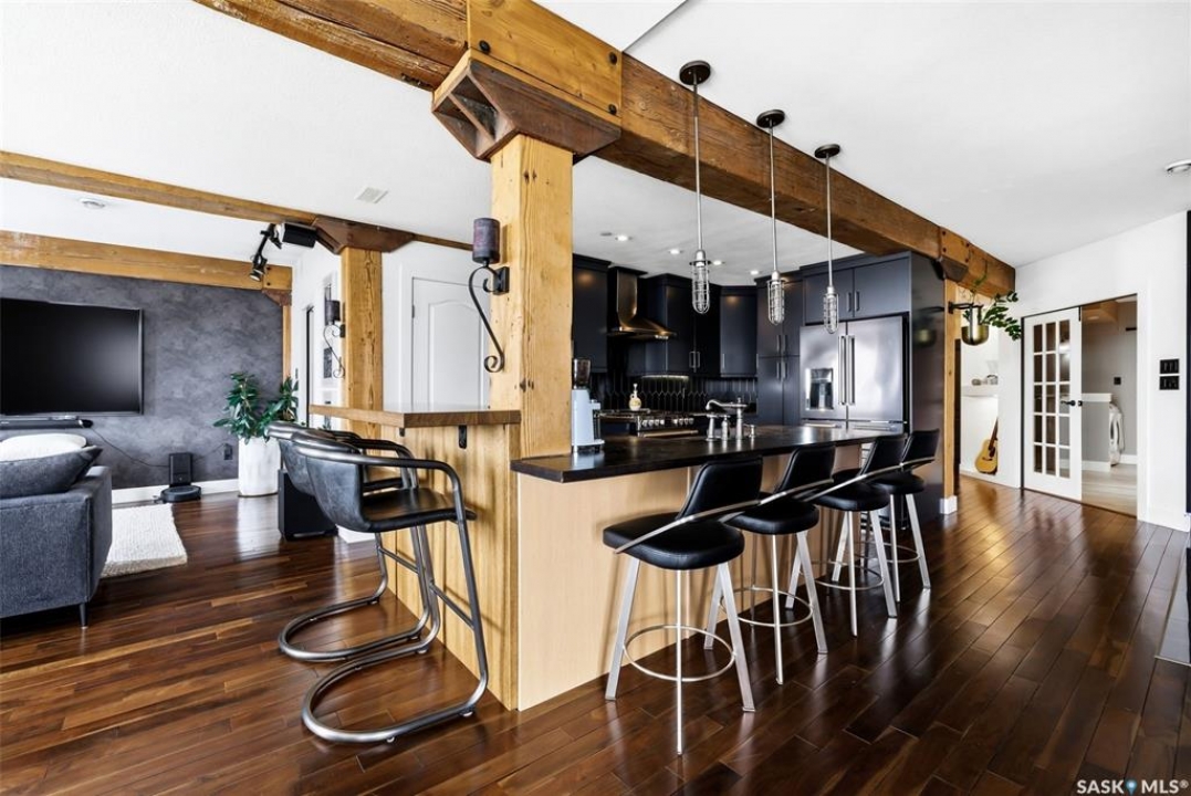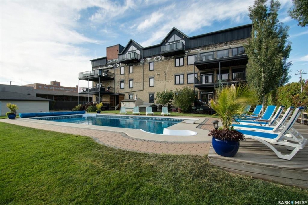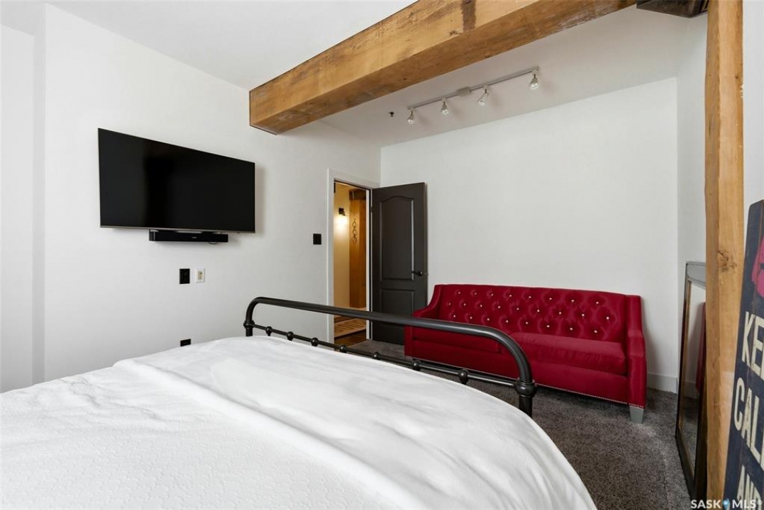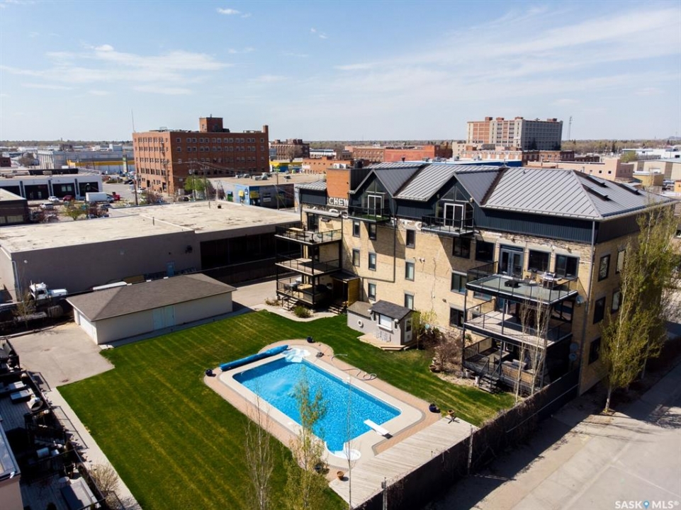 Located in Regina's Warehouse District, this stunning one-of-kind loft delivers a rare blend of character, space, and modern updates. The open-concept design features two distinct living areas, formal dining space, and beautifully updated kitchen—all anchored by rich American walnut hardwood and framed by original exposed brick and beam construction. The space feels both effortlessly cool & very functional. South & west-facing exposures flood the space with natural light while offering views of the downtown skyline, and our iconic prairie sunsets. The spacious primary suite features a walk-in closet and an updated ensuite complete with soaker tub, custom tile shower, & double vanity. The 2nd bedroom also includes a walk-in closet w/custom organizers. The main bath has also been updated, elevating everyday comfort with heated floors and a jetted tub/shower combo. The kitchen is both stylish & functional, showcasing updated dark-stained Gun Metal Blue maple cabinetry, concrete countertops, stainless appliances, tiled backsplash & statement feature wall by Justine Marie Studios. The solid wood stand-up eating bar creates the perfect hub for hosting. And we can't forget about the newly added sleek glass-front wine cellar—an elegant focal point for entertaining and display. A versatile laundry/bonus room offers flexibility for a home office, den, guest space, or gym. Step outside to your impressive 19' x 23' private deck complete with a natural gas BBQ hookup, water line for plants, low-maintenance decking, and electronic sunshades. This outdoor space overlooks the landscaped courtyard & pool shared by only nine owners. Highlights include: Double detached garage + parking stall inside the gated compound; large basement storage unit; Updated appliances (KitchenAid French Door fridge & dishwasher); Owned water heater; Updated lighting, paint & remote blinds throughout. Contact your agent to schedule your private viewing.