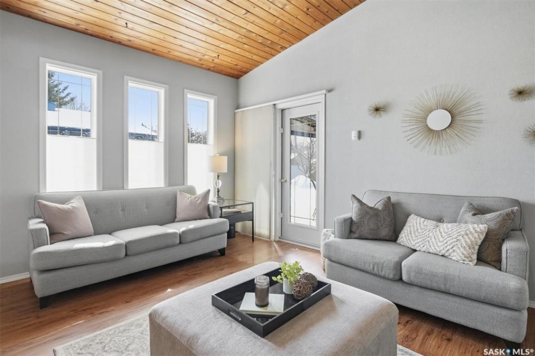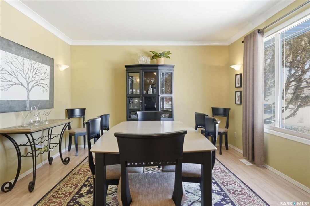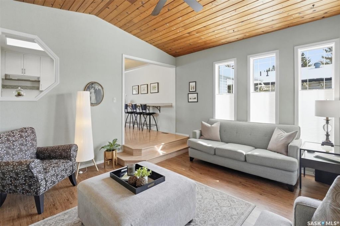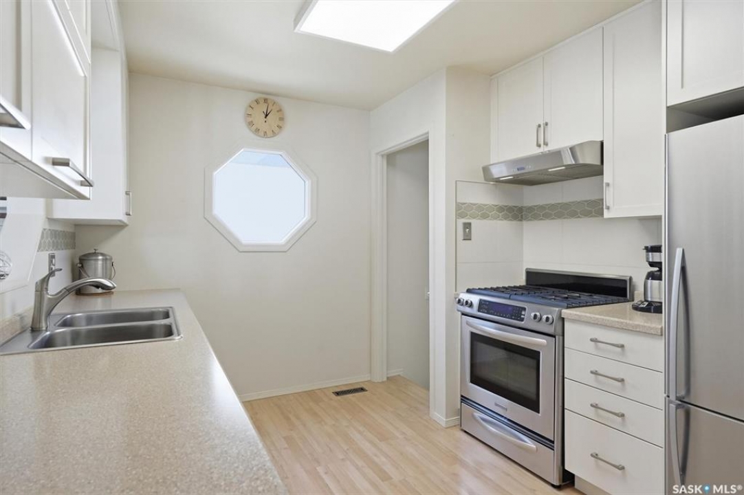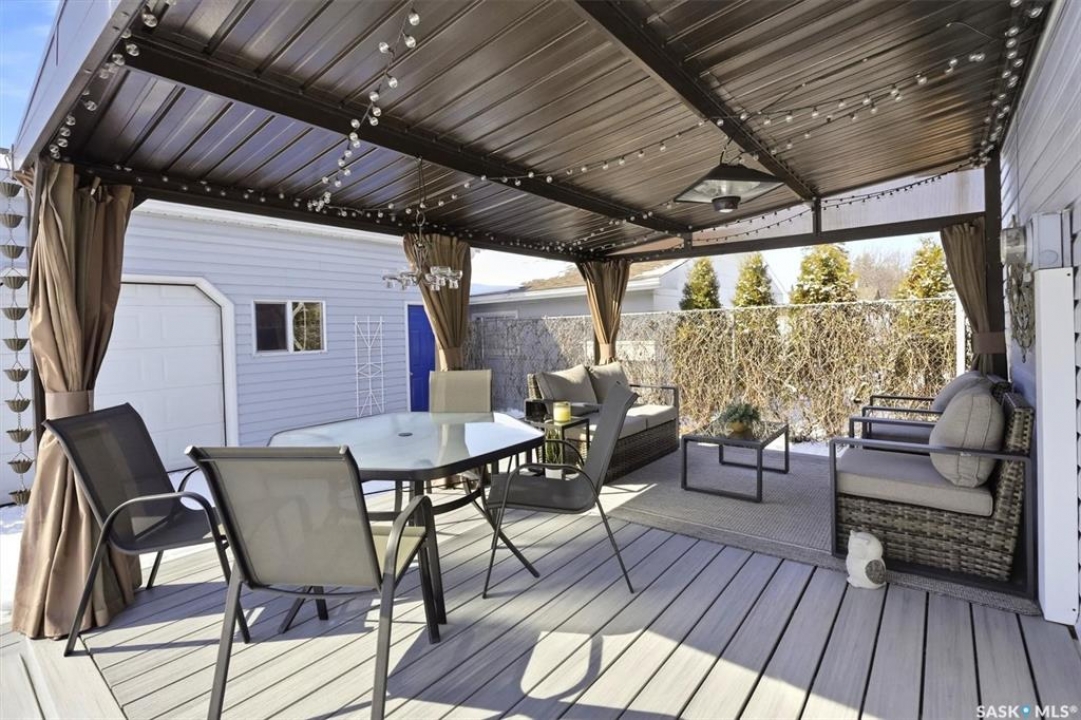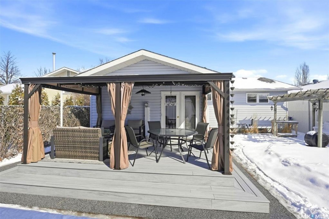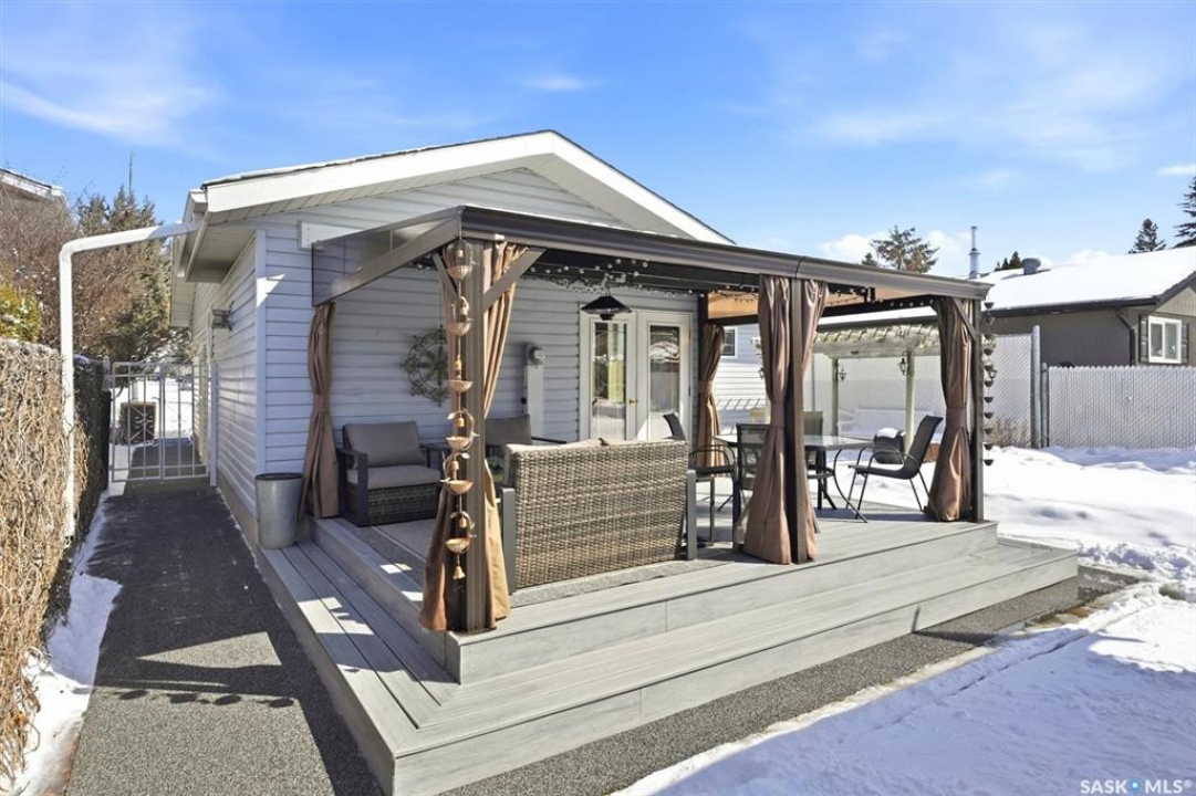Excellent location for this south west backing home in the heart of East College Park. This fully developed 1157 square foot bungalow, with detached garage, has been meticulously kept from top to bottom. The main level includes 2 bedrooms (originally 3), a 4-piece bath, beautiful kitchen w/ stylish eating bar, a good sized separate dining area, and a gorgeous living room with vaulted ceilings and gas fireplace. In the basement you will find a spacious recreation room, laundry/utility room complete w/ double sink, office, and 3-pce bath. The manicured yard is an entertainers dream and definitely a focal point for this property featuring a large covered deck w/ screen room & composite flooring (2024), private sitting area w/ pergola, rubber epoxy sidewalks (2023), a detached garage (12' W door) w/ sliding door to yard, underground sprinklers front & back, and numerous perennials/ornamental trees. Some other notable updates to this home: kitchen remodel (2020), shingles (2025), hot water heater (2025). Includes kitchen appliances, washer and dryer (natural gas dryer), air conditioner, and window coverings. This prime location is only a short walk to Sidney L. Buckwold Park with 2 elementary schools: St. Augustine (Catholic), and Roland Michener (Public). Quick access from the neighbourhood on Boychuk Drive to several nearby amenities. Presentation of Offers April 7th, 2026 4:00 P.M. Call to view!