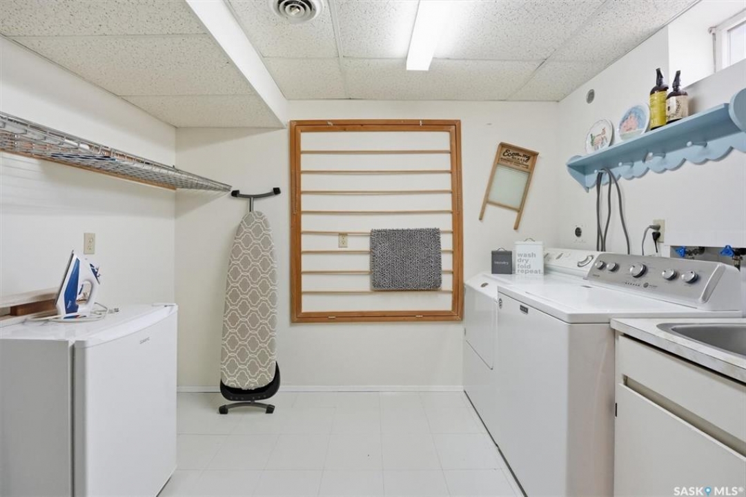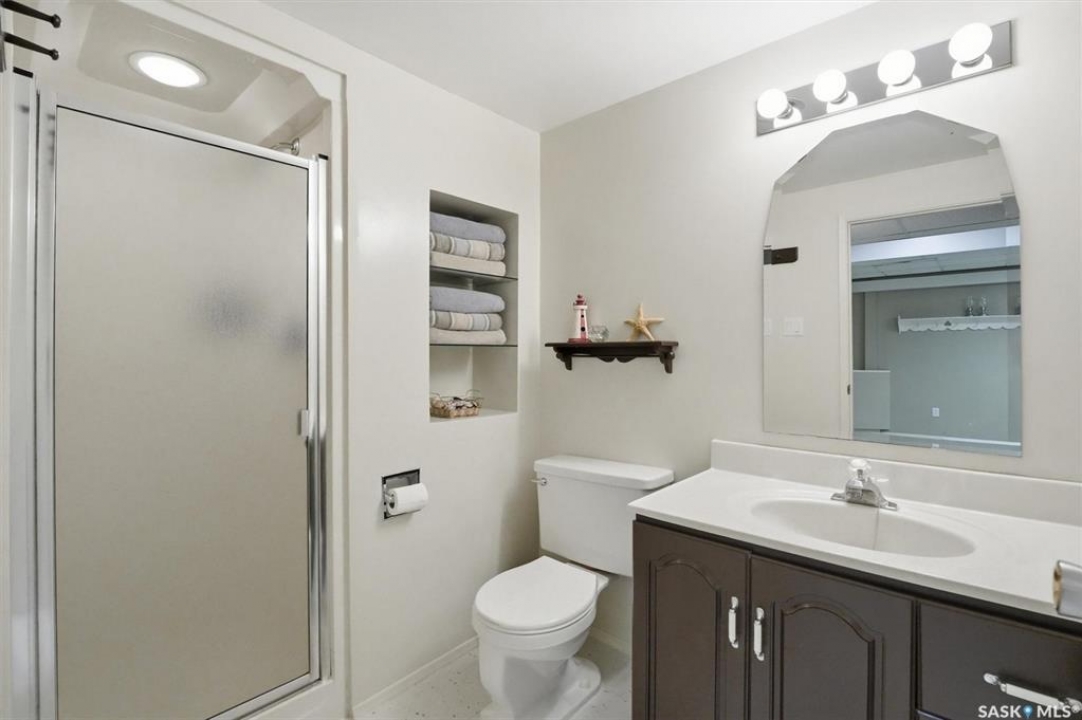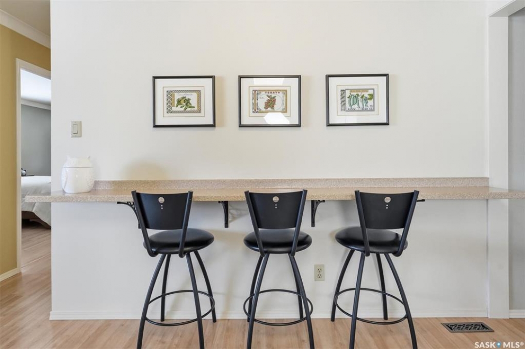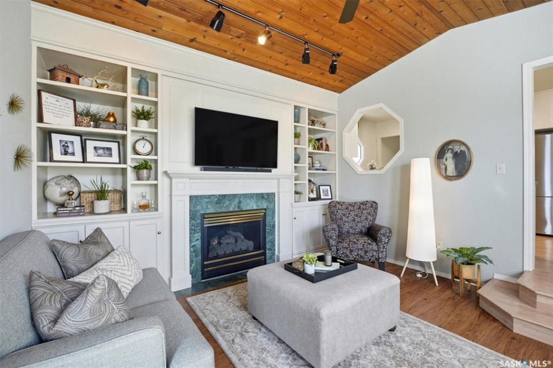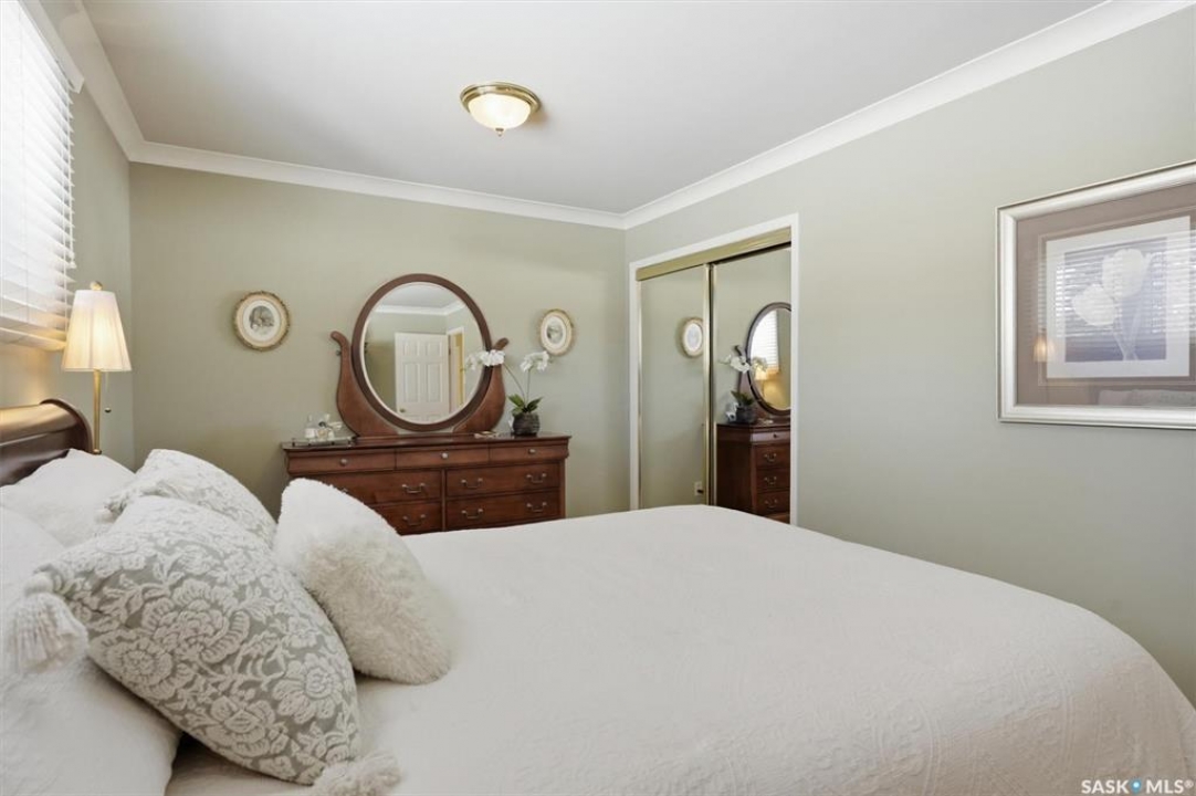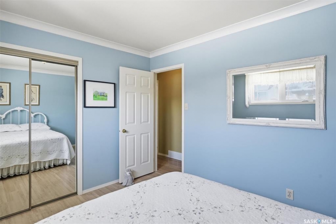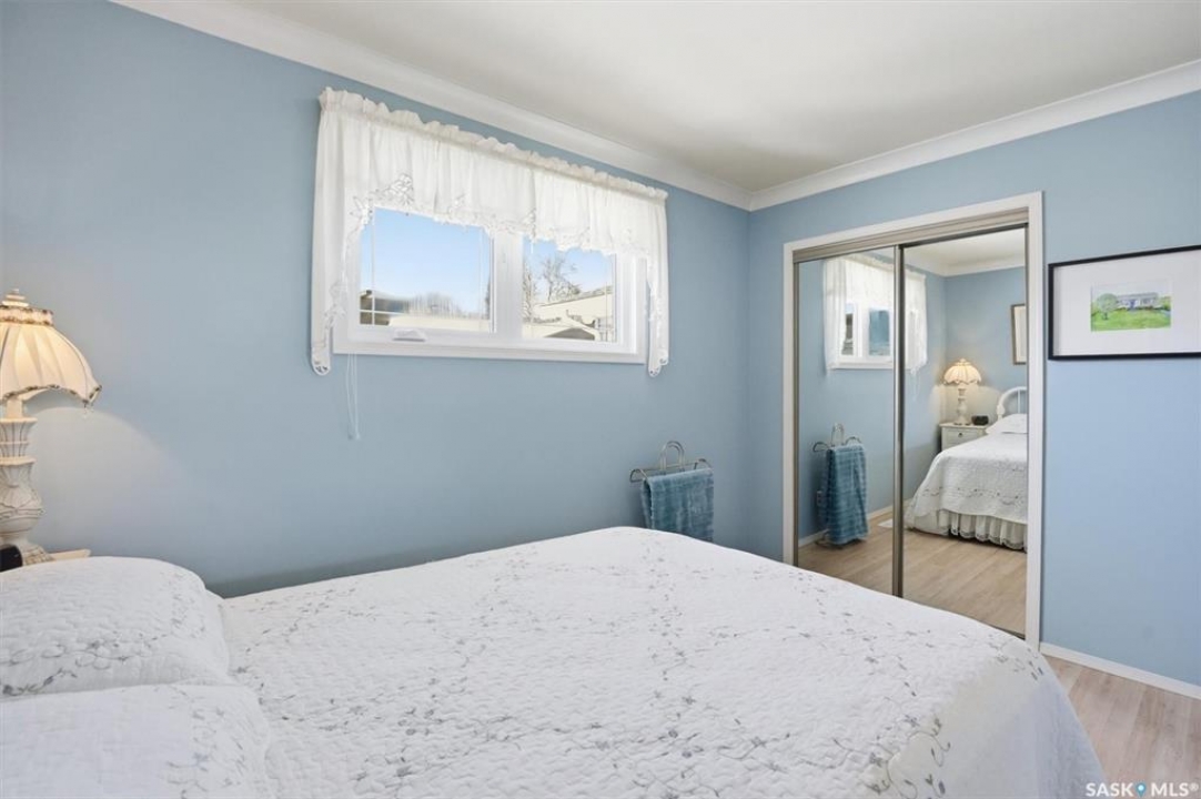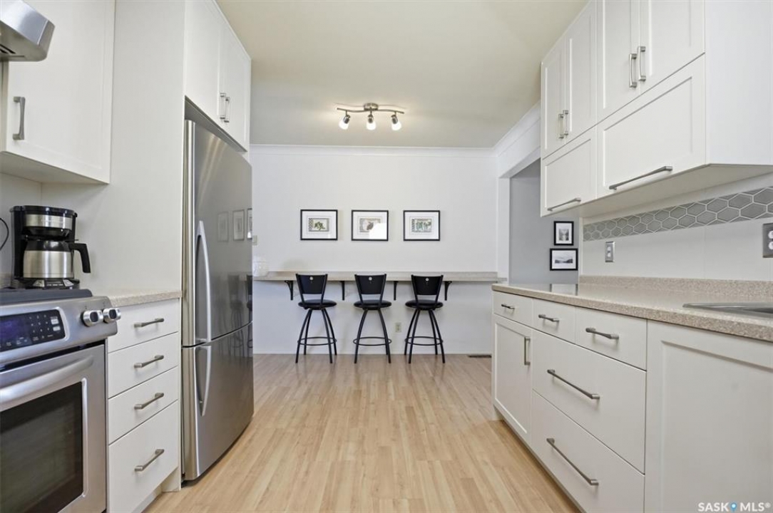 Excellent location for this south west backing home in the heart of East College Park. This fully developed 1157 square foot bungalow, with detached garage, has been meticulously kept from top to bottom. The main level includes 2 bedrooms (originally 3), a 4-piece bath, beautiful kitchen w/ stylish eating bar, a good sized separate dining area, and a gorgeous living room with vaulted ceilings and gas fireplace. In the basement you will find a spacious recreation room, laundry/utility room complete w/ double sink, office, and 3-pce bath. The manicured yard is an entertainers dream and definitely a focal point for this property featuring a large covered deck w/ screen room & composite flooring (2024), private sitting area w/ pergola, rubber epoxy sidewalks (2023), a detached garage (12' W door) w/ sliding door to yard, underground sprinklers front & back, and numerous perennials/ornamental trees. Some other notable updates to this home: kitchen remodel (2020), shingles (2025), hot water heater (2025). Includes kitchen appliances, washer and dryer (natural gas dryer), air conditioner, and window coverings. This prime location is only a short walk to Sidney L. Buckwold Park with 2 elementary schools: St. Augustine (Catholic), and Roland Michener (Public). Quick access from the neighbourhood on Boychuk Drive to several nearby amenities. Presentation of Offers April 7th, 2026 4:00 P.M. Call to view!