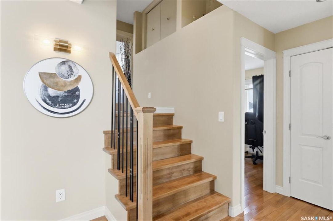 Absolutely stunning home in the vibrant and growing community of Dalmeny, just 12 minutes from Saskatoon. Tucked away on a quiet street, this beautifully designed modified bi-level walkout offers a perfect blend of style, space, and functionality for family living. Boasting five bedrooms plus a den and three full bathrooms, there's room for everyone. The private primary retreat, featuring vaulted ceilings, is thoughtfully positioned above the garage, while two additional bedrooms are conveniently located on the main floor. The bright, open-concept living area is warm and inviting, highlighted by a cozy gas fireplace, rich hardwood flooring, ceramic tile, and a well-appointed kitchen complete with maple cabinetry and sleek black granite countertops. A spacious mudroom off the double attached garage with in-floor heat adds everyday convenience. The fully developed, walk-out basement extends the living space with a bright family room, gym area, two more bedrooms, a den, a full bathroom, plush carpeting, ceramic tile, and the added comfort of in-floor heating. Quality craftsmanship is evident throughout, with features such as triple-pane windows, a tankless water heater, high-efficiency furnace, central air conditioning, central vacuum, and underground sprinklers. Step outside to a beautifully landscaped backyard designed for entertaining, featuring a sunken patio, RV parking, a firepit area, and a deck off the kitchen with a natural gas hookup. Completing the property is a triple driveway and a 16' x 16' detached garage with back alley access. This exceptional home truly has it all.