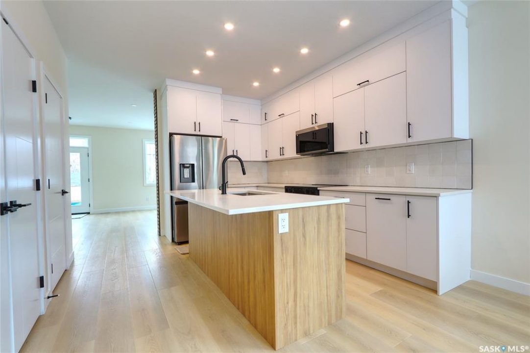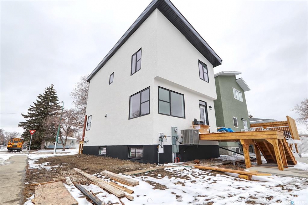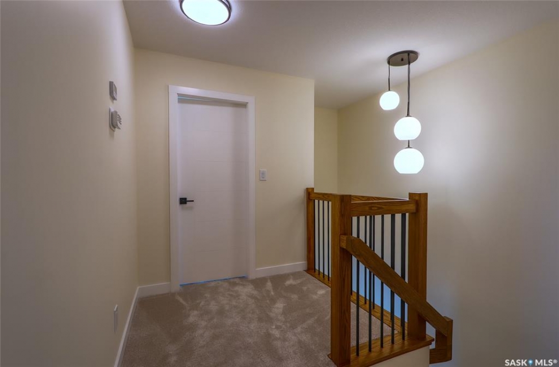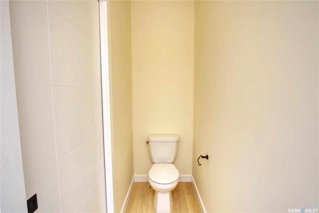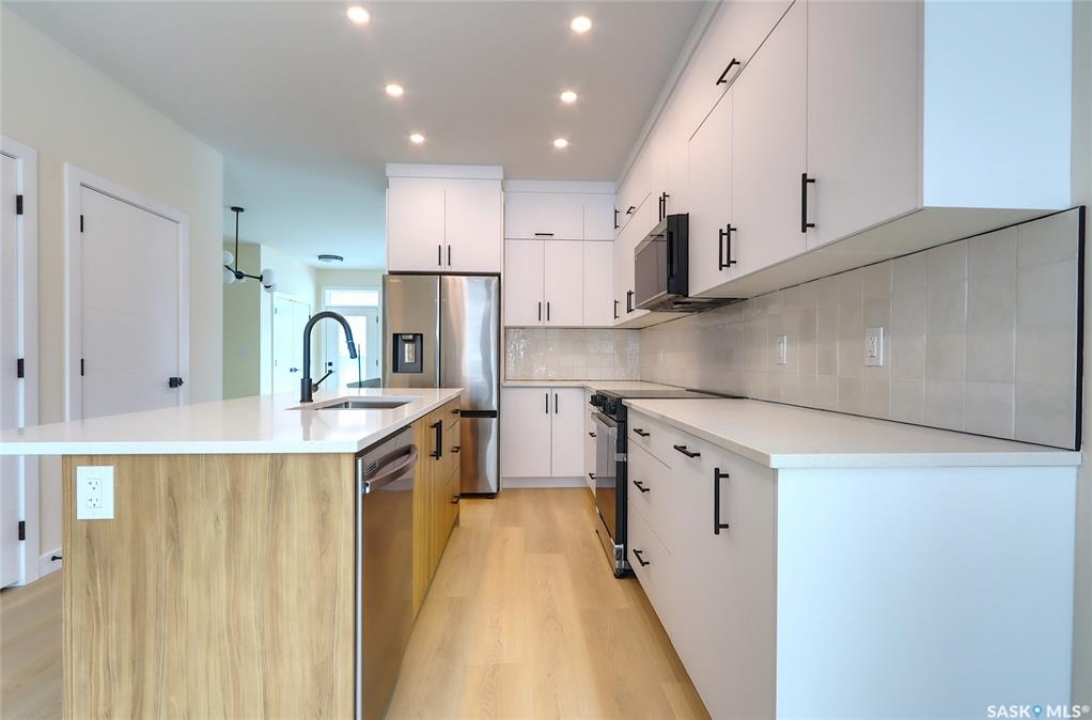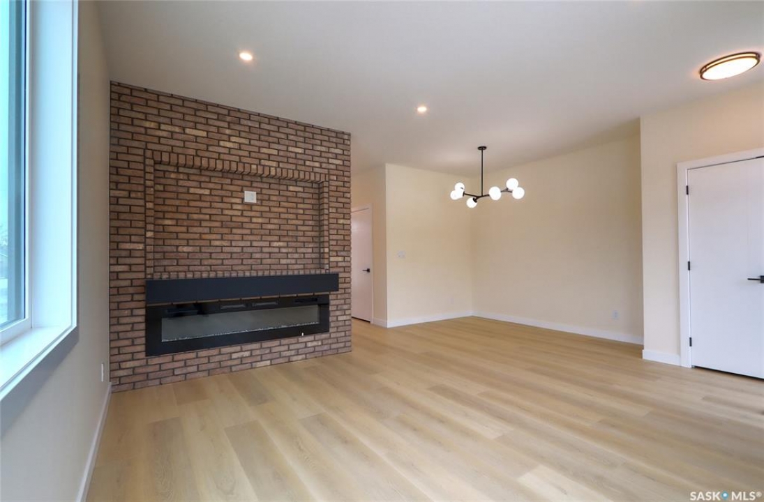 Welcome to this beautifully constructed 2-storey home offering 1,576 sqft of thoughtfully designed and highly customized living space. From the moment you enter, you're greeted by a warm and inviting foyer that sets the tone for the rest of the home. The main floor features a stunning, oversized kitchen complete with tall white cabinetry, ample counter space, and a layout perfect for both everyday living and entertaining. The open-concept design flows seamlessly between the dining area and spacious living room, highlighted by a striking brown brick feature wall with a sleek electric fireplace. A convenient 2-piece bathroom completes the main level. Upstairs, you'll find three well-appointed bedrooms and two full bathrooms. The primary suite offers a private retreat with a walk-in closet and its own 3-piece ensuite. The additional bedrooms are generously sized and ideal for family, guests, or a home office. The basement is unfinished and ready for your personal touch, featuring a separate side entry—an excellent opportunity for future basement suite development or added income potential. Outside, the rear of the property includes a parking pad with space for two vehicles, with the option to develop a full two-car garage. Located in the Arnhem Place neighbourhood of Regina, this home offers convenient access to downtown, schools, parks, and public transit. Nearby amenities, shopping, and services make daily living easy, while the proximity to University of Regina and Saskatchewan Polytechnic adds to the property's appeal for families, professionals, and investors alike. This home is protected by the Saskatchewan New Home Warranty Program, providing 1-year comprehensive coverage, 2-year mechanical systems coverage, and 10-year structural coverage — giving buyers complete peace of mind with their investment. A fantastic opportunity to own a modern, move-in-ready home in a mature neighbourhood with excellent potential.
