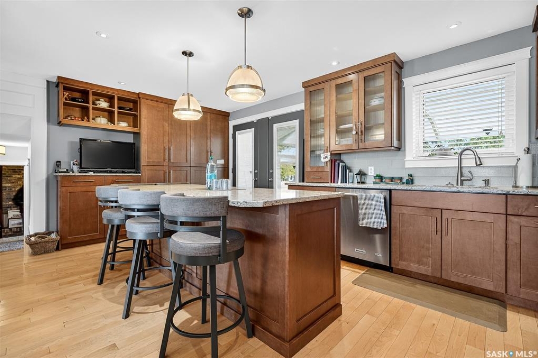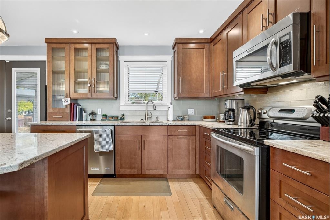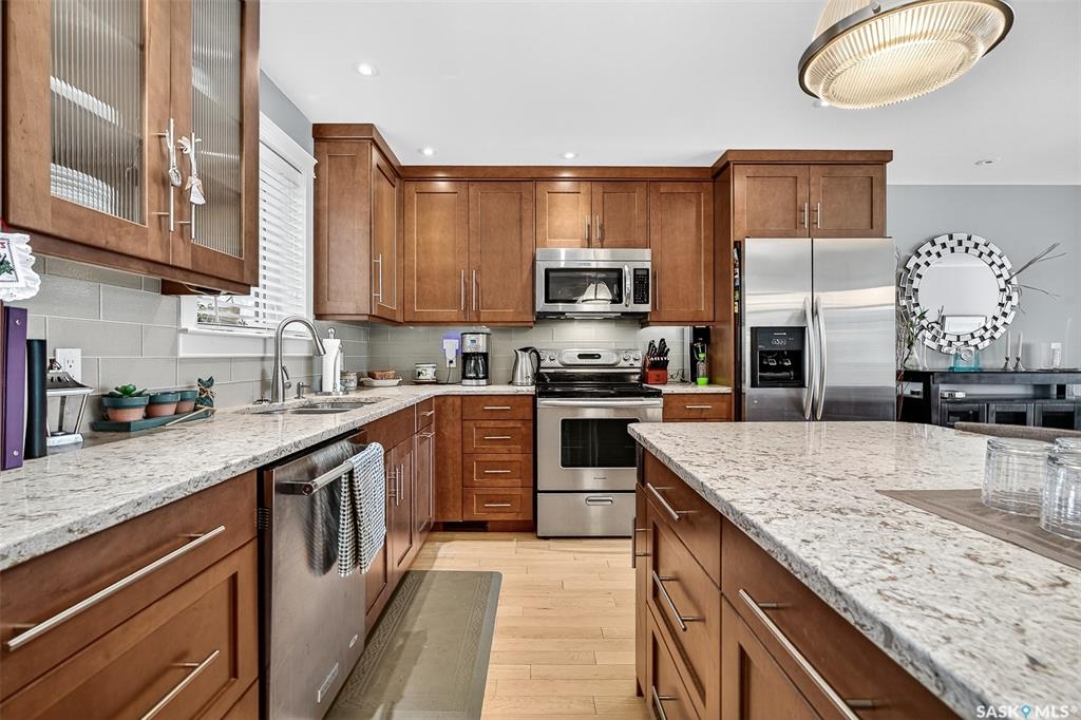 One Owner, Custom Built 5-level split offering an impressive 1,957 sq ft of thoughtfully designed living space. Located in the highly sought-after Sunningdale area, this home showcases craftsmanship and foresight well beyond its year built. As you enter the main level features an open-concept design that seamlessly blends functionality and style. A spacious living room with large windows fills the space with natural light and creates a warm, welcoming atmosphere. The generous dining area flows effortlessly into the renovated kitchen, which is a true highlight — complete with stone countertops, stainless steel appliances, an eat-in island, abundant cabinetry, and an area that could be a coffee bar. Perfect for both everyday living and entertaining. Upstairs is a rare find….4 bedrooms all on one level. There are three bedrooms, a 4pc main bathroom and a spacious primary bedroom with a 3-piece ensuite and a large walk-in closet. As you walk into the 3rd level you enter a warm, inviting family room featuring a cozy wood-burning fireplace, with convenient access to the double attached garage with radiant heat, laundry area, 3pc bathroom and the access to the fully fenced backyard — ideal for gatherings and outdoor enjoyment. The next level offers a generous games or recreation room, providing endless possibilities for a home gym, playroom, or entertainment area. On the fifth and final level, you'll find a large versatile room with plenty of storage space, the utility area, and potential for relocating the laundry if desired. Outside, enjoy a beautifully landscaped and fully fenced yard complete with underground sprinklers, 2 sheds and a screened-in three-season deck with composite decking (which also has access off the kitchen), perfect for relaxing or entertaining while staying sheltered from the elements. This property perfectly blends quality construction, tasteful updates, and a functional multi-level layout.