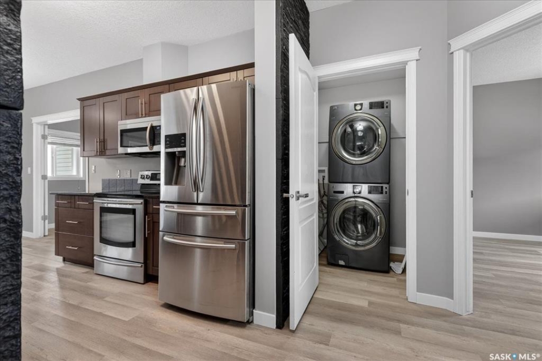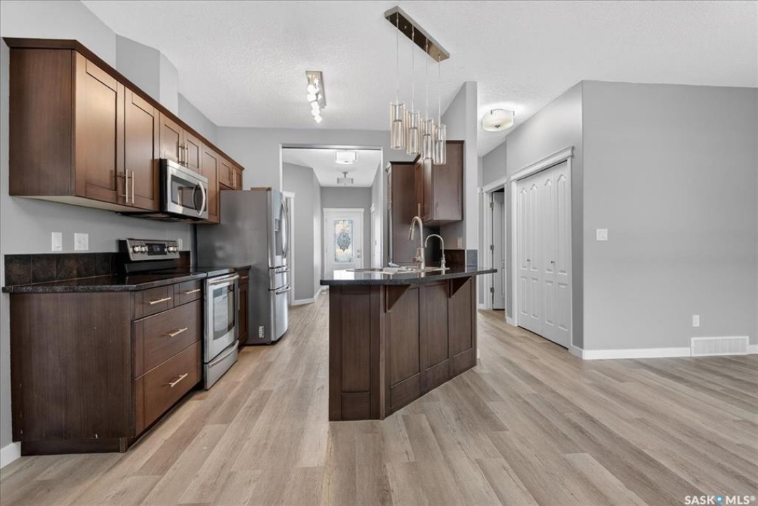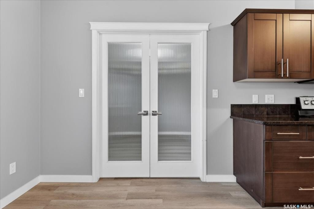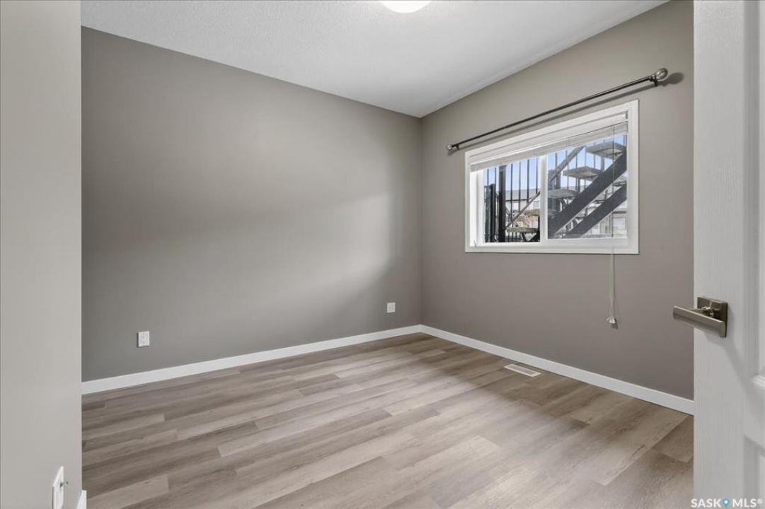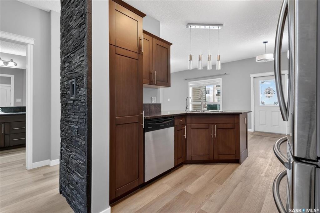 Welcome to this well-maintained, thoughtfully updated main floor condo offering 1,066 sq ft of functional, easy living space. Brand new vinyl flooring and fresh paint throughout, complemented by stylish light fixtures, granite countertops with island, plenty of cabinetry in the kitchen, stainless steel appliances and a reverse osmosis system with separate tap. The open-concept layout connects the kitchen, dining, and living areas, creating a comfortable space for both everyday living and entertaining. A feature wall at the entry adds warmth and character, setting the tone as you step inside. Storage is a standout feature, with generous closet space throughout, additional storage off the patio, and a spacious crawl space ideal for larger or seasonal items. The primary suite can accommodate a king size bed, offers plenty of closet space and a full 4-piece ensuite. A second bedroom is thoughtfully positioned, while the third bedroom or den—accessed through French doors—provides flexibility for a home office, guest space, or additional bedroom. A second full bathroom adds everyday convenience. Step outside to a south-facing patio, perfect for enjoying natural light throughout the day. Additional street parking is conveniently located just behind, with direct access to the patio and back entrance to unit — making everyday living, moving, and bringing in groceries simple and efficient. The unit includes one electrified parking stall conveniently situated at the front entrance of the unit. Ideally situated in Regina's east end, you're minutes from amenities, restaurants, shopping and more, with nearby bus routes and close proximity to Henry Braun, St. Theresa, and Judge Bryant schools. A clean, move-in ready condo offering flexibility, comfort, and a layout that truly works. New water heater installed July of 2025.