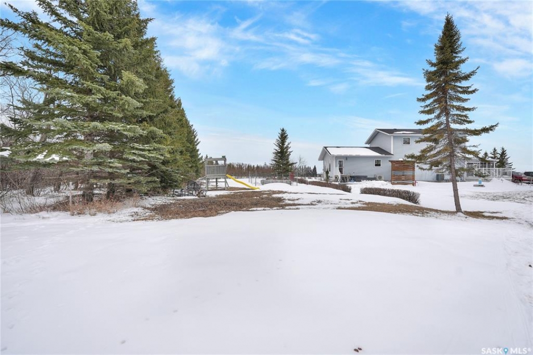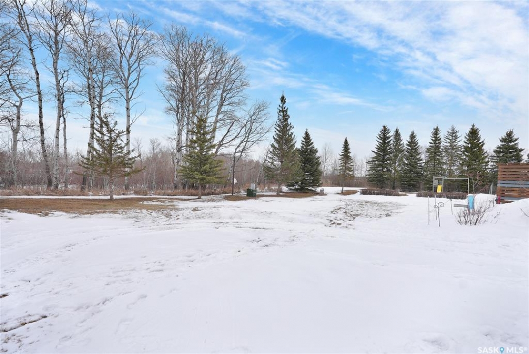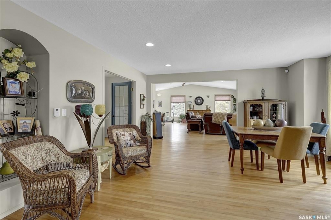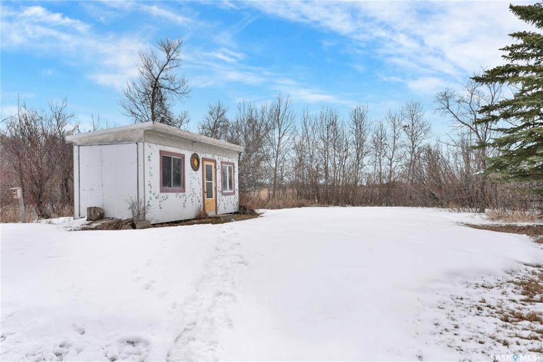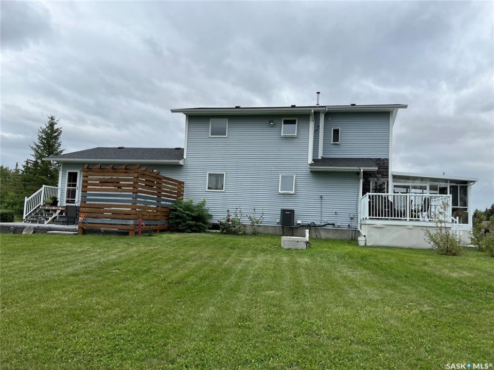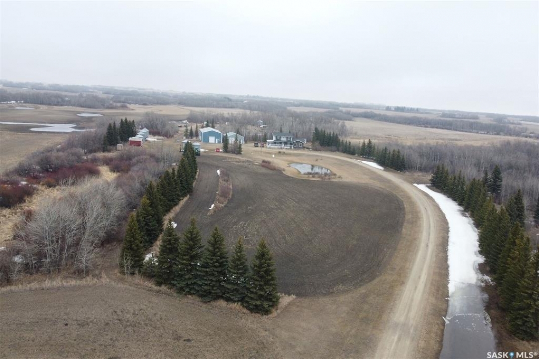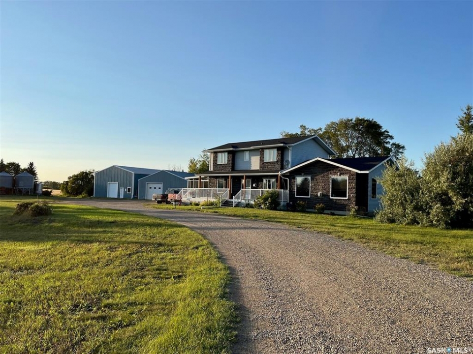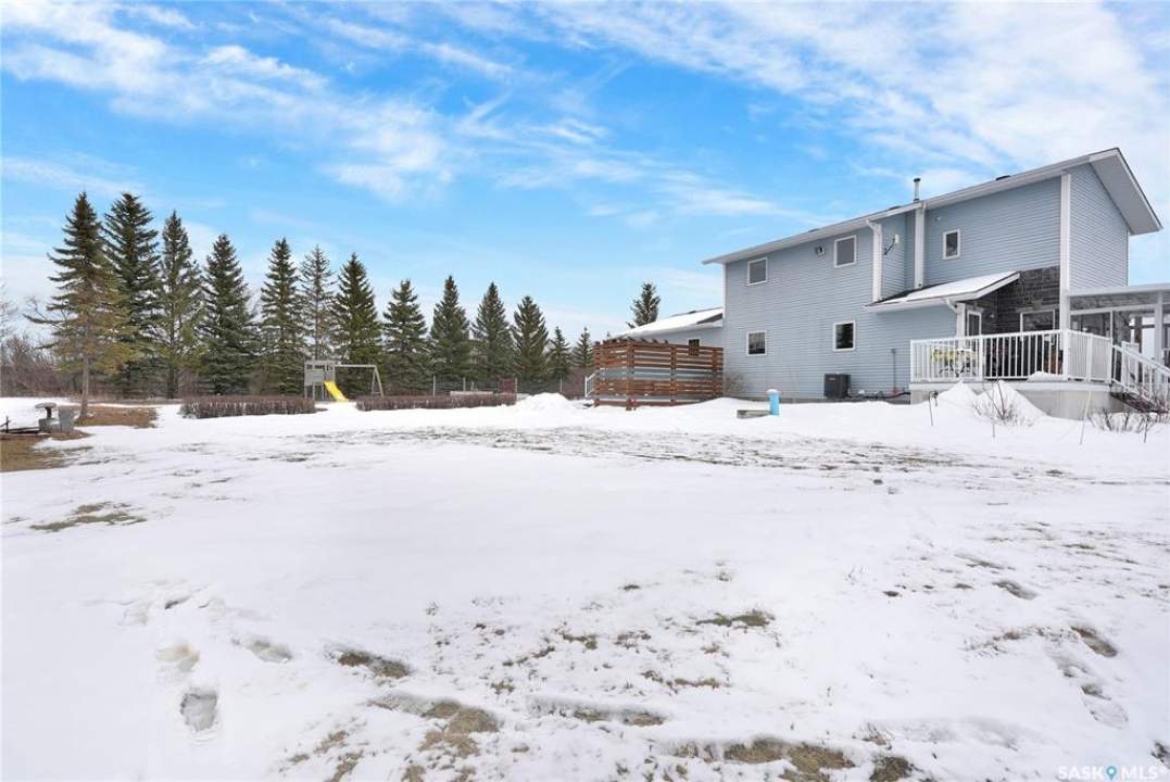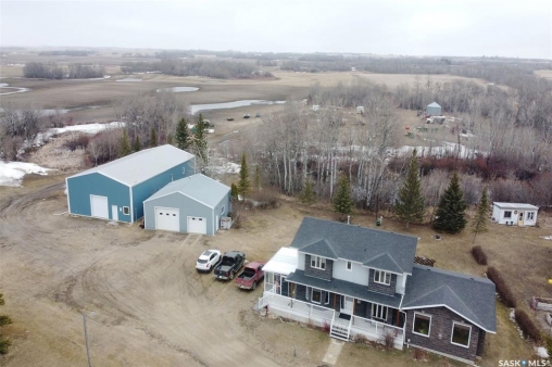Dreaming of quiet country living just minutes from the city? This stunning Varsity home offers the perfect balance of privacy and convenience—located only 15 minutes north of Regina, 10.4 km from Pilot Butte, 22 km to Balgonie, and 18 km to East Regina amenities including Costco. Set on a beautifully treed acreage, this impressive 2,300 sq ft south-facing home is bright, spacious, and designed for comfortable living. The property features a 32' x 36' shop and a split 40' x 72' outbuilding (formerly a honey processing facility) complete with a 2-piece bath—ideal for hobbies, storage, or business use. Additional highlights include multiple sheds, raised garden beds, a large garden area, and a family-friendly play centre. Inside, the main floor showcases a gorgeous updated kitchen by J & C Cabinets, a dining nook with access to a 3-season sunroom built on piles, a formal dining room with gas fireplace, and a large living room with vaulted ceilings and a second gas fireplace. A pantry/storage area with stove, office/den, 2-piece bath, and laundry/mudroom complete the main level. (Addition is heated and cooled by heatpump.) Upstairs offers 3 generous bedrooms, including a primary suite with 3-piece ensuite and walk-in closet, plus a full 4-piece bath. The developed basement adds even more space with a rec room, 3piece bath and additional bedroom.(Window may not meet egress) Enjoy outdoor living with front and side decks and a hot tub (plug-and-play for six). Enjoy walking tails through trees surrounding the yard. Seller's grandchildren refer to them as "a walk through the forest". This is a property you'll never want to leave—ask your agent for the full list of upgrades and features.