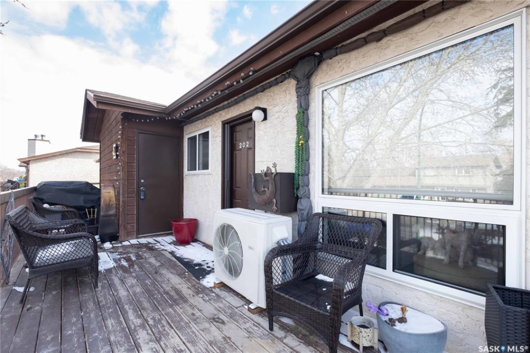 Beautiful 2 bedroom, 2 four piece bathroom, updated condo located in the desirable, quiet, mature residential neighborhood of Gardiner Heights. This upper end unit is nicely maintained and move in ready, it offers privacy, natural light, neutral colors and modern updates. The living area offers both definition of space as well as an open concept, it features a bright living room with a large window and cozy fireplace, perfect for relaxing evenings. Eat in kitchen with Maple cabinets. Both bedrooms are 11' x 12' 6" with walk in closets and there own 4 piece bathrooms with soaker tubs. This unit also offers the convenience of in-suite laundry with extra storage. Ecoline Windows installed in 2025. Main door features a phantom screen door leading to your large private deck that faces west, plus there's an additional outside storage room at the south side of the deck. This complex offers ample green space and a seasonal outdoor swimming pool for residents to enjoy. Condo fees include heat, water and a designated electrified parking stall. Pets are allowed with restrictions. This property is conveniently located in east Regina close to all east end amenities. Lots of street parking right out front of unit.