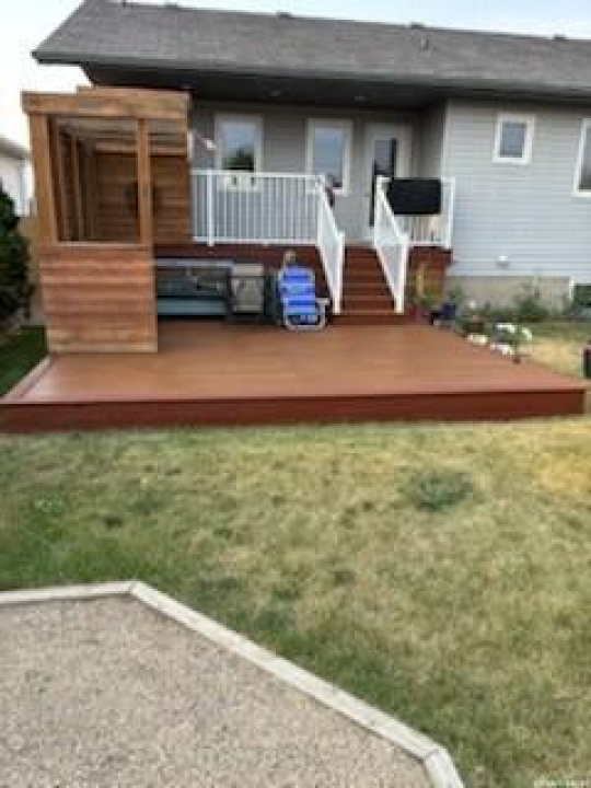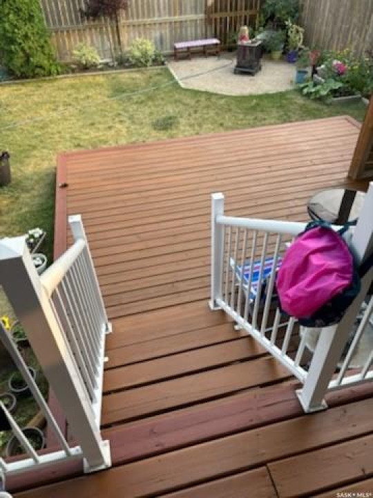 Outdoor: Deck, Fenced, Garden Area, Lawn Back, Lawn Front, Trees/shrubs