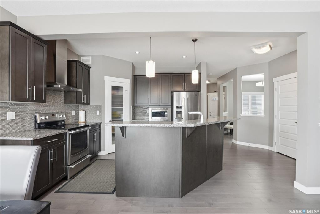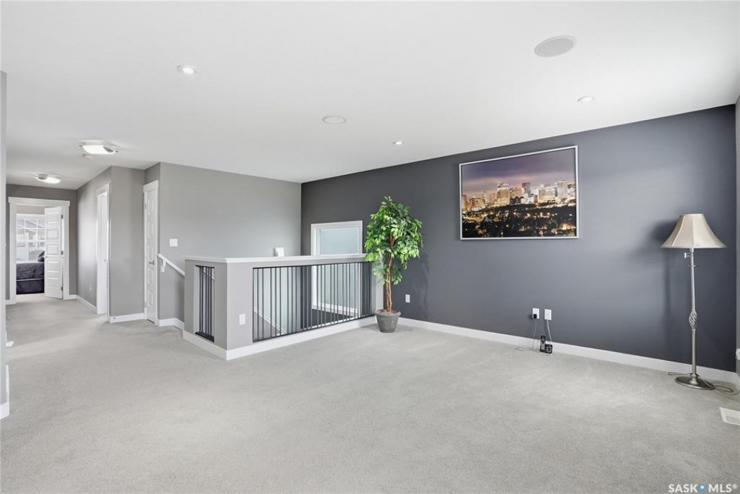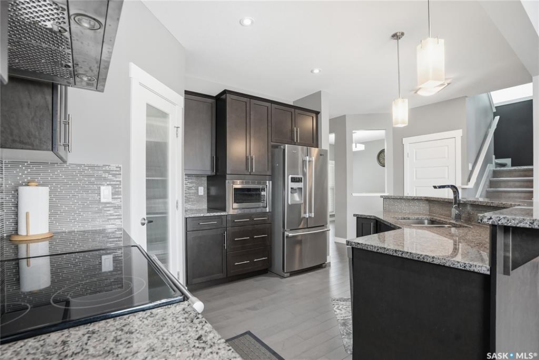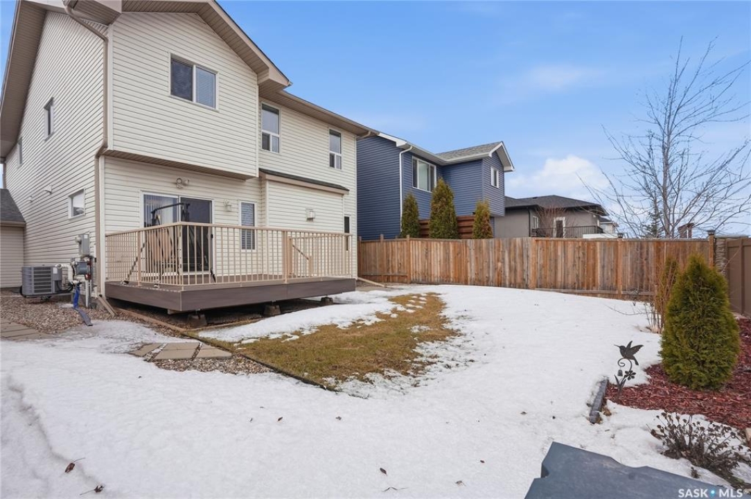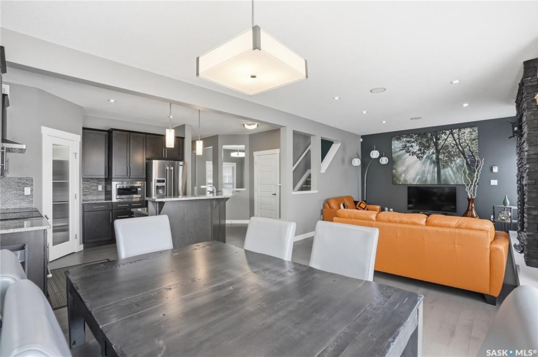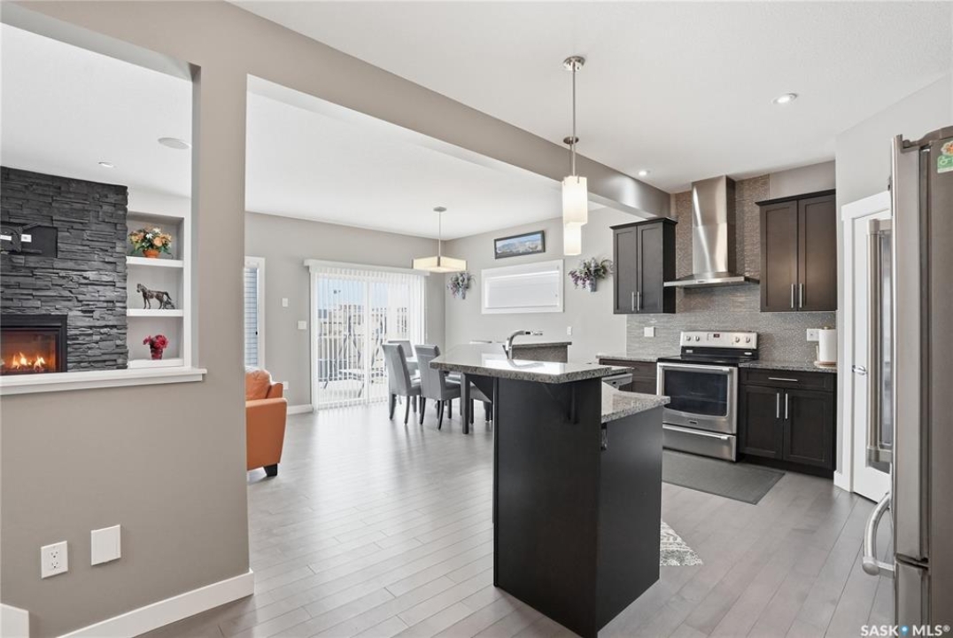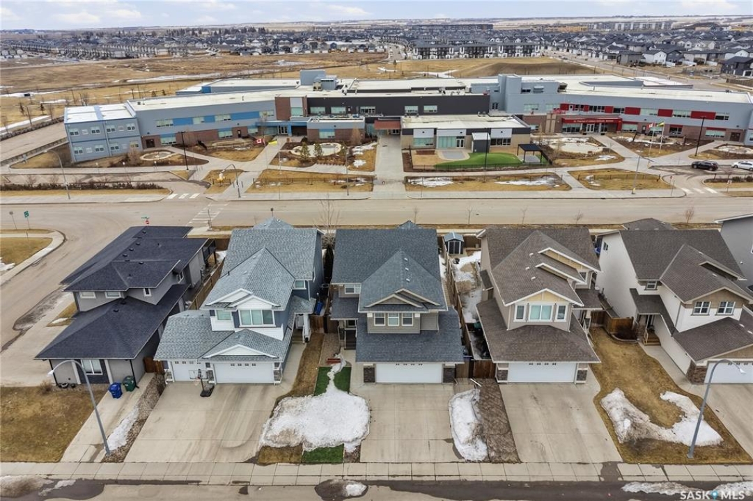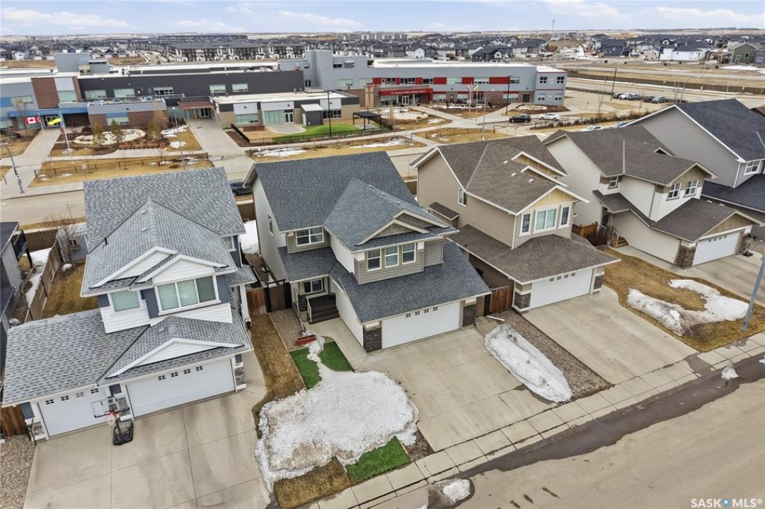 Welcome to 411 Flynn Lane, where thoughtful design and elevated finishes come together in one of Rosewood's most sought after locations, just steps from both public and Catholic schools. Offering over 2,200 sq ft, this home stands out with its curb appeal, low maintenance turf, and covered composite entry. Inside, you'll find engineered hardwood flooring, 9 foot ceilings, and a bright, functional layout with a private main floor den and a beautifully finished kitchen featuring granite countertops, soft close cabinetry, a walk-in pantry, and a large island that anchors the space. The living room is centered around a gas fireplace, creating a warm and inviting focal point, while the dining area opens seamlessly to the backyard and professionally landscaped yard backing the schools. Upstairs, the primary suite offers a vaulted ceiling, a spacious walk in closet, and a well appointed five piece ensuite. Three additional bedrooms, a full bathroom with double vanity, a bonus room, and a convenient second floor laundry room provide the ideal family layout. The professionally developed basement adds even more living space with a sound insulated theatre room wired for projector and surround sound, a bedroom, a full bathroom, gym or flex space, and generous storage. Additional features include central air conditioning, built-in speakers, central vac, triple pane windows, Hunter Douglas blinds, and custom MDF shelving throughout the home, along with a fully finished oversized garage. This is a move-in ready home that offers a rare combination of quality, function, and location.