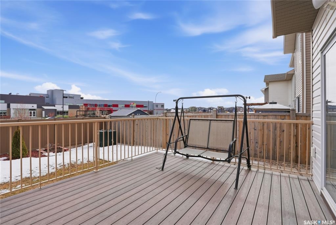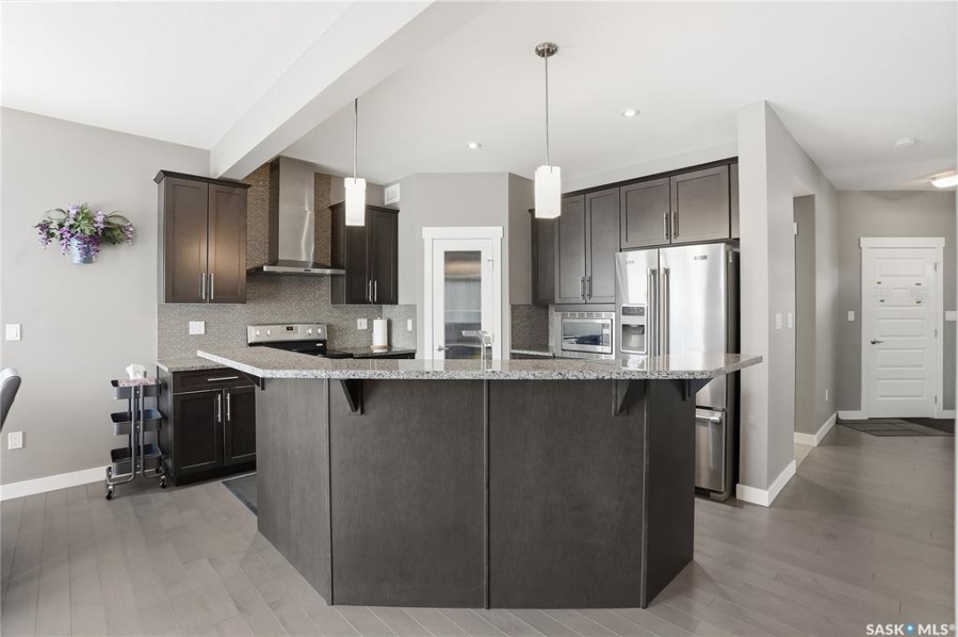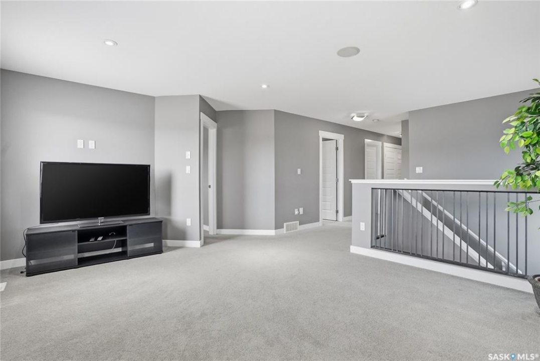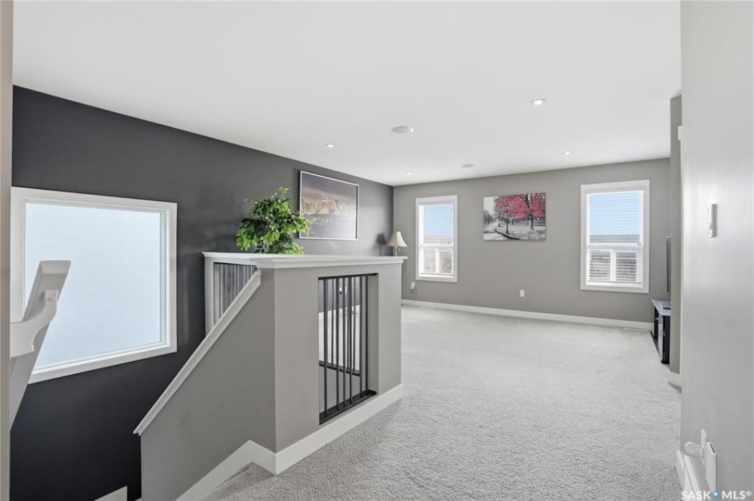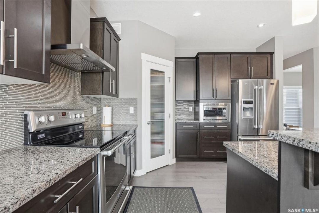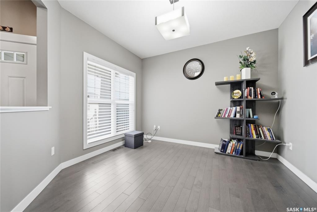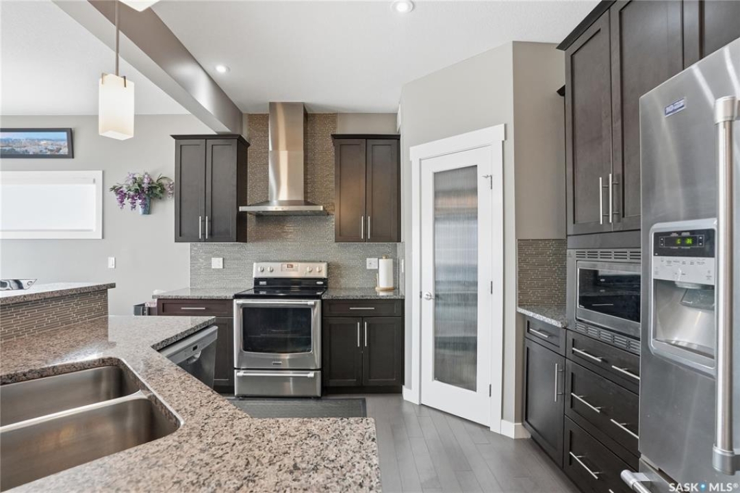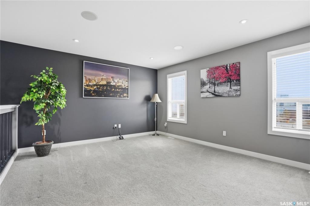 Welcome to 411 Flynn Lane, where thoughtful design and elevated finishes come together in one of Rosewood's most sought after locations, just steps from both public and Catholic schools. Offering over 2,200 sq ft, this home stands out with its curb appeal, low maintenance turf, and covered composite entry. Inside, you'll find engineered hardwood flooring, 9 foot ceilings, and a bright, functional layout with a private main floor den and a beautifully finished kitchen featuring granite countertops, soft close cabinetry, a walk-in pantry, and a large island that anchors the space. The living room is centered around a gas fireplace, creating a warm and inviting focal point, while the dining area opens seamlessly to the backyard and professionally landscaped yard backing the schools. Upstairs, the primary suite offers a vaulted ceiling, a spacious walk in closet, and a well appointed five piece ensuite. Three additional bedrooms, a full bathroom with double vanity, a bonus room, and a convenient second floor laundry room provide the ideal family layout. The professionally developed basement adds even more living space with a sound insulated theatre room wired for projector and surround sound, a bedroom, a full bathroom, gym or flex space, and generous storage. Additional features include central air conditioning, built-in speakers, central vac, triple pane windows, Hunter Douglas blinds, and custom MDF shelving throughout the home, along with a fully finished oversized garage. This is a move-in ready home that offers a rare combination of quality, function, and location.