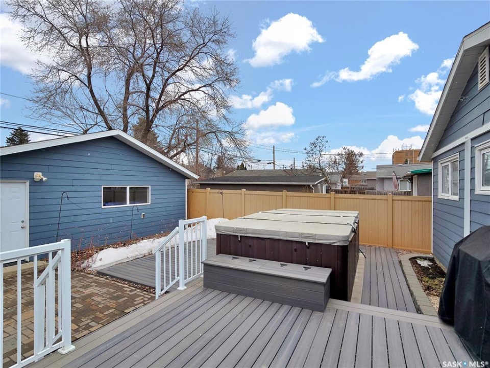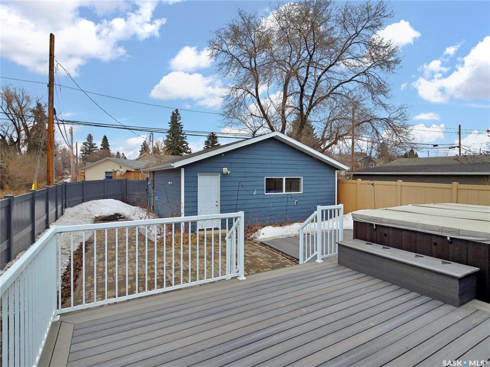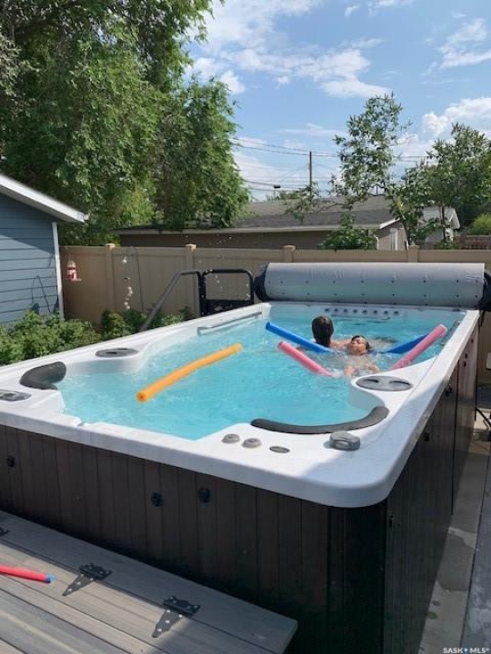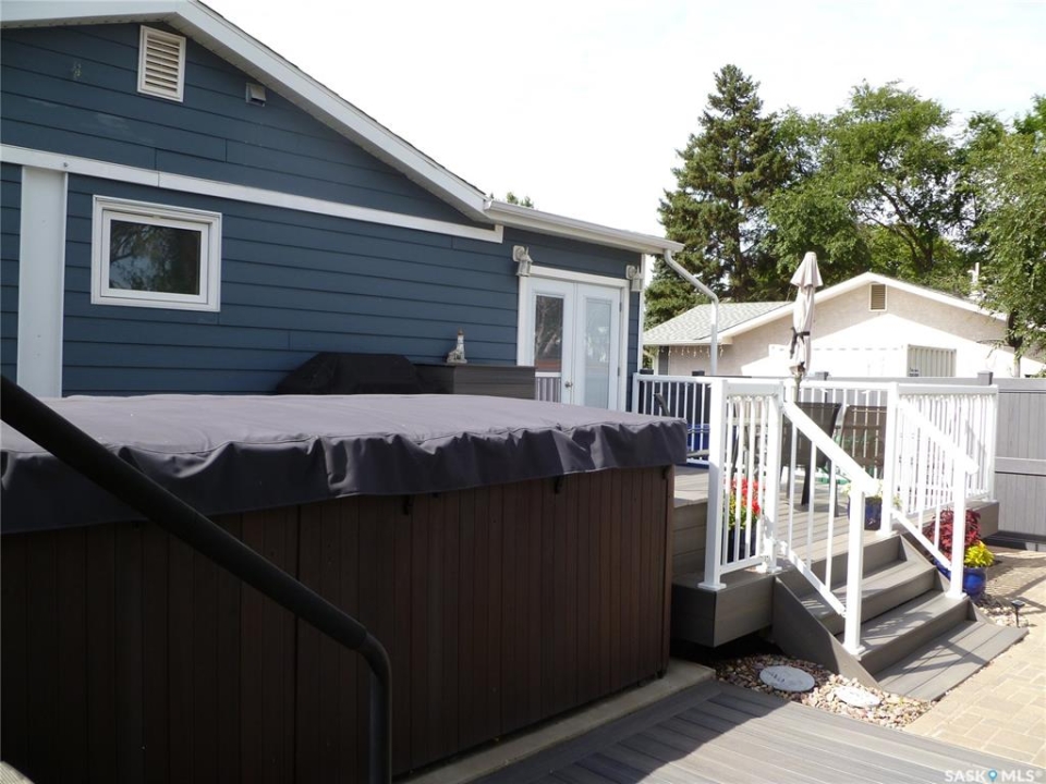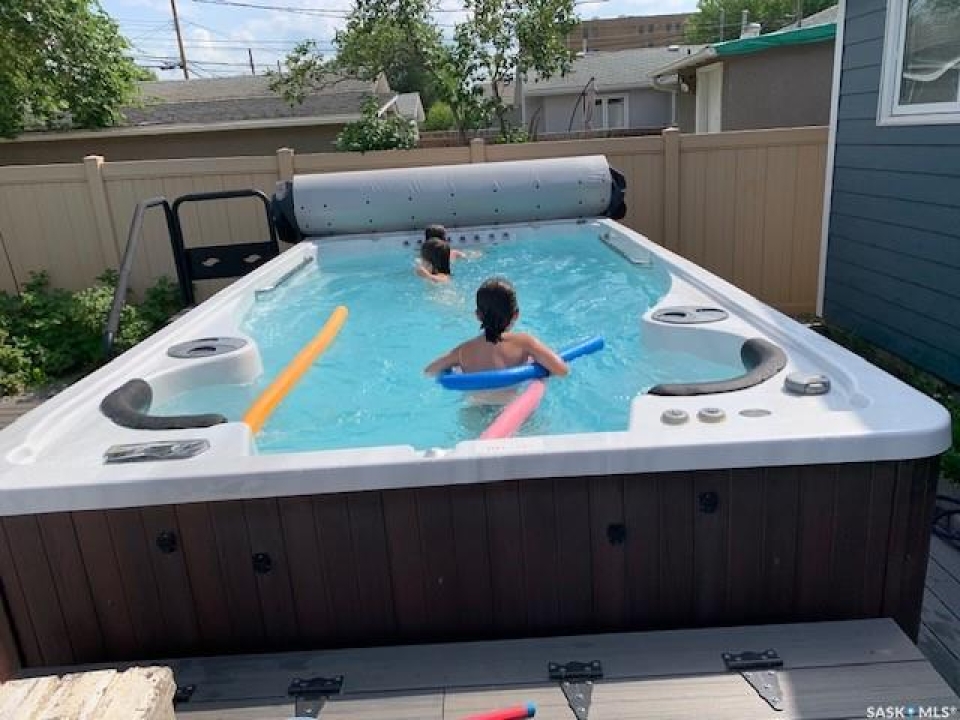 Welcome to this excellent, move-in ready bungalow, boasting a stunning backyard Hydropool Swim Spa! The main floor offers three comfortable bedrooms, a stylish IKEA kitchen outfitted with custom-cut granite countertops, a spacious great room, and a renovated bathroom. Enjoy modern updates throughout, including new flooring, windows and doors, and newer appliances. Downstairs, you'll find a laundry and mechanical room, an office and den, a large three-piece bathroom with updated shower, and a spacious family room complemented by a dedicated storage space. Upgrades in this area include windows, luxury vinyl tile flooring, flame retardant ceiling and a 200 amp electrical panel. The high-efficiency furnace, installed in December 2025, comes with transferrable warranties. OUTDOOR EXPERIENCE: Step through the garden doors from the kitchen onto a maintenance-free composite deck, ideal for relaxing beside the impressive Hydropool Swim Spa. The versatile pool is a true showpiece. It can serve as a peaceful water feature, complete with lights and a Bellagio fountain, or a hot tub that comfortably fits eight or more adults, or a refreshing pool for casual swims and play in cooler water. It can also be used to lane swim, turn on the jets and there are two lanes for swimming! This well-maintained home also has numerous exterior enhancements that contribute both to its curb appeal and functionality. Exterior upgrades include application of insulation and Hardy Board siding, plus soffits, facia and eavestroughs. The property has no maintenance vinyl fencing plus hardscaping of front and back yards, front with perennials. Updates to the double detached garage include a steel garage door and opener, exhaust fan and 220 volt plug. In addition, the alley and yard along the fence have been planted with strawberries and there are several raspberry bushes beside the garage. Excellent property, close to schools, U of S, shopping, 8th Street amenities and has easy access to Circle Drive!
