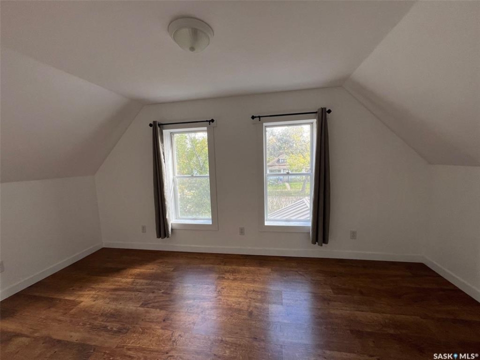 Located in Wilkie is the 1 1/2 storey home. Renovated 2 bedroom home with good workmanship. Main level has large kitchen with quartz countertop, oak cabinets, fridge & stove, cozy living room with gas stove, bright dining area, and laundry. Front and back porch. Second level has 2 bedrooms. Metal roof, vinyl siding, metal soffits. 11x25 shed in treed backyard.