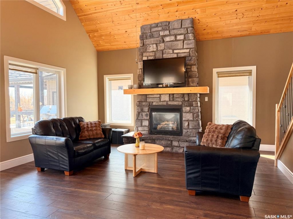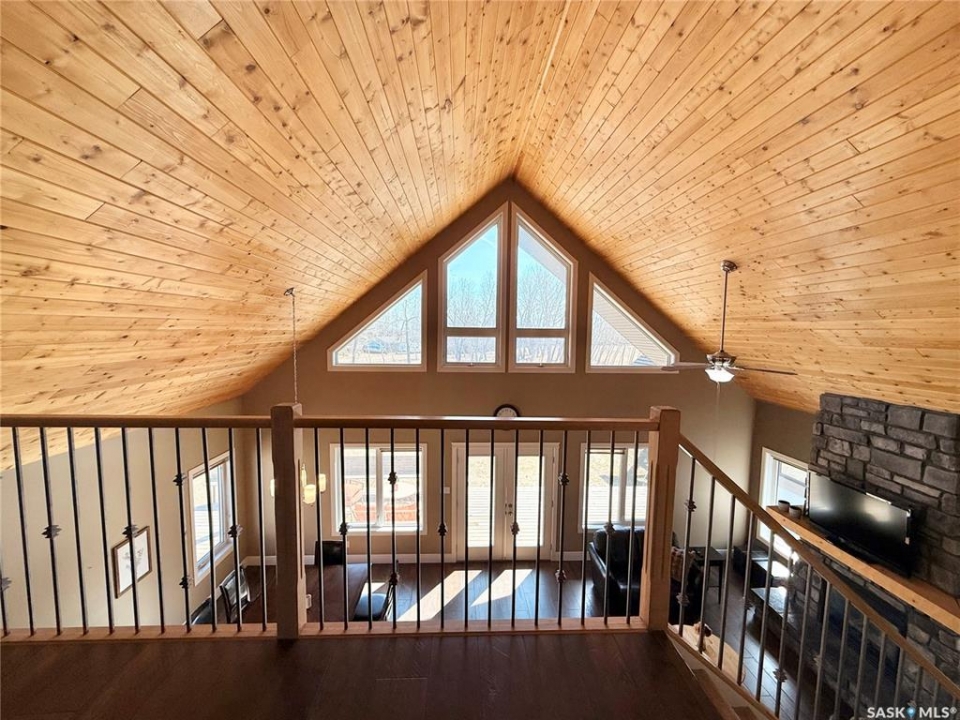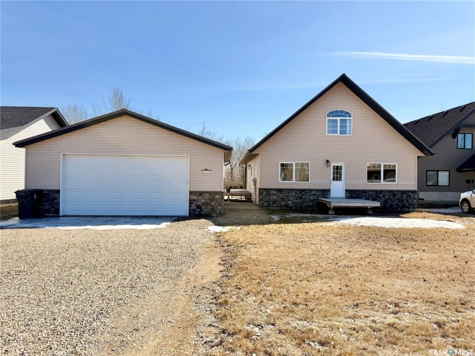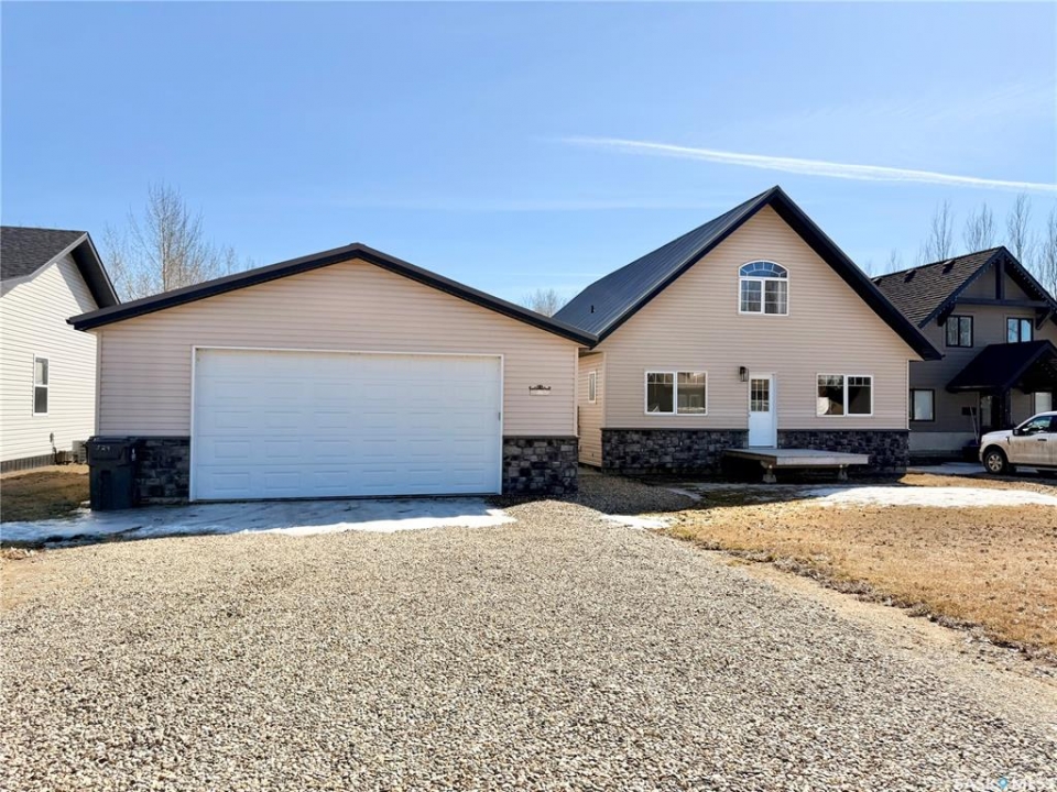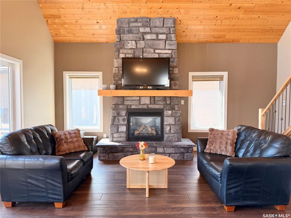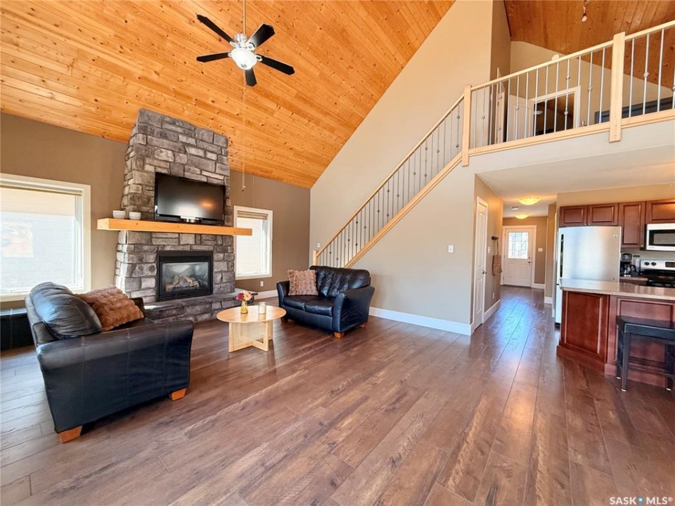 Welcome to this stunning cabin in Hitchcock Bay, offering 1,612 sq ft of inviting living space with soaring vaulted ceilings and warm pine finishes that create a true lakehouse feel. A beautiful floor-to-ceiling stone fireplace anchors the living room, adding warmth and character while large windows frame peaceful views of the surrounding green space. The open-concept main floor is designed for gathering, featuring a spacious living and dining area alongside a well-appointed kitchen with a large island, perfect for hosting family and friends after a day at the lake. Two generous bedrooms, full laundry, and a 5-piece bathroom with dual sinks complete the main level. Upstairs, the loft offers a private retreat with a spacious primary bedroom, cozy bonus sitting area, and a 4-piece bathroom, creating your own quiet escape at the end of the day. Step outside to the expansive wrap-around deck, ideal for morning coffee, evening sunsets, and summer entertaining. The 28 x 28 double garage provides ample room for vehicles, boats, and all your lake essentials. Located just a short walk to playgrounds and backing green space. Located just a short walk to playgrounds and backing green space. Hitchcock Bay offers an incredible lifestyle with access to a double boat launch, beaches, playgrounds, a 9-hole golf course, mini golf, fish filleting shack, community center, pickleball and multi-sport courts, summer programs for kids, swimming lessons, and exceptional fishing, making every season something to look forward to. Enjoy year-round potable water and high-speed internet. Call your favourite realtor to view today.