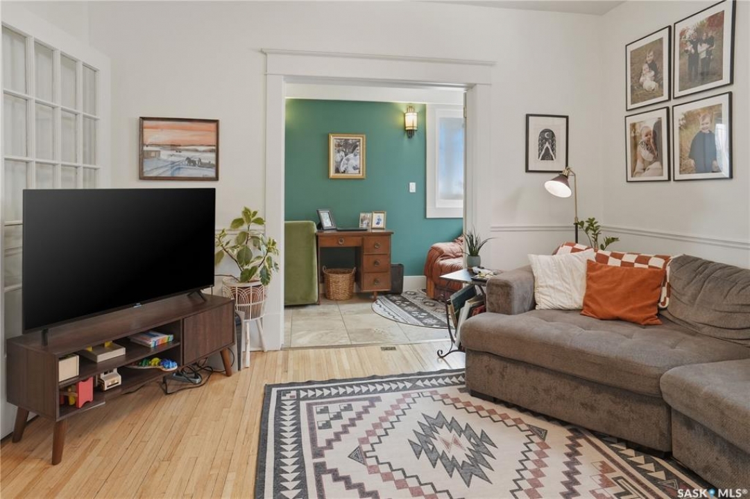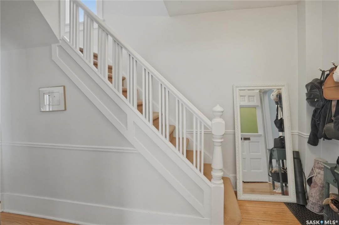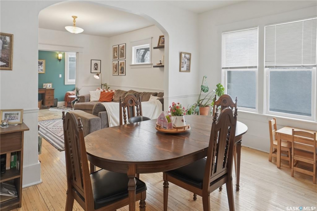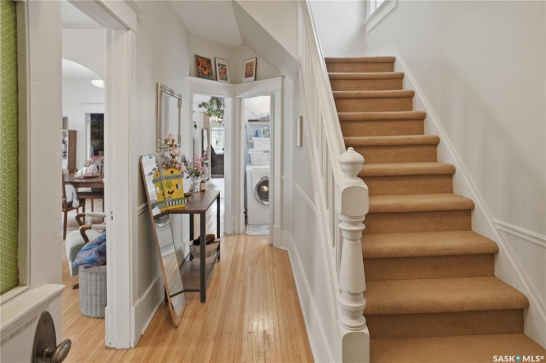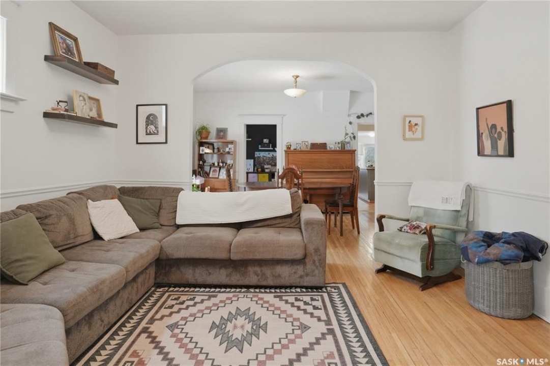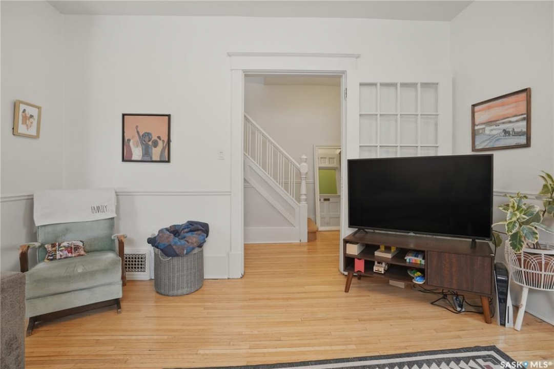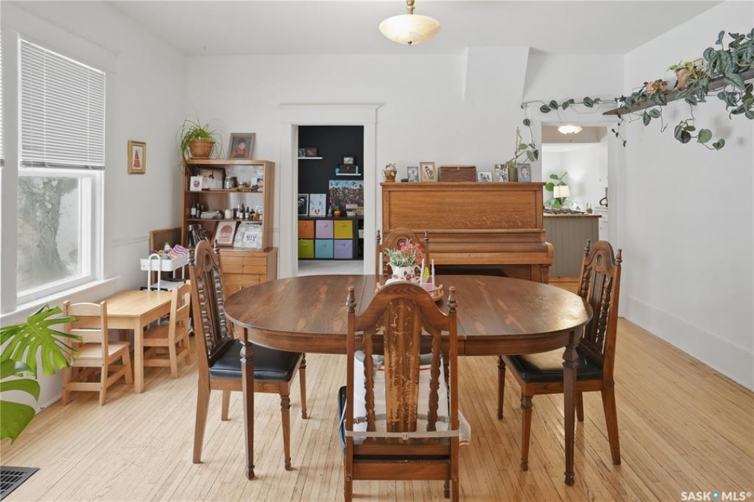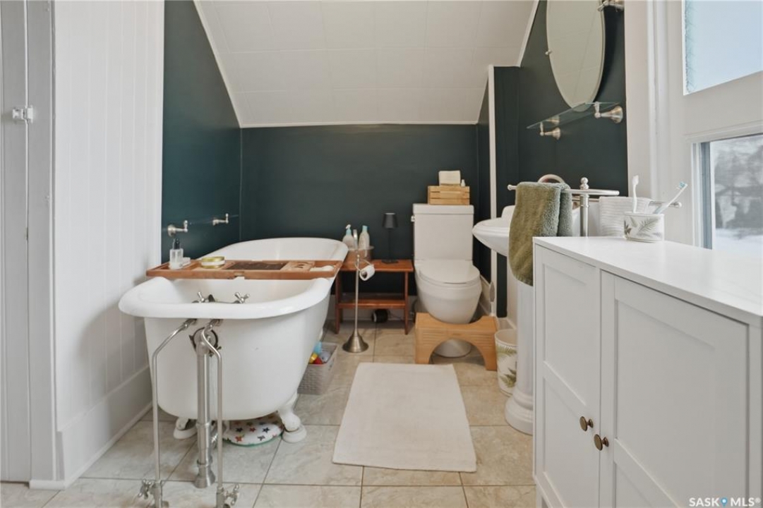 Welcome to this beautiful, well-maintained character home on the west side of North Battleford. Where timeless charm meets everyday functionality! Step inside to a spacious front entry with plenty of room for coats, shoes, and storage, making it perfect for busy households. You'll immediately notice the stunning wood banister that adds warmth and character as it leads upstairs. To the left, a bright and inviting living room flows seamlessly into a sunroom. Ideal for a home office, plant haven, or cozy reading nook. On the opposite side, the generous dining room sits just off the kitchen, creating a perfect space for hosting family dinners or entertaining guests. The kitchen features a large island and ample storage, and opens into a comfortable sitting area at the back of the home. A convenient main floor bedroom, currently used as a playroom, helps keep toys tucked away, along with a 2-piece bathroom and main floor laundry. Upstairs, you'll find three additional bedrooms and a spacious 4-piece bathroom complete with a classic clawfoot tub and a separate walk-in shower. The basement offers even more living space with a family room and plenty of storage options. This home is equipped with hot water on demand and central air conditioning for year-round comfort. Outside, enjoy a deck perfect for BBQ season, a private patio, and a fully fenced yard with green space and a small garden area. A single detached garage with an attached shop/storage space completes this fantastic property. Where classic charm, generous space, and everyday functionality come together. This is a home you won't want to miss!