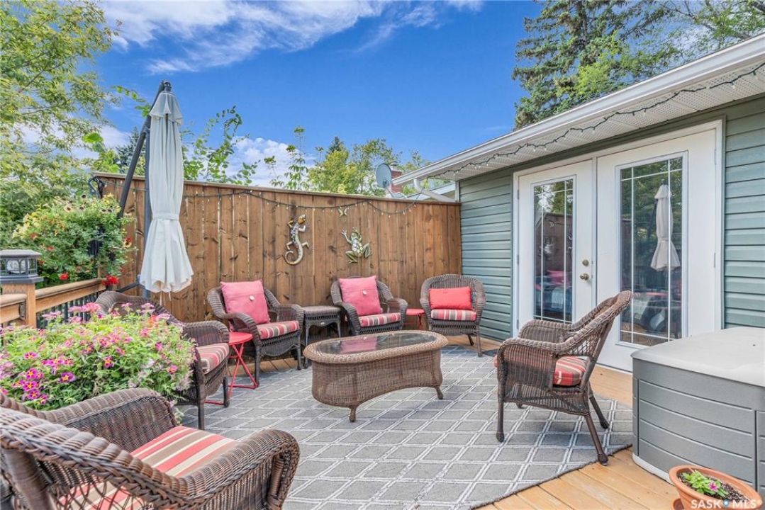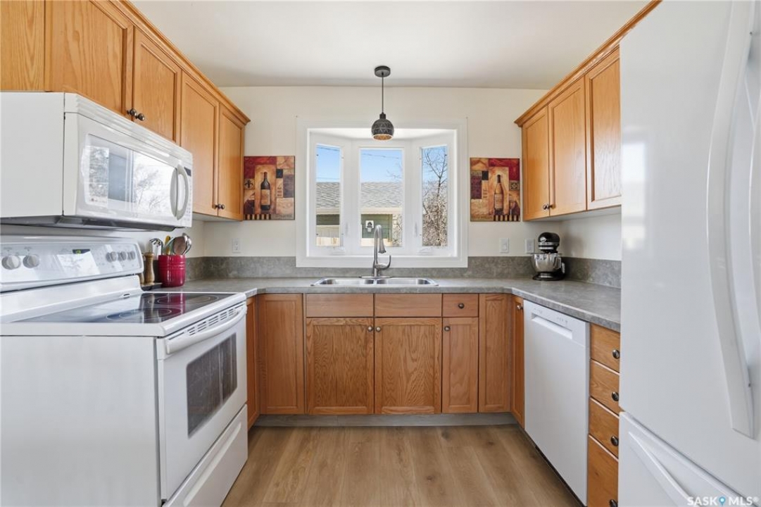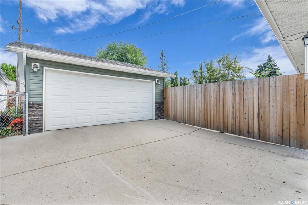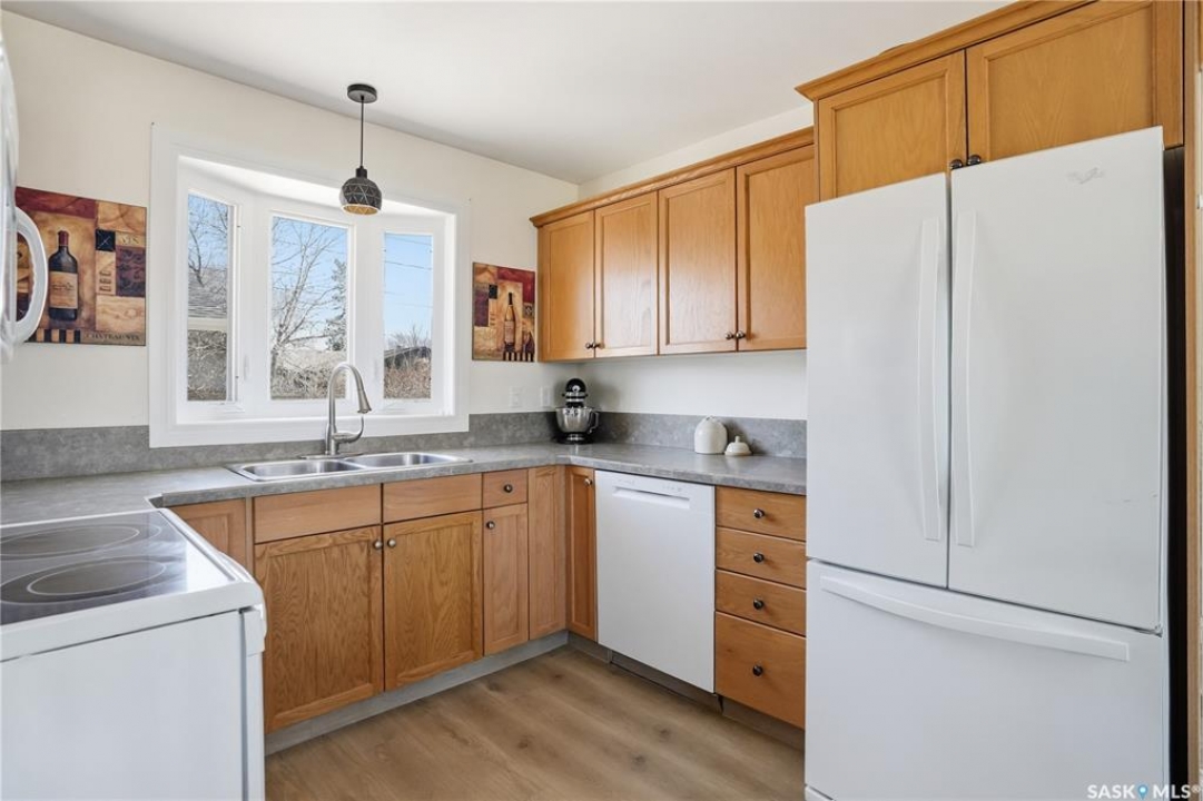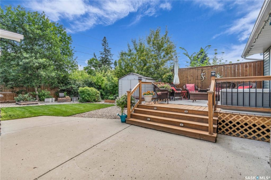 Extensively renovated 4 bedroom home with beautiful street appeal. Bright kitchen with open dining area and living room, 3 good sized bedrooms on main, doors to deck off primary bedroom, 4 pc bath has Bathfitters tub/surround, finished basement with t-bar ceiling and pot lites, large 3 pc bath, rec room, big bedroom with extra den area and walk in closet with built-ins, laundry and storage, matching double electrified garage with lots of room behind, great yard, underground sprinklers, big private deck, fire pit, fenced, basement was excavated, braced, blue skinned 3 sides, spray foamed, newer windows, shingles, electrical panel. New since 2020: Hi-eff furnace, kitchen exhaust through roof, dishwasher, wood fencing, sump pump, main floor paint, radon control, attic insulation, some lights, basement speakers, LVP in kitchen, livingroom & hall, home has rare for it's age truss roof system, smoke free home a pleasure to see. E. & OE.
