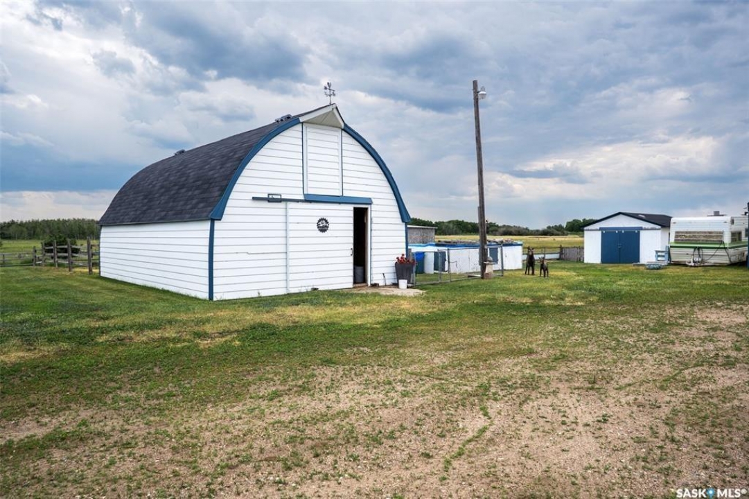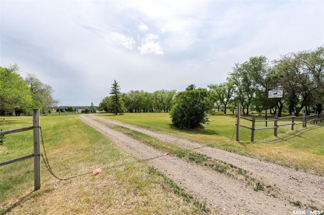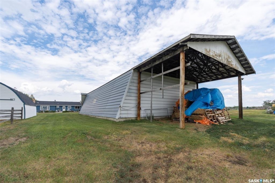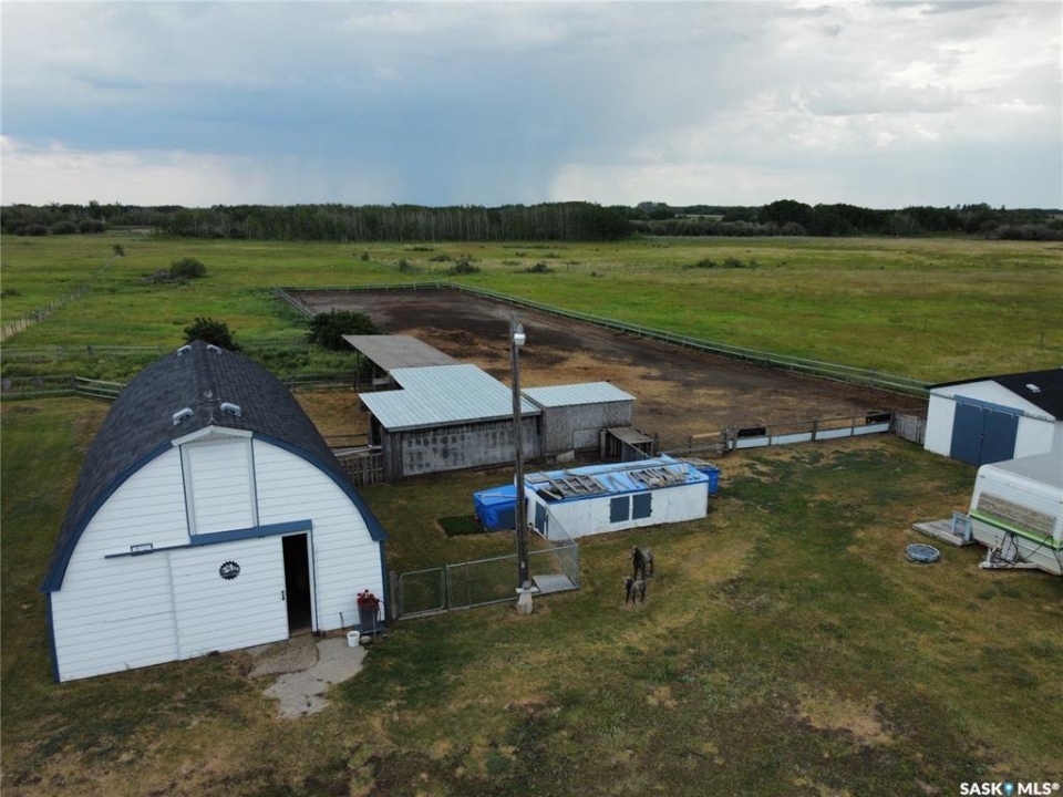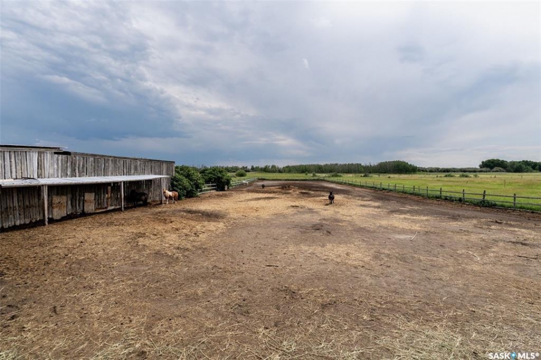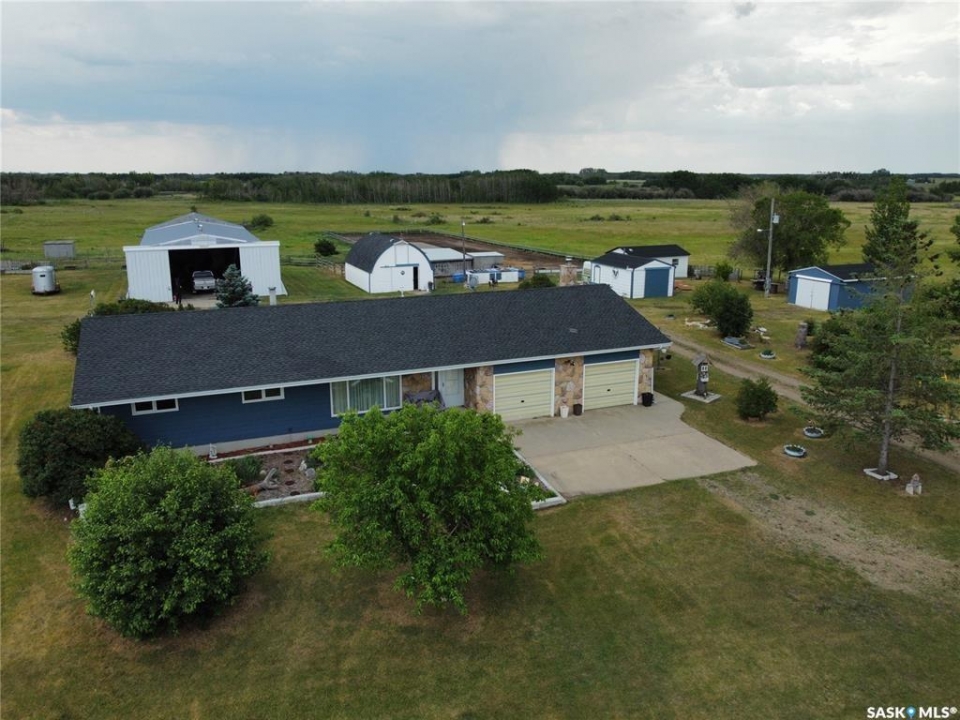 Discover 55.92 acres of opportunity on pavement just minutes from Saskatoon. This well-located property offers an excellent setup for a hobby farm, ideally suited for small livestock such as sheep or goats, with fenced and cross-fenced pasture and watering bowls already in place. The yard site is well-equipped with a massive 40' x 66' Quonset with concrete floor, multiple outbuildings, and established shelters to support a variety of agricultural uses. Functional and versatile, it's ready to accommodate your operation from day one. The solid 1,617 sq ft bungalow, built in 1973, offers generous living space and has seen key updates including siding, windows, and roof providing added efficiency and curb appeal. Nestled among mature trees with expansive prairie views, it's a comfortable and inviting place to call home. With pavement right to the driveway and close proximity to city amenities, this property delivers the perfect balance of rural living and convenience. A rare opportunity to own a well-appointed acreage in a highly desirable location.