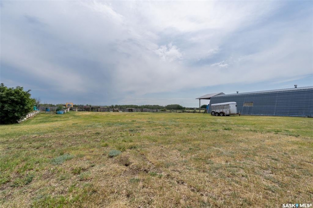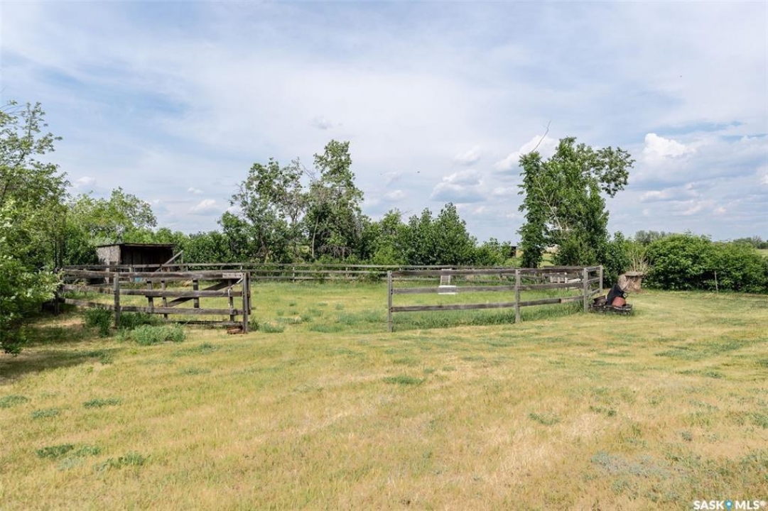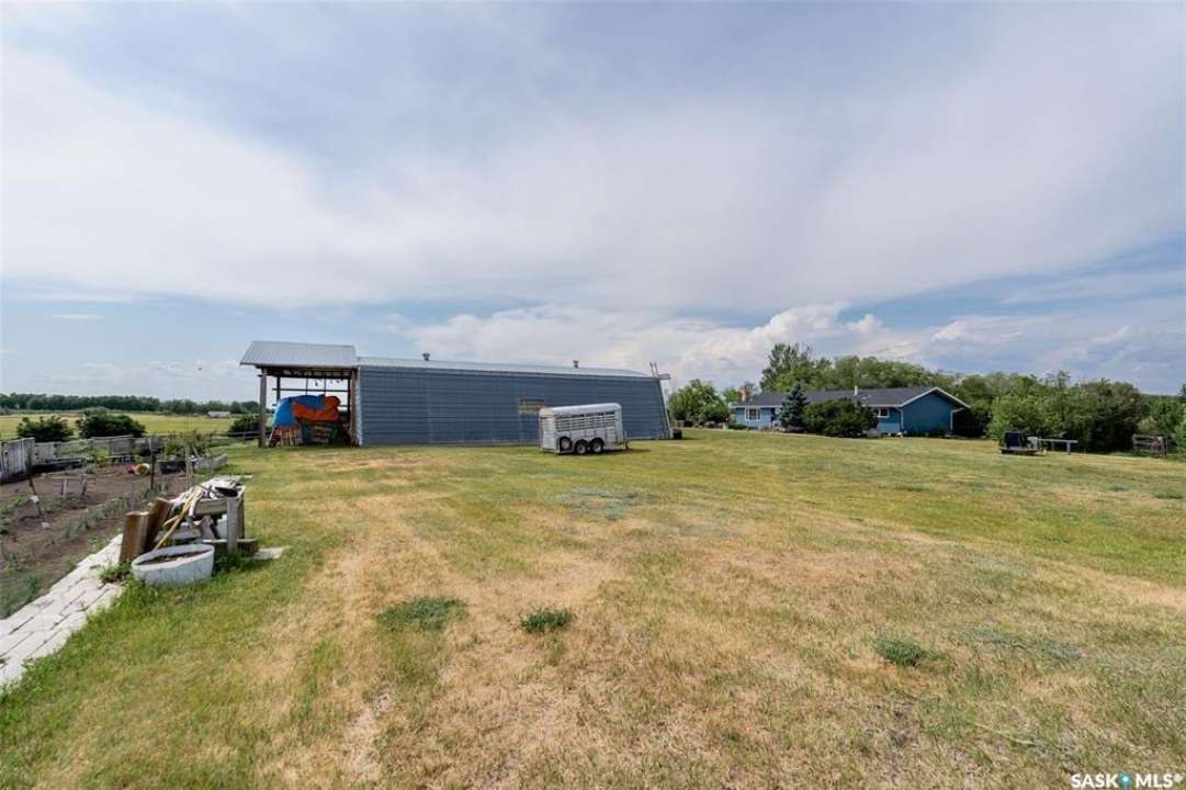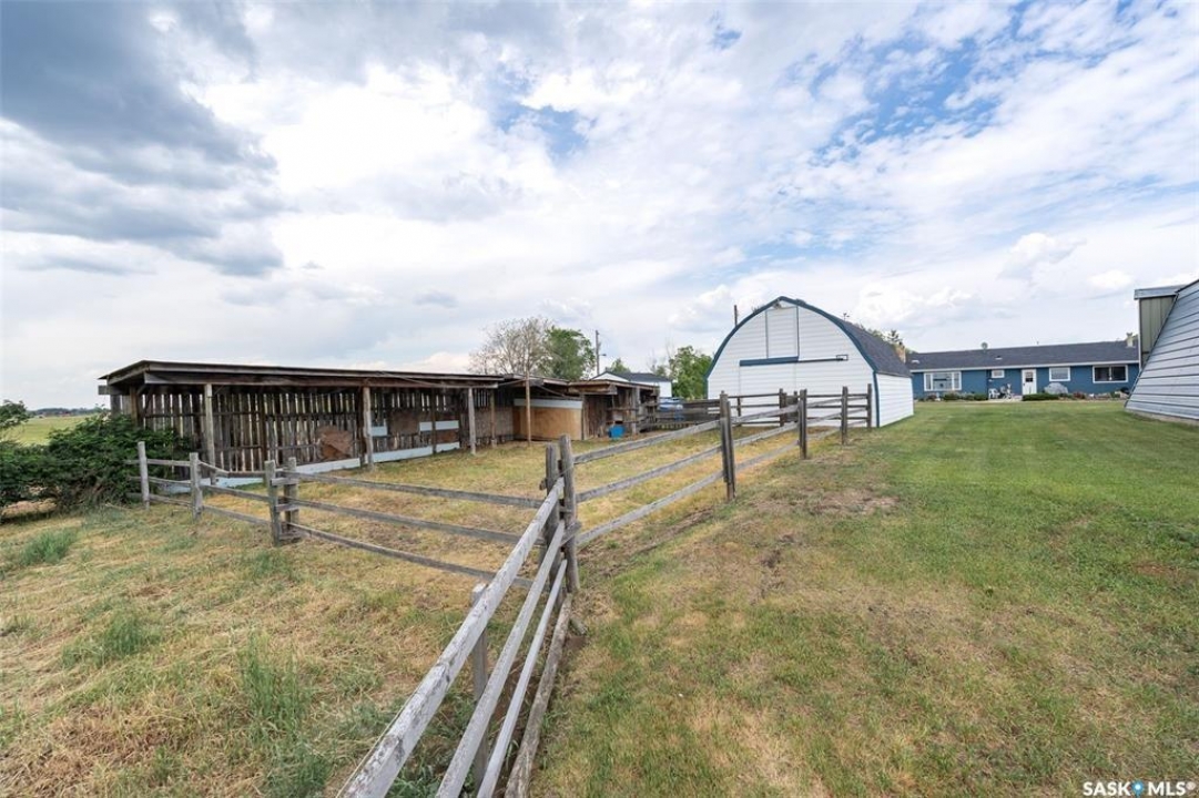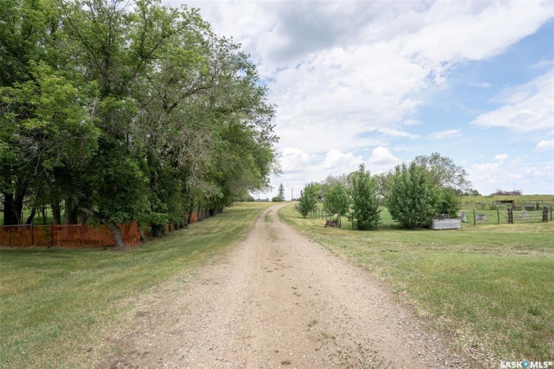 Discover 55.92 acres of opportunity on pavement just minutes from Saskatoon. This well-located property offers an excellent setup for a hobby farm, ideally suited for small livestock such as sheep or goats, with fenced and cross-fenced pasture and watering bowls already in place. The yard site is well-equipped with a massive 40' x 66' Quonset with concrete floor, multiple outbuildings, and established shelters to support a variety of agricultural uses. Functional and versatile, it's ready to accommodate your operation from day one. The solid 1,617 sq ft bungalow, built in 1973, offers generous living space and has seen key updates including siding, windows, and roof providing added efficiency and curb appeal. Nestled among mature trees with expansive prairie views, it's a comfortable and inviting place to call home. With pavement right to the driveway and close proximity to city amenities, this property delivers the perfect balance of rural living and convenience. A rare opportunity to own a well-appointed acreage in a highly desirable location.