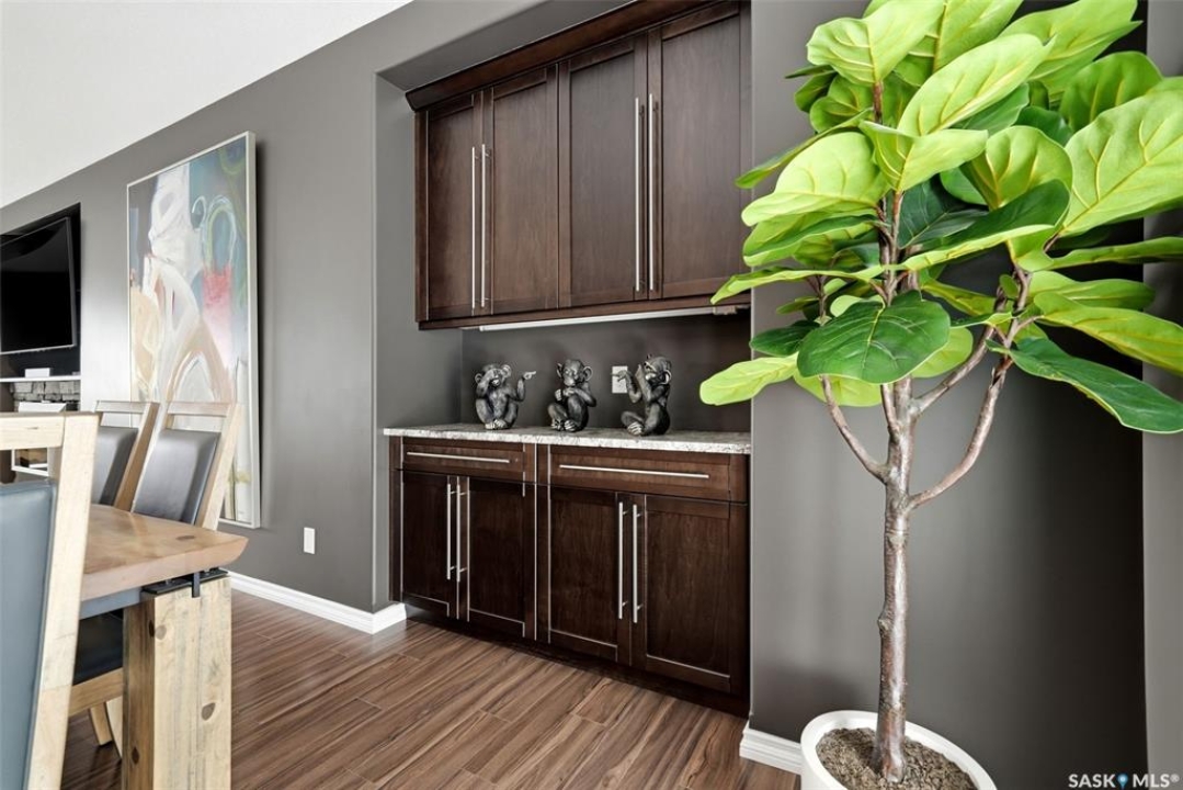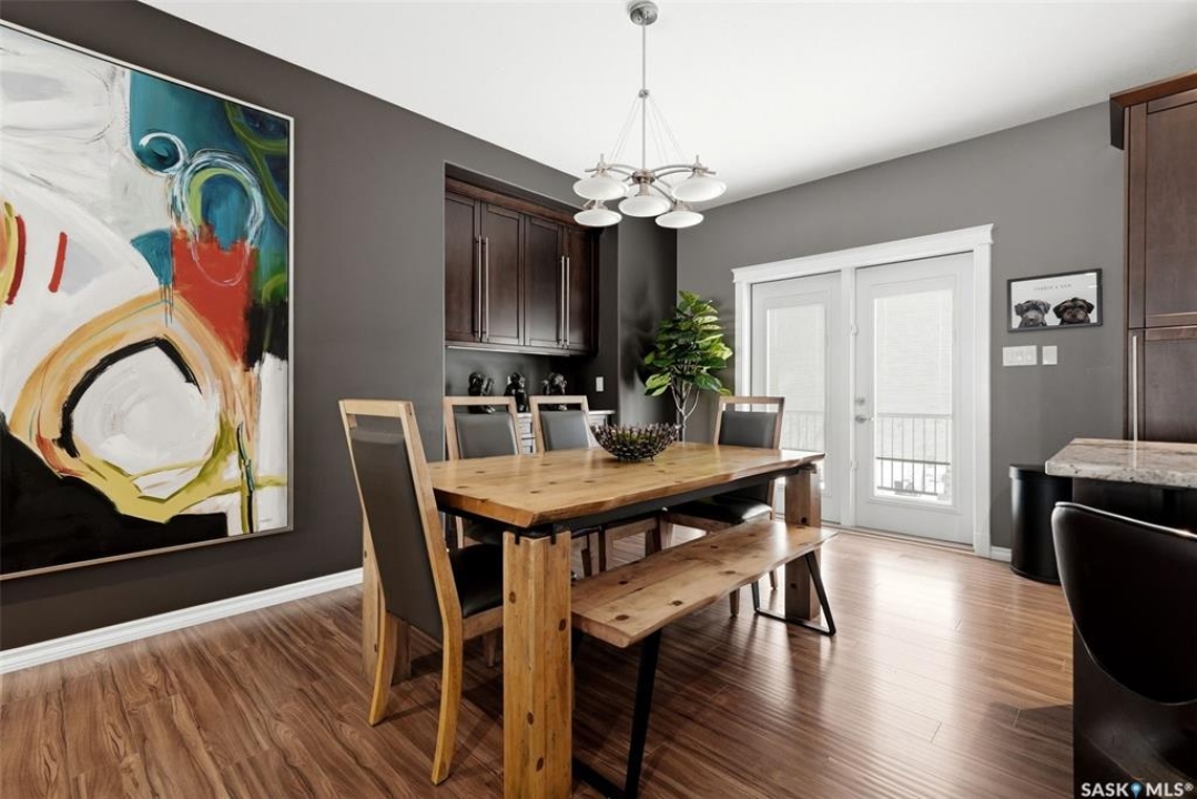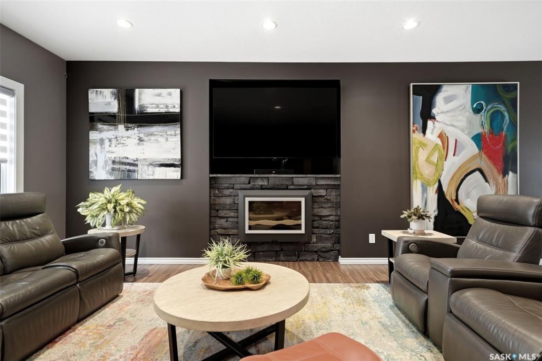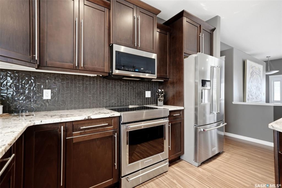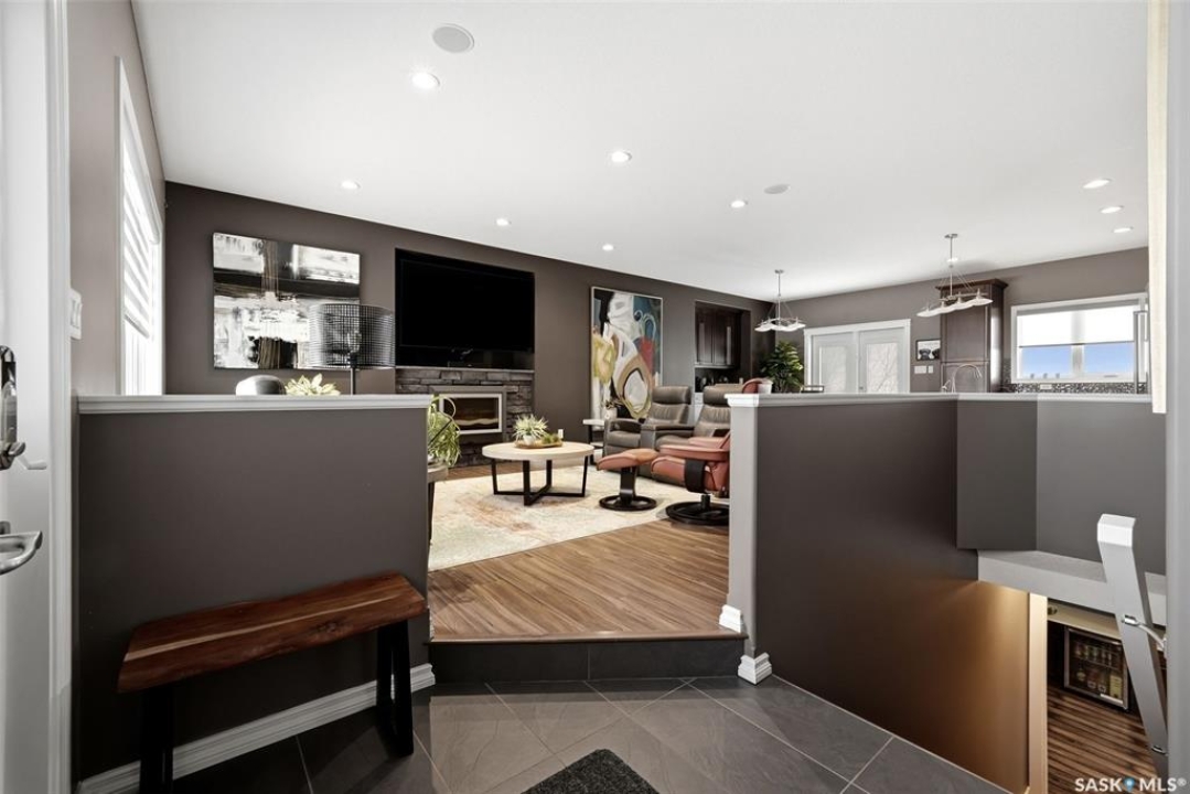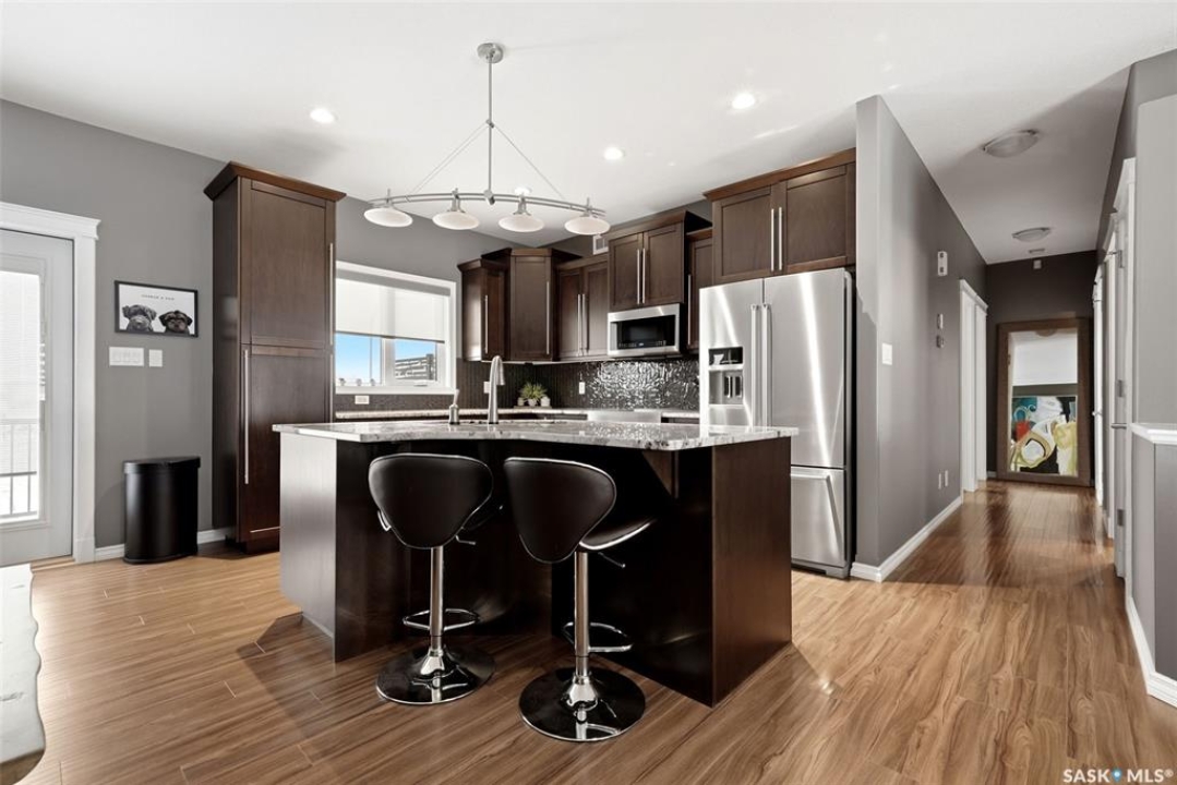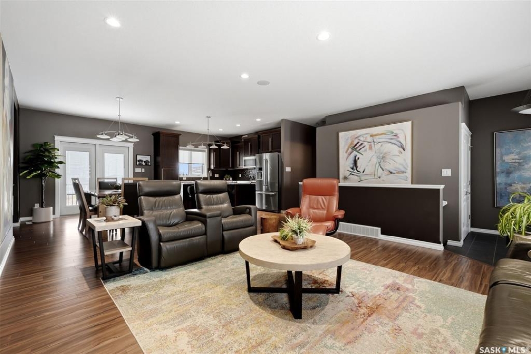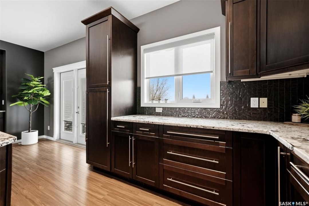 This one-of-a-kind walkout bungalow in Pilot Butte backs green space and offers a rare combination of space, layout, and pride of ownership throughout. The main floor features 1,436 sq ft with three bedrooms and a bright, functional layout. You are welcomed by a spacious entry that opens into a comfortable living room with an electric fireplace and updated, carpet-free flooring. The dining area is well-sized and provides direct access to a large deck overlooking the park and green space. The kitchen is finished with granite countertops, maple shaker cabinetry, and includes all appliances. The primary bedroom offers generous space, complete with a walk-in closet, dedicated vanity area, and a private ensuite featuring a custom tile shower. Two additional bedrooms and a full four-piece bathroom complete the main level. The walkout basement is filled with natural light and offers excellent additional living space. It includes a large recreation room ideal for a home theatre setup, a wet bar, and a flex room currently used as a gym. There is also a fourth bedroom, a full three-piece bathroom with custom tile shower, and a storage area that could be converted into a fifth bedroom if desired. The 26 x 26 double attached garage is fully insulated and features an oversized 18-foot door. The backyard is designed for low maintenance with zero-scaping, a large upper deck, and a lower patio area, all backing directly onto green space and a park. Additional features include a motorized awning (16x10), triple-pane windows, upgraded exterior doors (22), new metal fence (2023), updated deck flooring, and kitchen appliances within the past few years. Pilot Butte also offers RO water service to the community. Properties like this rarely come available reach out for your personal showing today.