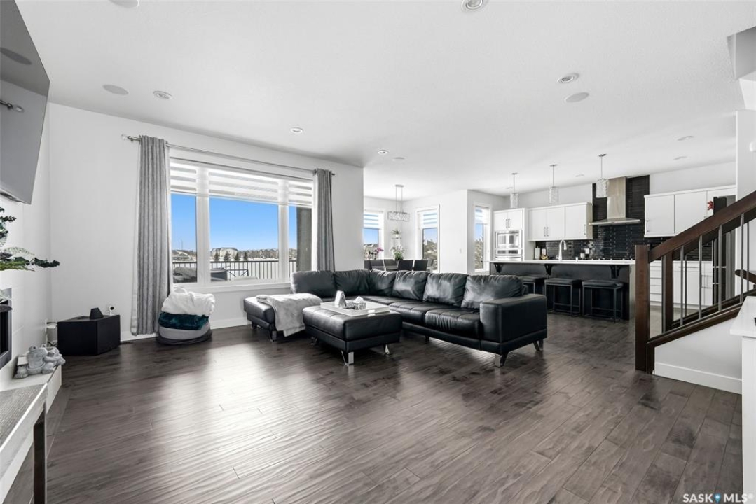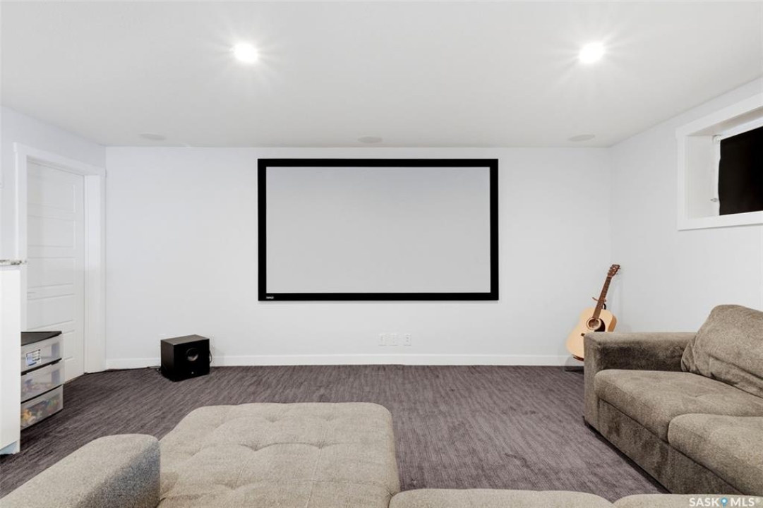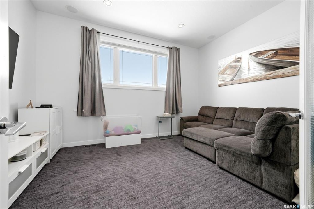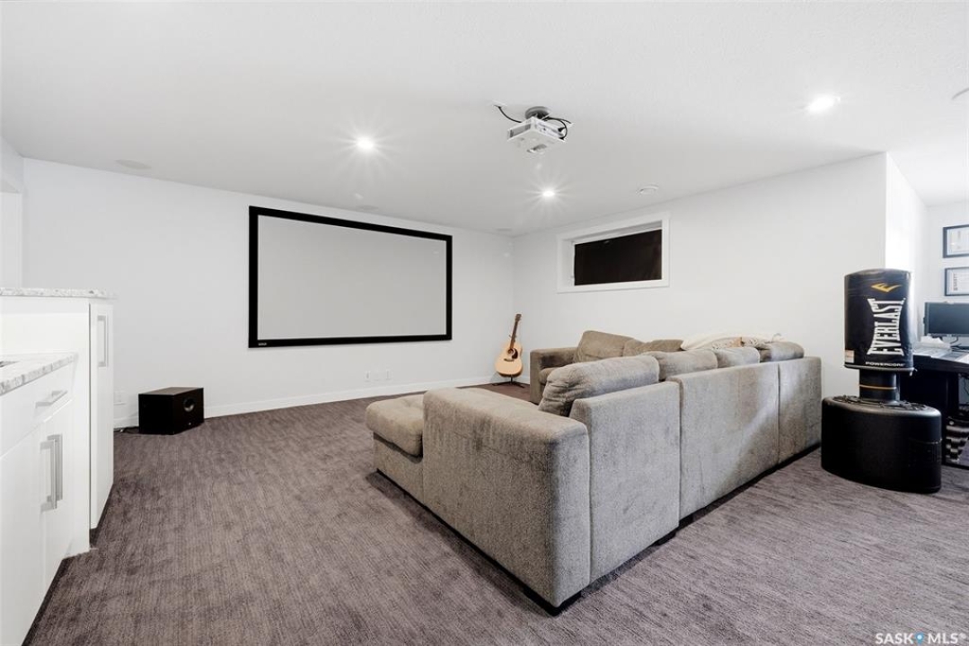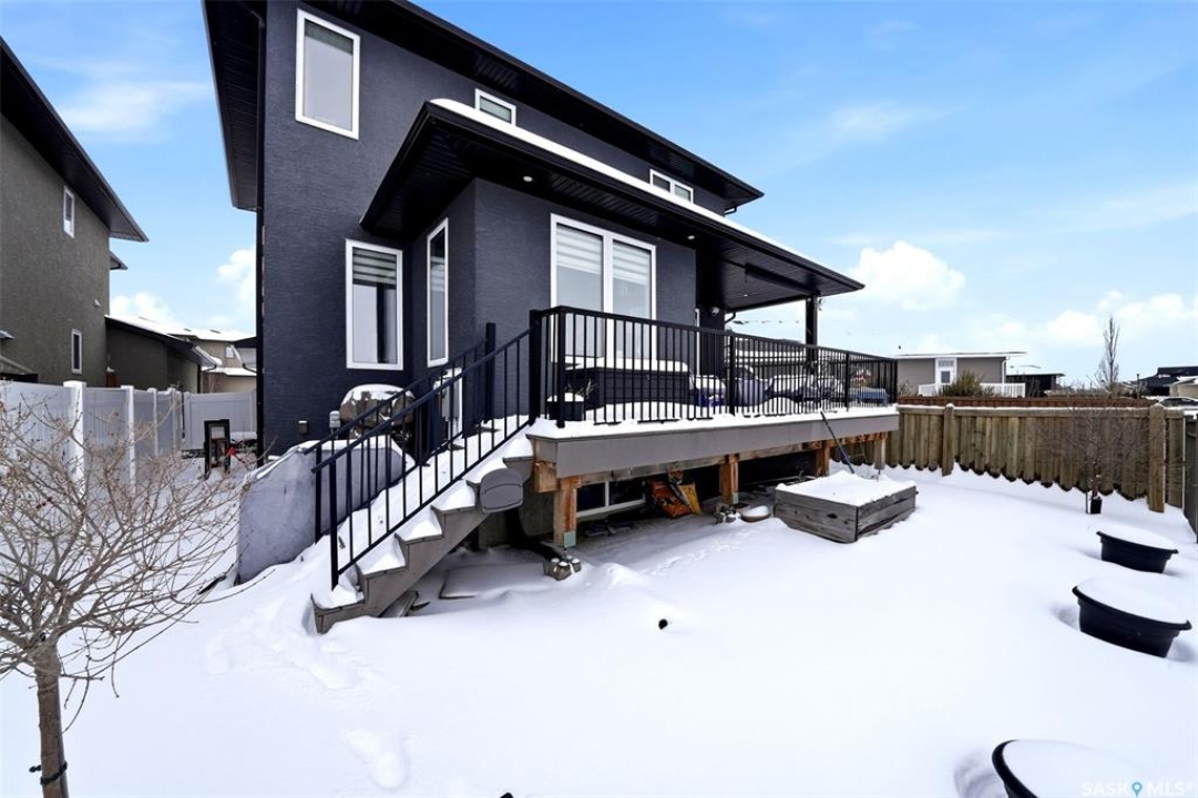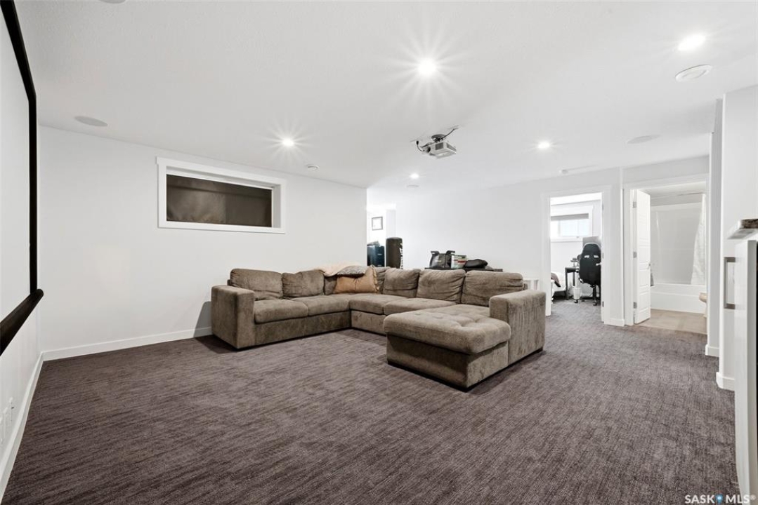 Have you been coming up empty in your search for the perfect family home? Your wait is over. This stunning, modern home—crafted by the award-winning Deveraux Homes in Regina—offers 2,023 sq ft of thoughtfully designed living space and a unique, reimagined 5-level split layout that maximizes both function and flow in a way that truly must be experienced in person. Fully and professionally developed by the builder, this home backs directly onto Havilland Park—giving your kids the ultimate backyard and you the rare luxury of no rear neighbours, all enjoyed from your covered deck. Step inside to a spacious, welcoming entryway designed with everyday family life in mind. The main floor features an open-concept design, anchored by a beautifully appointed chef's kitchen complete with built-in appliances, a large island, timeless white cabinetry, and hand-scraped hardwood floors that add warmth and sophistication while complementing the modern colour palette. Upstairs, the bonus room above the garage offers the perfect retreat for movie nights or relaxing with family. Just a few steps further, you'll find three generously sized bedrooms along with the conveniently located laundry room—an added touch of practicality in this well-planned layout. The primary suite is a true escape, featuring a walk-through closet and a luxurious 5-piece ensuite with a tiled shower. The lower level continues to impress, with a functional mudroom-style garage entry featuring built-in lockers and additional storage. The professionally developed basement is ideal for entertaining or unwinding, currently set up as a home theatre, and includes a spacious rec room, fourth bedroom, full bathroom, and a dedicated office nook, plus ample storage throughout. Built to an exceptional standard, this home is loaded with upgrades including built-in AV, a covered deck, custom blinds, a Blueskin foundation, and more—delivering comfort, style, and quality in every detail.