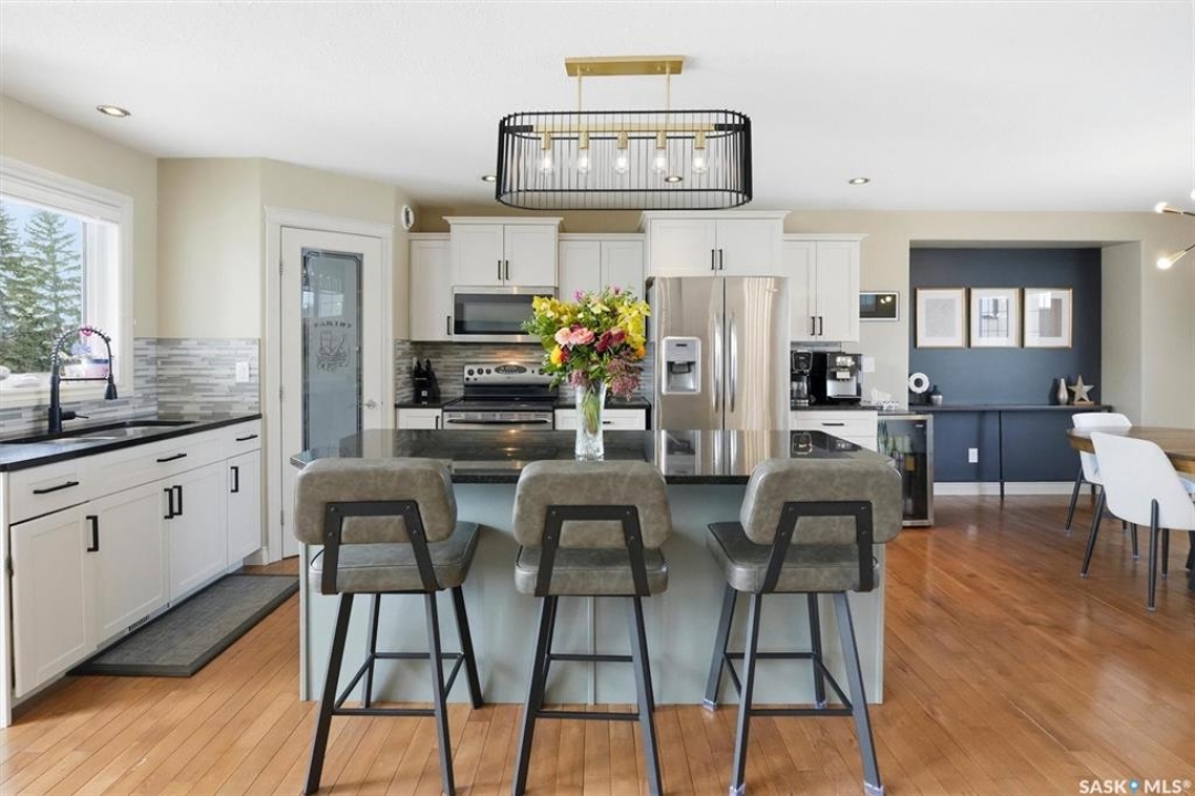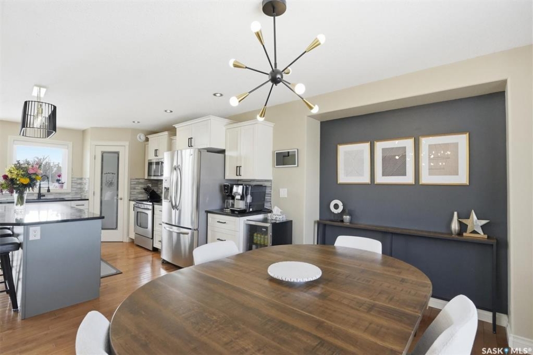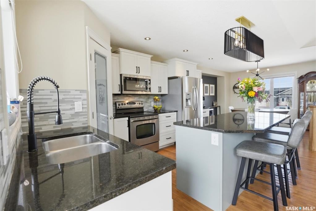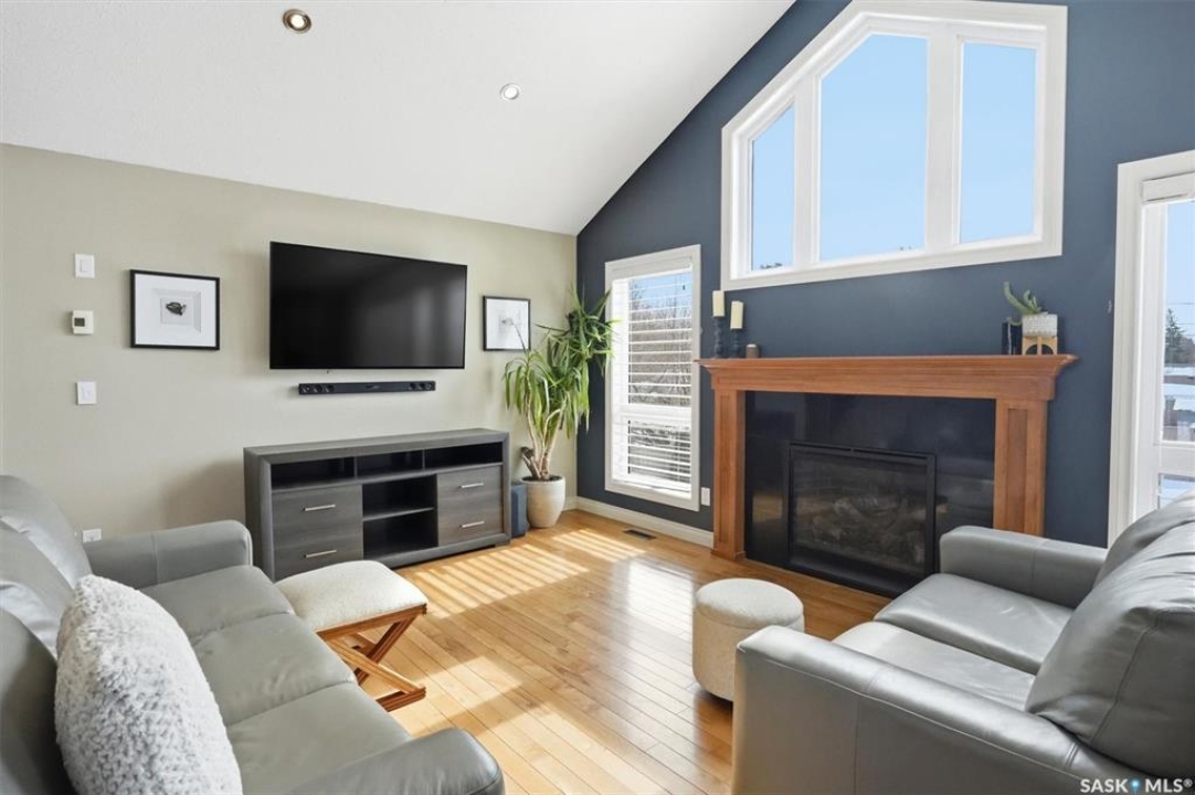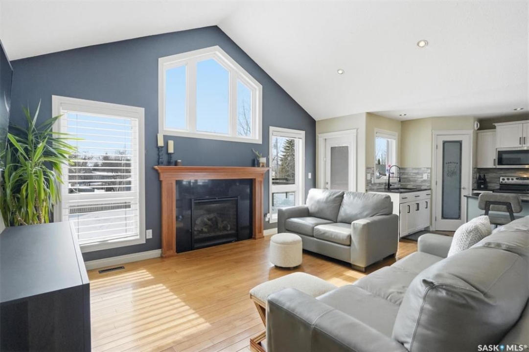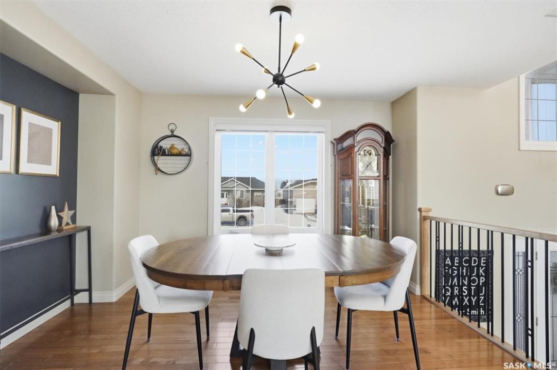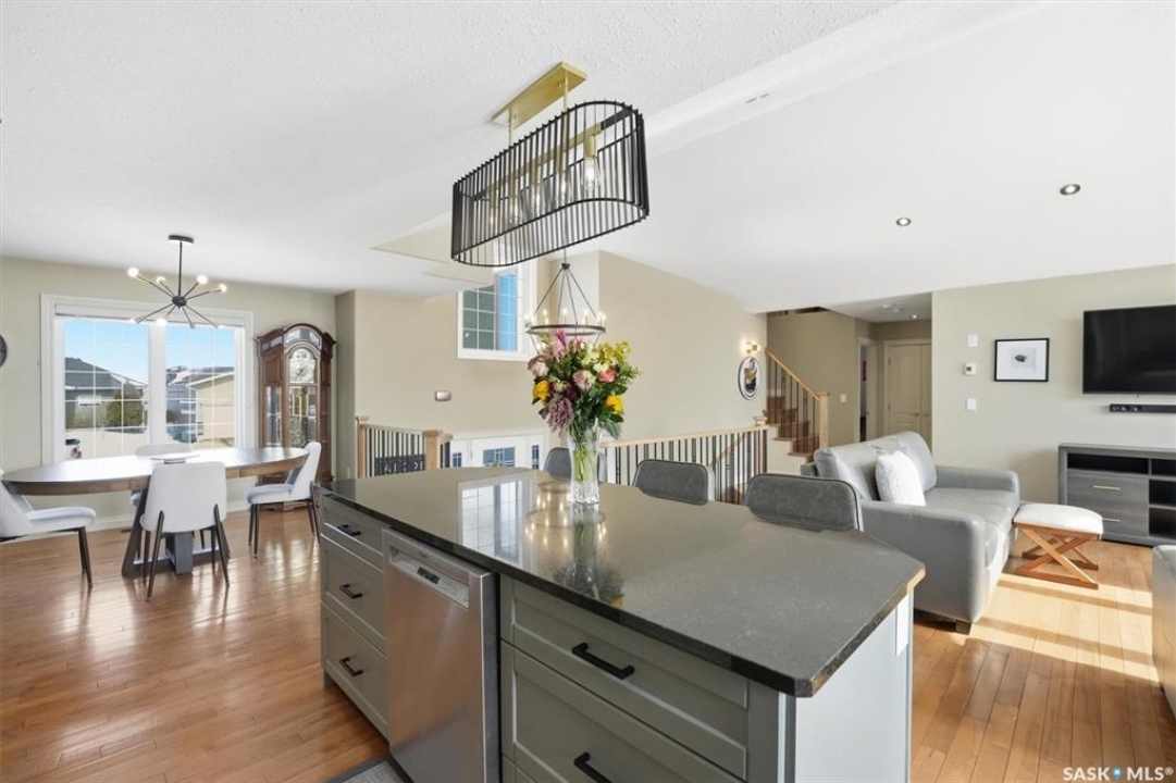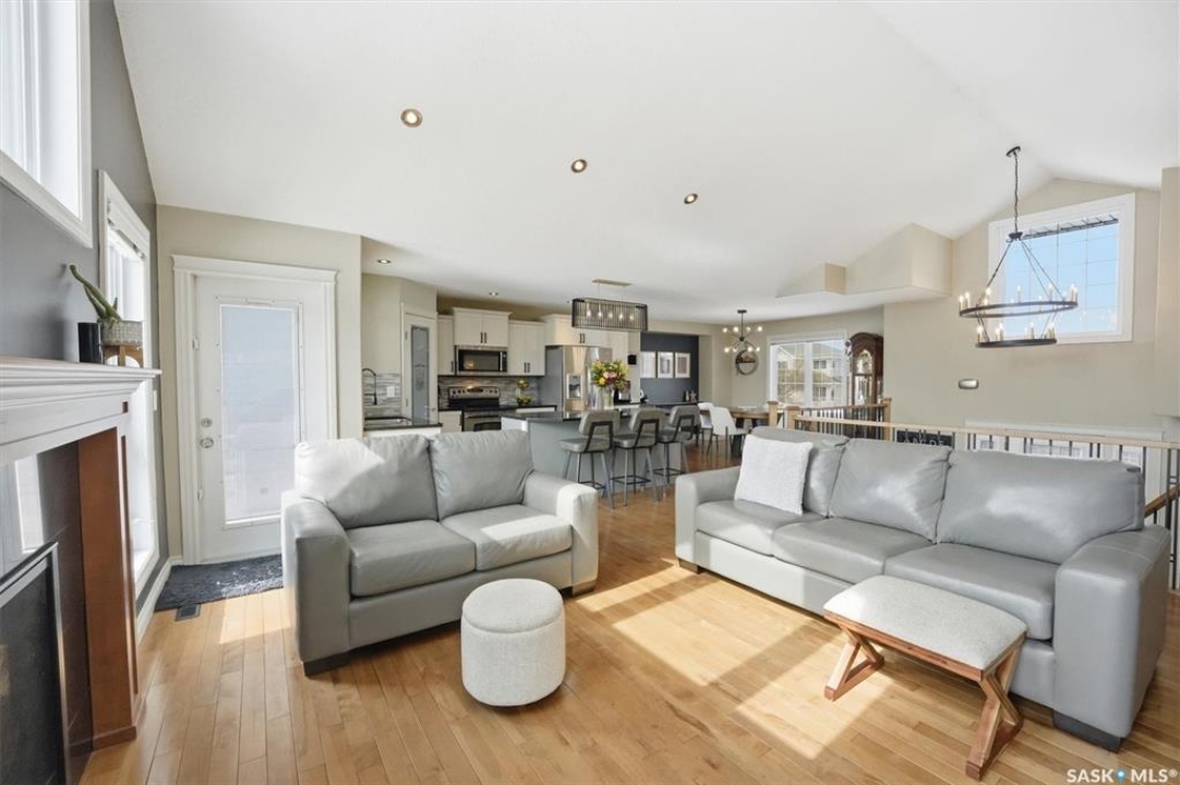 Absolutely stunning home in the vibrant and growing community of Dalmeny, just 12 minutes from Saskatoon. Tucked away on a quiet street, this beautifully designed modified bi-level walkout offers a perfect blend of style, space, and functionality for family living. Boasting five bedrooms plus a den and three full bathrooms, there's room for everyone. The private primary retreat, featuring vaulted ceilings, is thoughtfully positioned above the garage, while two additional bedrooms are conveniently located on the main floor. The bright, open-concept living area is warm and inviting, highlighted by a cozy gas fireplace, rich hardwood flooring, ceramic tile, and a well-appointed kitchen complete with maple cabinetry and sleek black granite countertops. A spacious mudroom off the double attached garage with in-floor heat adds everyday convenience. The fully developed, walk-out basement extends the living space with a bright family room, gym area, two more bedrooms, a den, a full bathroom, plush carpeting, ceramic tile, and the added comfort of in-floor heating. Quality craftsmanship is evident throughout, with features such as triple-pane windows, a tankless water heater, high-efficiency furnace, central air conditioning, central vacuum, and underground sprinklers. Step outside to a beautifully landscaped backyard designed for entertaining, featuring a sunken patio, RV parking, a firepit area, and a deck off the kitchen with a natural gas hookup. Completing the property is a triple driveway and a 16' x 16' detached garage with back alley access. This exceptional home truly has it all.