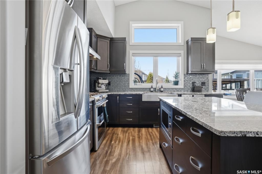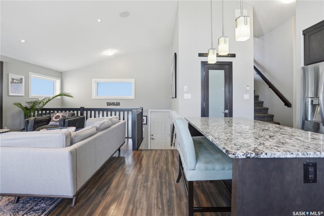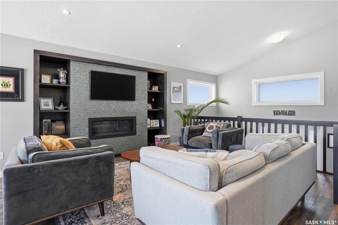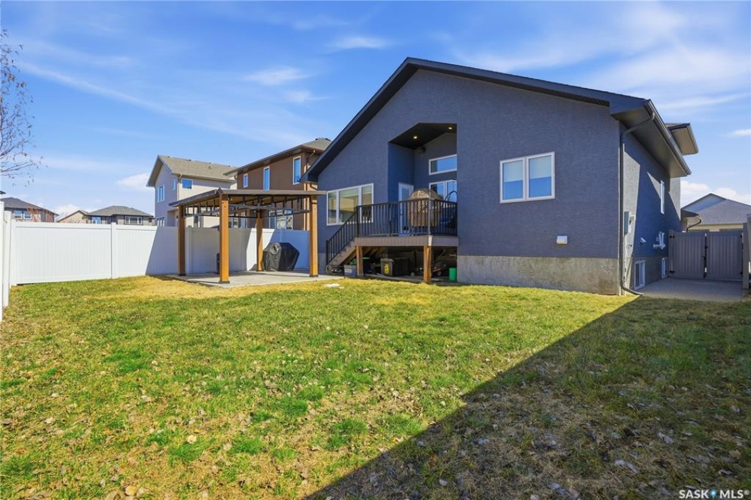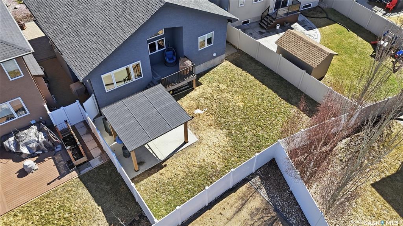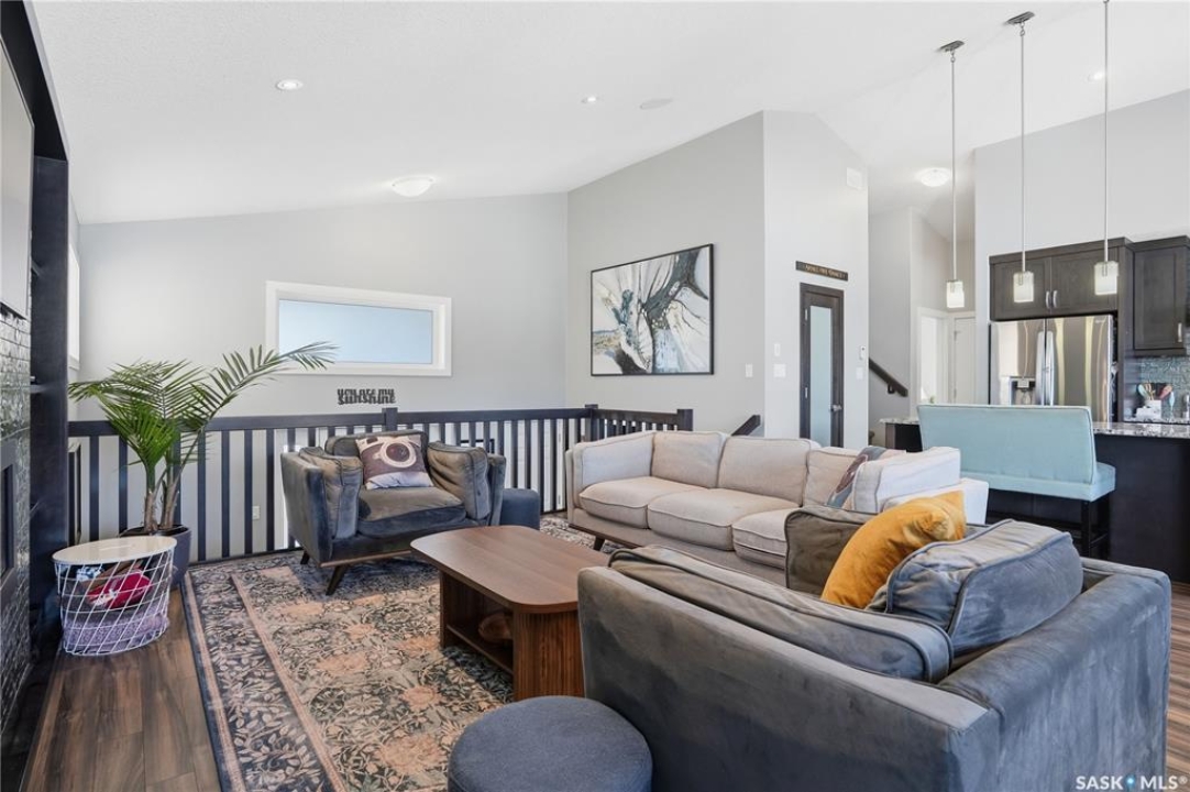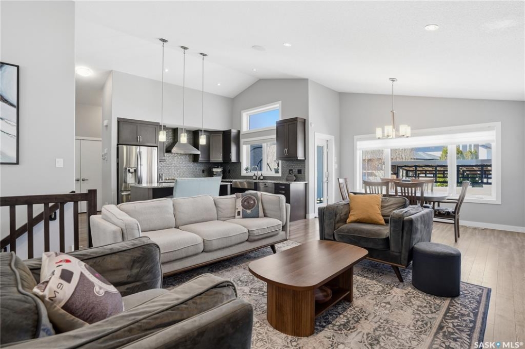 This custom modified bi-level was designed by Robinson Residential and built by Harmony Builders to a standard that's immediately apparent. If your family has outgrown your current home, this is worth a close look. The main level opens with a generously proportioned tiled entrance, direct garage access, and a large mudroom. Vaulted ceilings and an open concept layout draw in natural light throughout the day, flowing through the living area with laminate flooring, a natural gas fireplace, and a custom kitchen with large granite island, glass tile backsplash, under-cabinet lighting, and stainless steel appliances including a gas range. Two additional bedrooms on this level both include built-in closet shelving. Upstairs, the primary bedroom includes a large walk-in closet, in-ceiling speakers, plush carpet, and a hotel-inspired ensuite with heated tile floors, tiled walk-in shower, and oversized rain shower head. Second floor laundry with front-loading washer and gas dryer. The thoughtfully finished lower level adds an inviting rec and media room with wet bar, two additional bedrooms, and exceptional storage throughout. Construction highlights include an open web truss floor system, 2" exterior styrofoam insulation ($18k upgrade), and acrylic stucco, built for both durability and energy efficiency. Tankless water heater and water softener included. Outside: PVC fencing, eco turf, and a gazebo: low maintenance and designed for entertaining. 26 x 26 garage is insulated with Roxul for sound proofing. Triple exposed aggregate driveway with added value RV parking on the side. Walking distance to schools, parks, and the Joanne Goulet Golf Course.