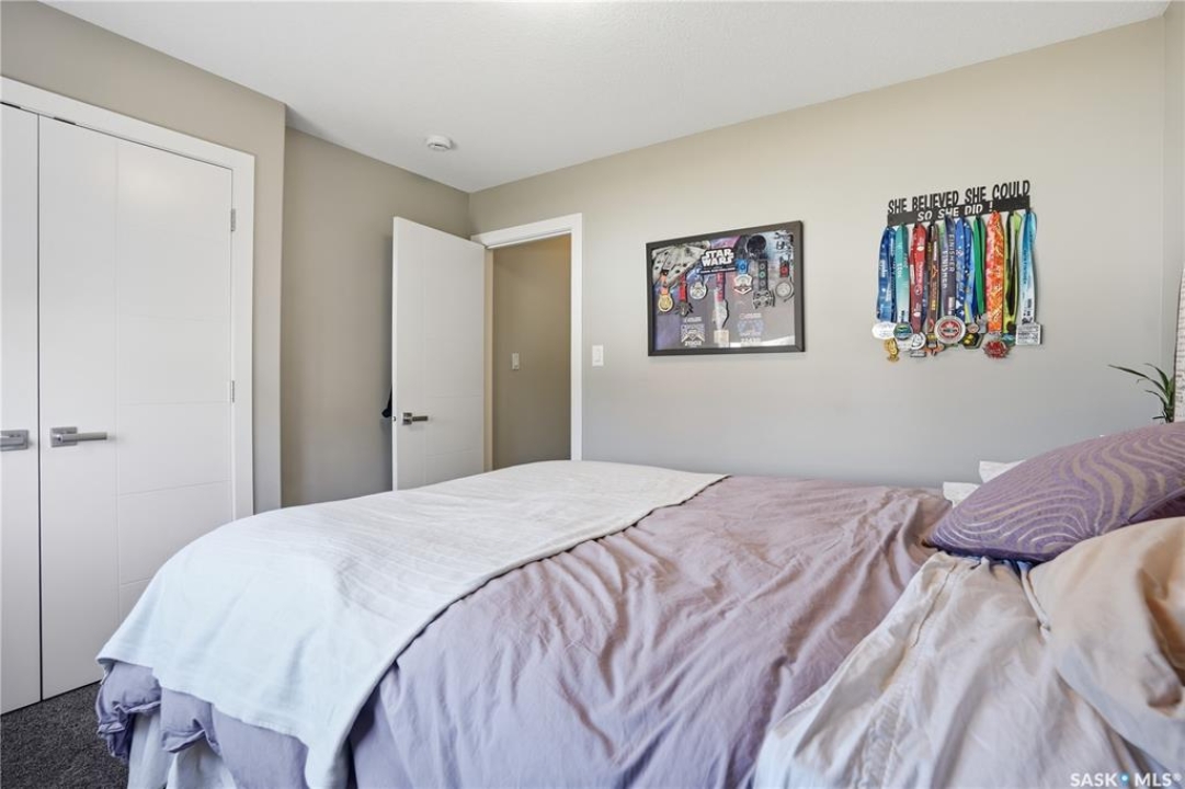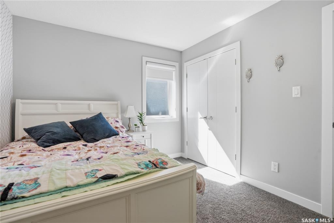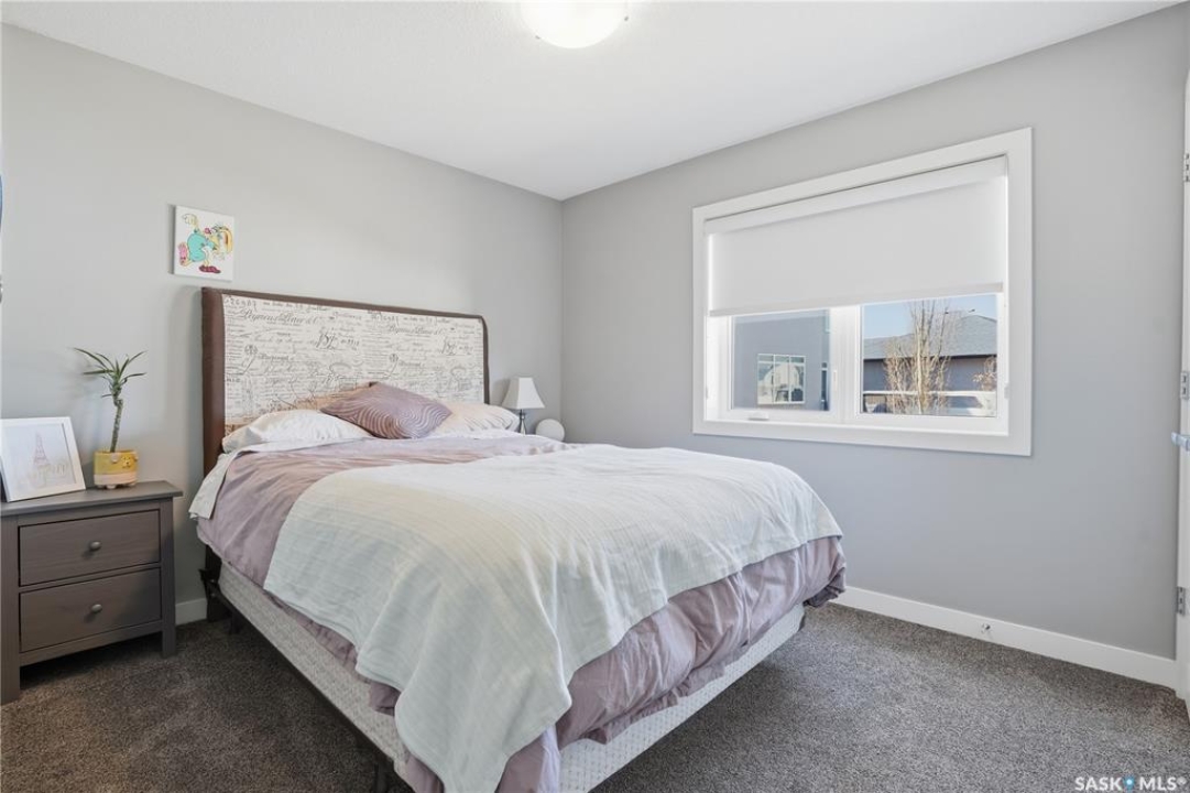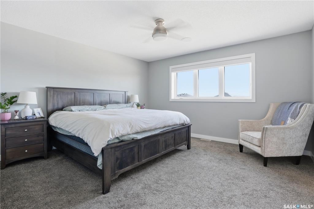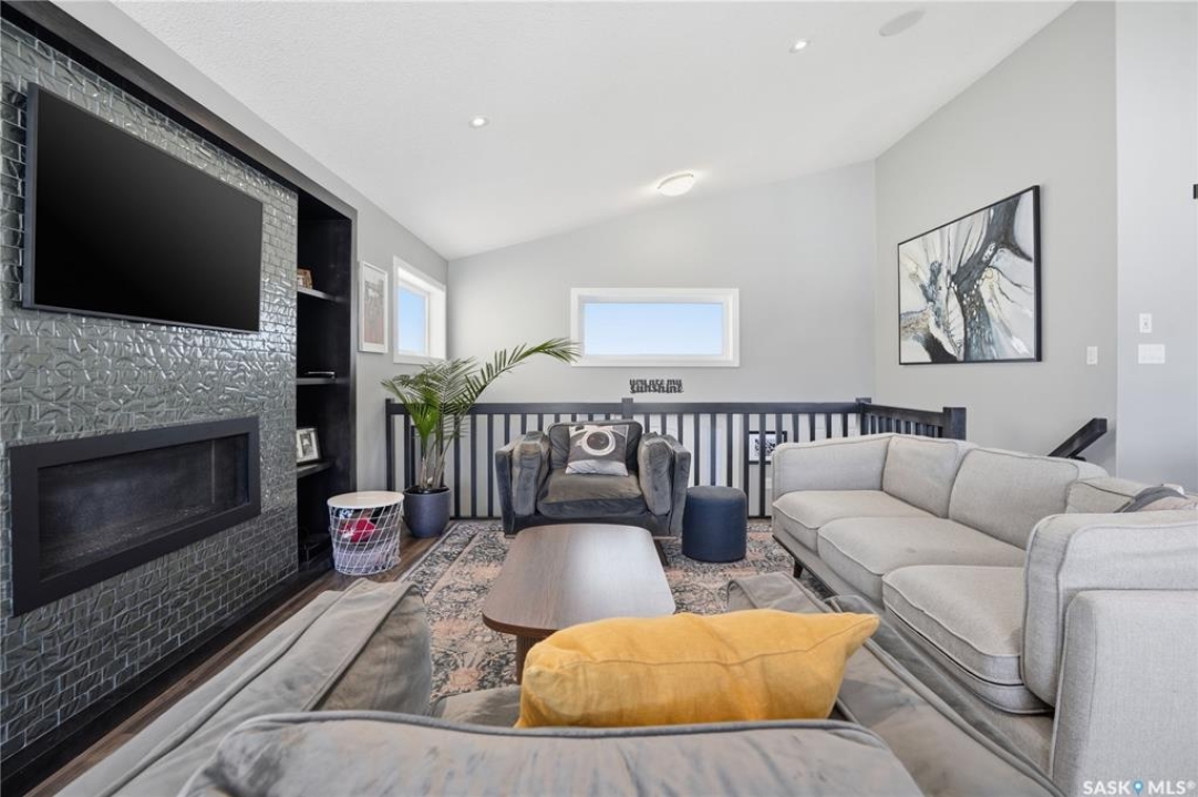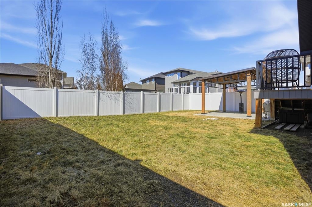This custom modified bi-level was designed by Robinson Residential and built by Harmony Builders to a standard that's immediately apparent. If your family has outgrown your current home, this is worth a close look. The main level opens with a generously proportioned tiled entrance, direct garage access, and a large mudroom. Vaulted ceilings and an open concept layout draw in natural light throughout the day, flowing through the living area with laminate flooring, a natural gas fireplace, and a custom kitchen with large granite island, glass tile backsplash, under-cabinet lighting, and stainless steel appliances including a gas range. Two additional bedrooms on this level both include built-in closet shelving. Upstairs, the primary bedroom includes a large walk-in closet, in-ceiling speakers, plush carpet, and a hotel-inspired ensuite with heated tile floors, tiled walk-in shower, and oversized rain shower head. Second floor laundry with front-loading washer and gas dryer. The thoughtfully finished lower level adds an inviting rec and media room with wet bar, two additional bedrooms, and exceptional storage throughout. Construction highlights include an open web truss floor system, 2" exterior styrofoam insulation ($18k upgrade), and acrylic stucco, built for both durability and energy efficiency. Tankless water heater and water softener included. Outside: PVC fencing, eco turf, and a gazebo: low maintenance and designed for entertaining. 26 x 26 garage is insulated with Roxul for sound proofing. Triple exposed aggregate driveway with added value RV parking on the side. Walking distance to schools, parks, and the Joanne Goulet Golf Course.