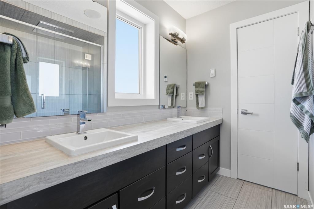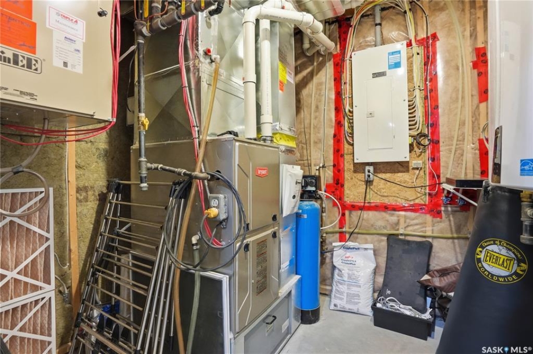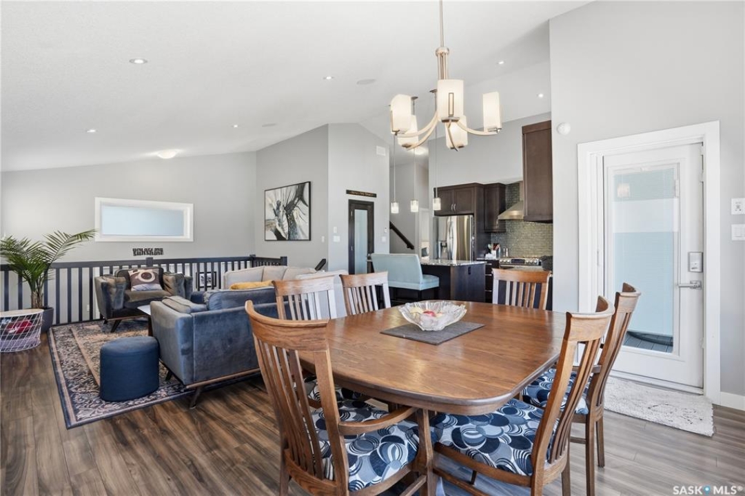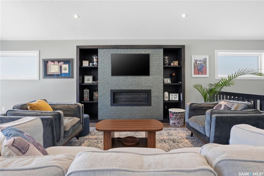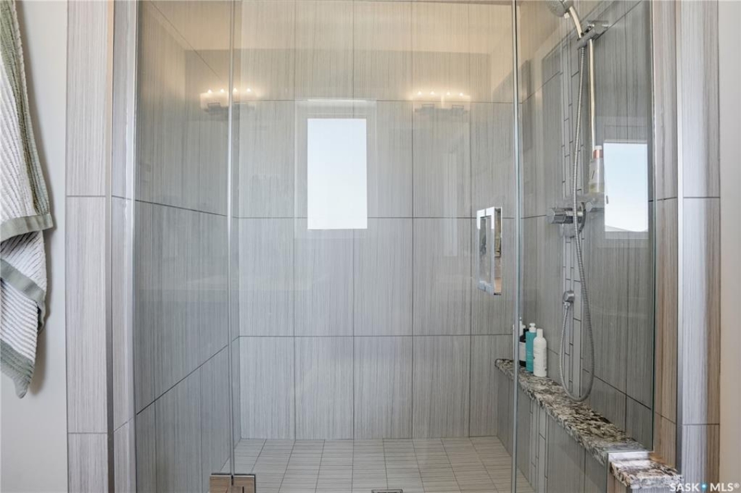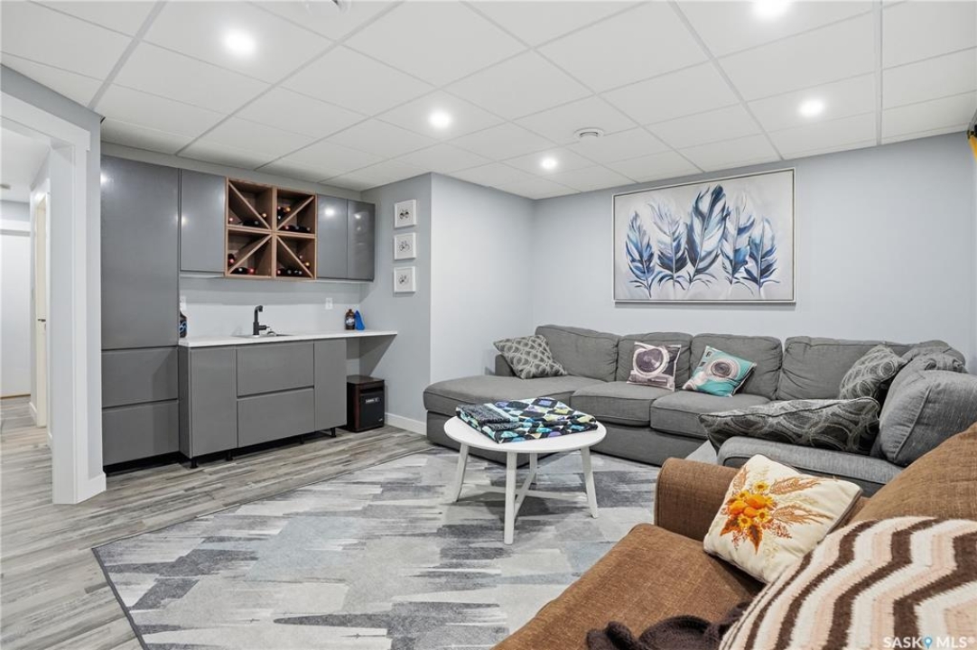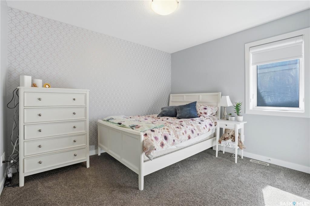 This custom modified bi-level was designed by Robinson Residential and built by Harmony Builders to a standard that's immediately apparent. If your family has outgrown your current home, this is worth a close look. The main level opens with a generously proportioned tiled entrance, direct garage access, and a large mudroom. Vaulted ceilings and an open concept layout draw in natural light throughout the day, flowing through the living area with laminate flooring, a natural gas fireplace, and a custom kitchen with large granite island, glass tile backsplash, under-cabinet lighting, and stainless steel appliances including a gas range. Two additional bedrooms on this level both include built-in closet shelving. Upstairs, the primary bedroom includes a large walk-in closet, in-ceiling speakers, plush carpet, and a hotel-inspired ensuite with heated tile floors, tiled walk-in shower, and oversized rain shower head. Second floor laundry with front-loading washer and gas dryer. The thoughtfully finished lower level adds an inviting rec and media room with wet bar, two additional bedrooms, and exceptional storage throughout. Construction highlights include an open web truss floor system, 2" exterior styrofoam insulation ($18k upgrade), and acrylic stucco, built for both durability and energy efficiency. Tankless water heater and water softener included. Outside: PVC fencing, eco turf, and a gazebo: low maintenance and designed for entertaining. 26 x 26 garage is insulated with Roxul for sound proofing. Triple exposed aggregate driveway with added value RV parking on the side. Walking distance to schools, parks, and the Joanne Goulet Golf Course.