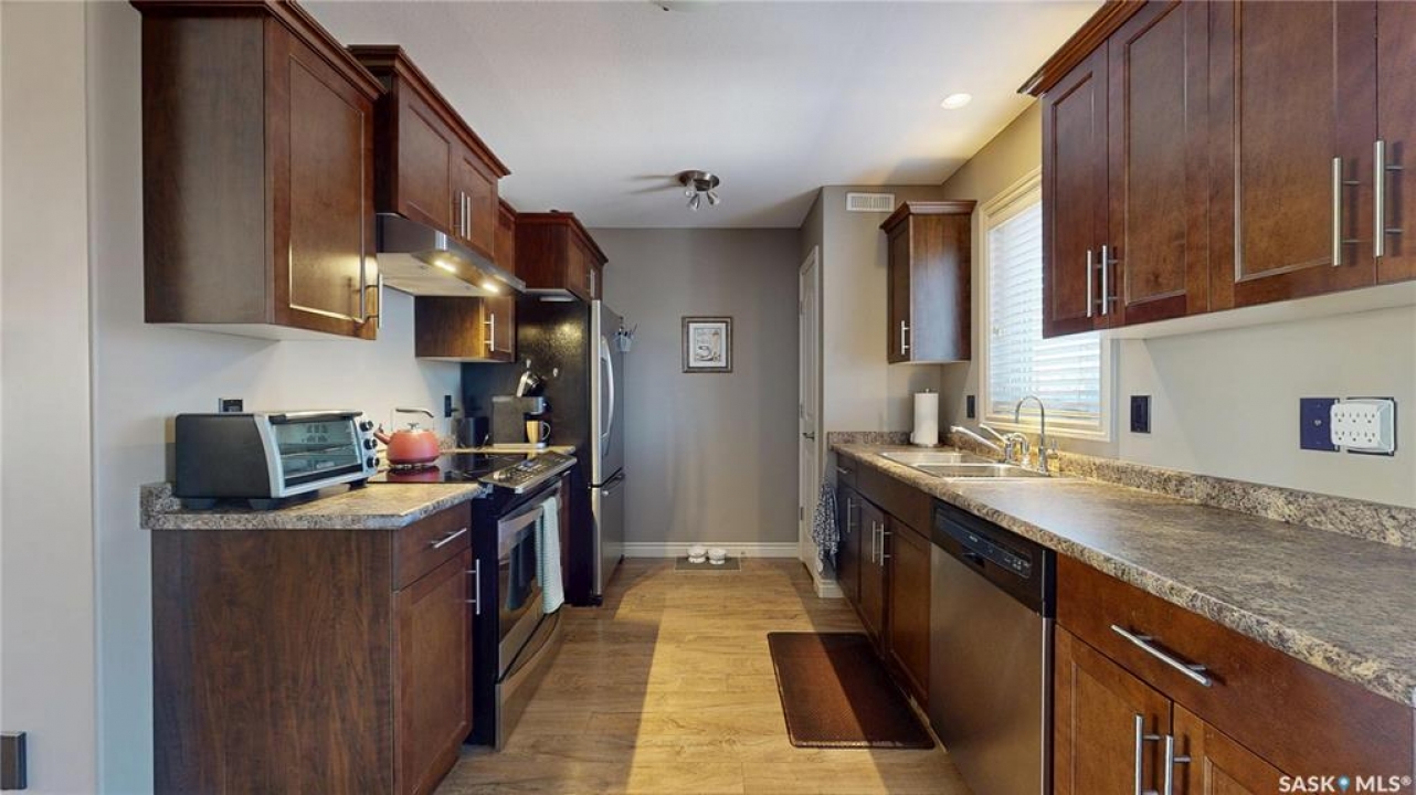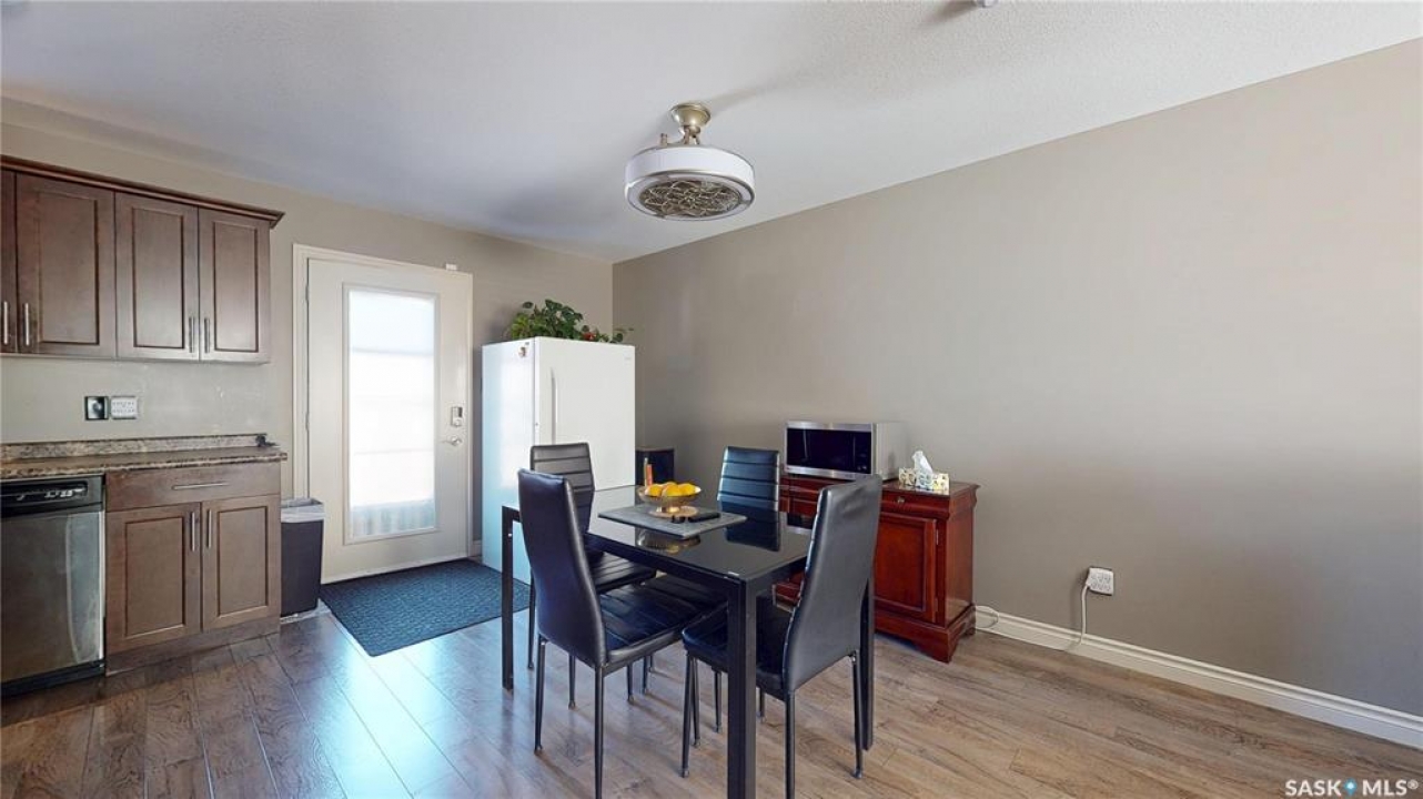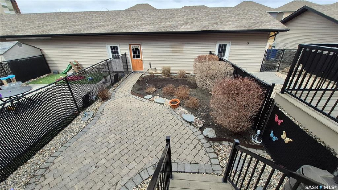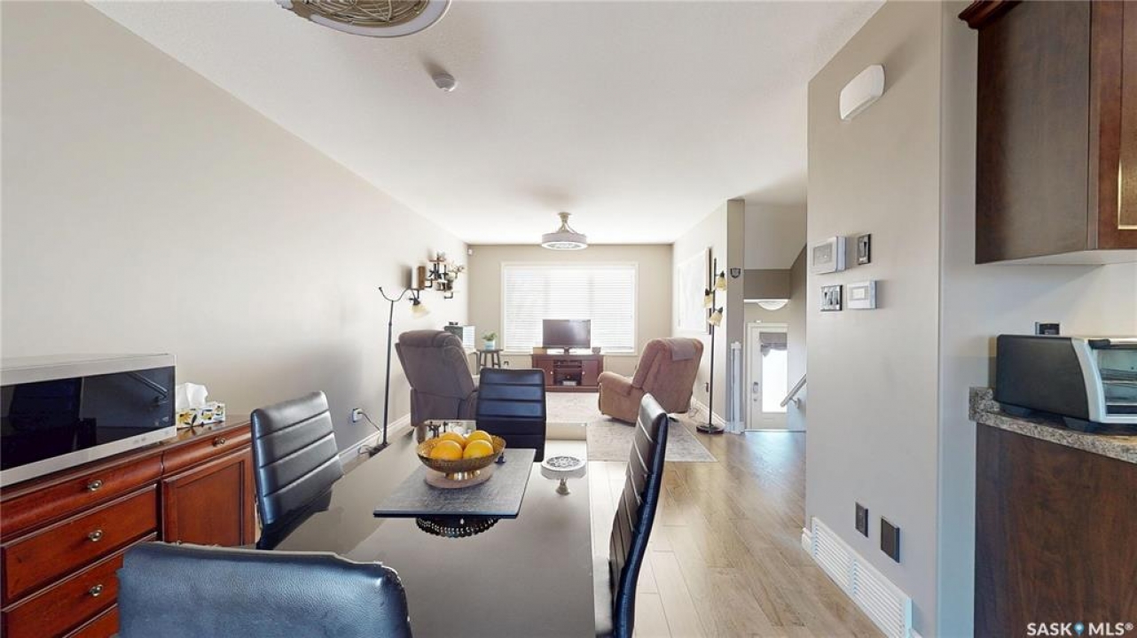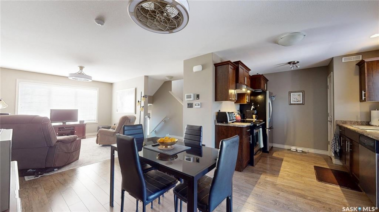 Welcome home to this beautifully maintained 1,176 sq. ft. two-storey townhome, complete with a double detached garage and, best of all, no condo fees, ideally situated in the highly desirable neighbourhood of Harbour Landing. Thoughtfully designed for comfortable living, the main floor features a bright and inviting open-concept layout. The living area is warm and welcoming, with laminate flooring, and flows seamlessly into a well-appointed kitchen with stainless steel appliances and a convenient pantry. The spacious dining area offers direct access to the backyard, making it perfect for everyday living and entertaining. Step outside to enjoy summer BBQs and relax on the patio in the beautifully landscaped yard. Upstairs, you'll find a versatile flex space on the landing, along with three bedrooms and the added convenience of second-floor laundry. The primary bedroom has direct access to a Jack-and-Jill full bathroom that also serves the two additional bedrooms. The fully developed basement provides even more living space, including a cozy family room, a full bathroom, ample storage under the stairs, and a utility room. Located just steps from Harbour Landing Elementary School, parks, walking paths, and a wide range of amenities, this home offers both convenience and a strong sense of community. Move-in ready and meticulously cared for, this is an excellent opportunity to own a fantastic home in one of Regina's most sought-after neighbourhoods.