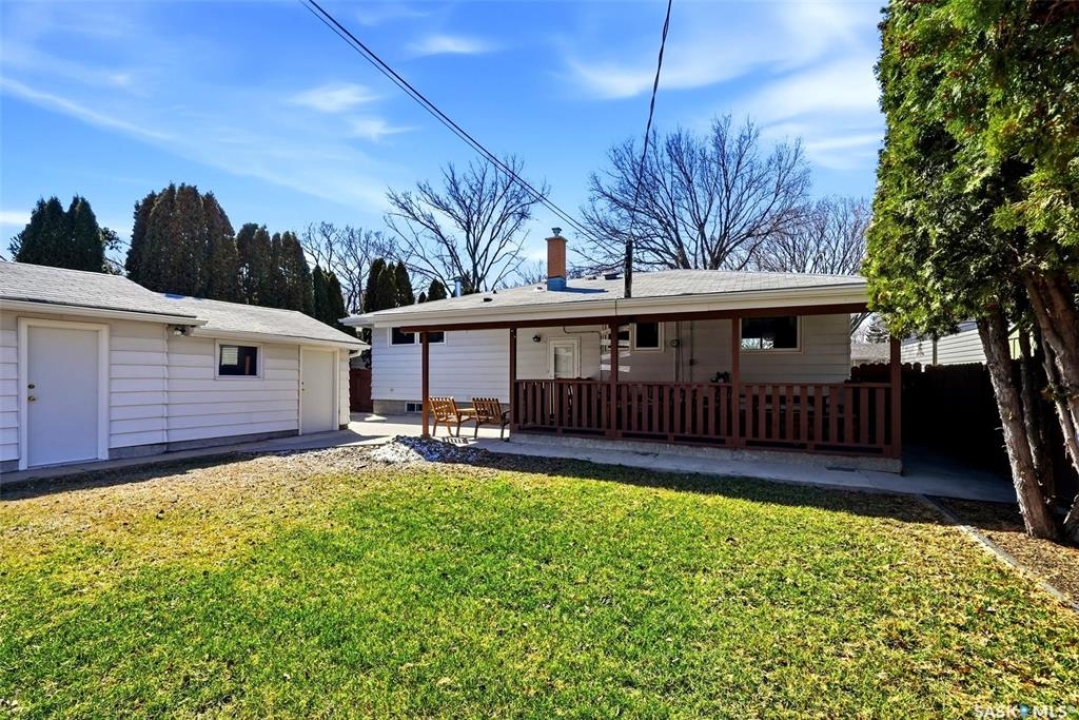 Welcome to 4027 Elphinstone Street—lovingly maintained by its original owners and thoughtfully updated over the past 60 years. Situated on a quiet street in desirable Parliament Place, this home offers fantastic street appeal! Step inside to a bright and spacious living room featuring three large updated triple-pane picture windows with custom cellular blinds (2023), allowing for an abundance of natural light. All windows on the main level have been updated to PVC. A cozy gas fireplace, added in 2003, creates a warm and inviting atmosphere. The living room flows seamlessly into the dining area and kitchen. Solid oak kitchen, updated in the 1990s, offers excellent functionality with a pantry featuring pullouts, pot drawer pullouts, and two built-in corner china cabinet. Appliances include a newer Whirlpool stove, microwave, hood fan, fridge, and a newer Bosch dishwasher. Main floor offers three bedrooms and a full bathroom complete with a jetted tub. Primary bedroom also features a convenient three-piece ensuite. Fully developed basement provides excellent additional living space with two more bedrooms, a den, and a large rec room complete with a wood-burning fireplace. A three-piece bathroom adds extra convenience, along with a cold storage room, a spacious utility room plus storage. Additional features include a newer sump pump, central air conditioning, and a central vacuum. Backyard is ideal for outdoor enjoyment, offering a large covered deck, a single detached garage with a newer overhead door, and a separate workshop area with a built-in bench. A storage shed is also included, and the deep lot provides ample space for potential future garage development. Ideally located in south Regina, this home is close to schools, parks, and all south-end amenities including shopping, restaurants, and services. Nearby bus routes provide convenient access to other areas of the city, adding to the overall appeal of this well-cared-for property.