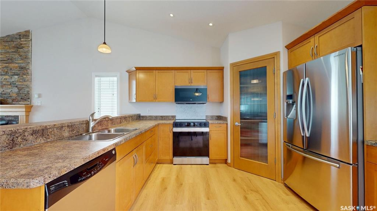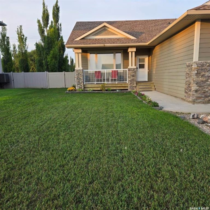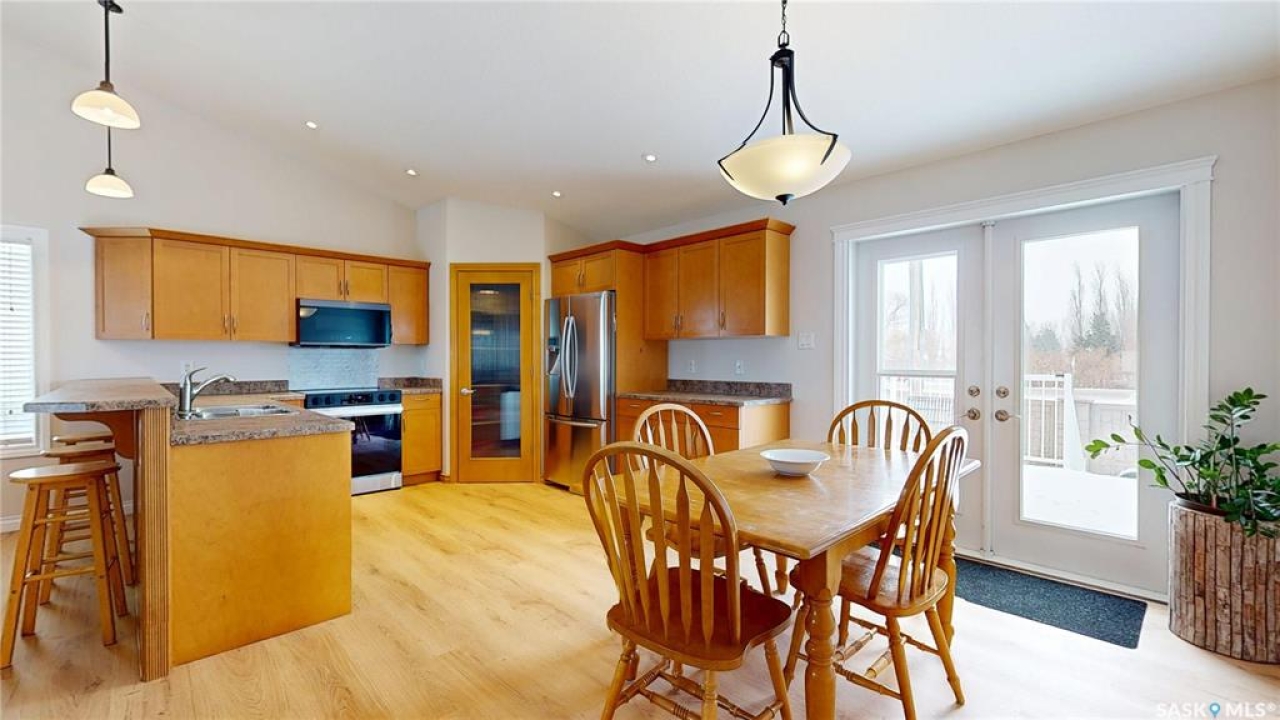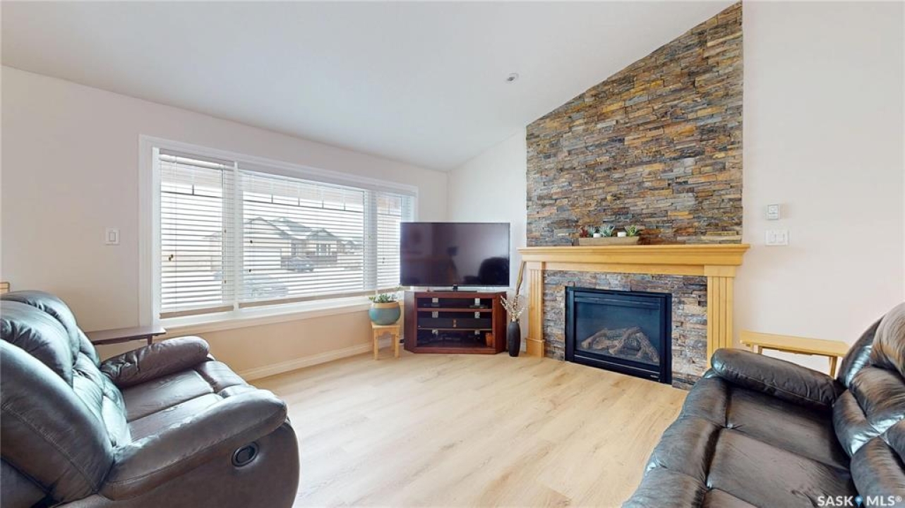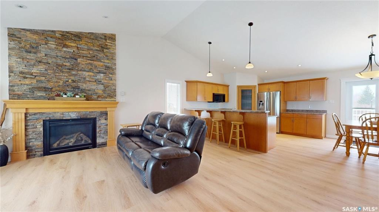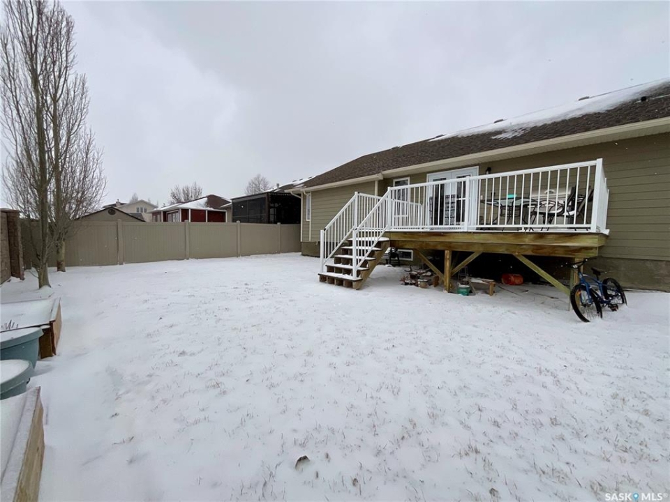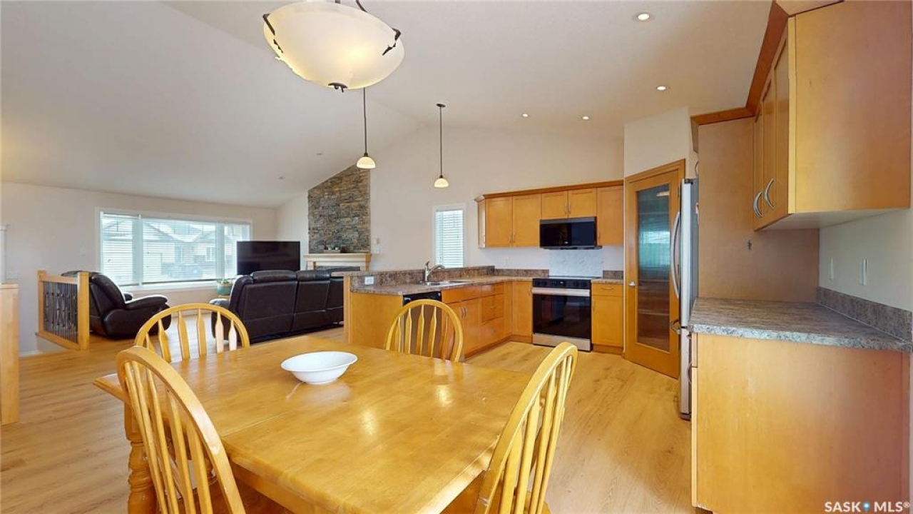 Welcome to this spacious 1480 sqft bungalow located in the desirable community of Pilot Butte, just 10 minutes from Regina. This well-designed home offers 5 bedrooms, 3 bathrooms, and plenty of space throughout. The front of the home features a lovely porch, adding great curb appeal and a welcoming place to enjoy your morning coffee. Step inside to a bright, open-concept main floor featuring a comfortable living room with a gas fireplace, a functional kitchen with plenty of cabinetry, a corner pantry, and updated stainless steel appliances, including a new stove and microwave installed in 2026, fridge, and built-in dishwasher. The dining area offers direct access to the 12'x16' south-facing deck, perfect for relaxing or entertaining. Down the hall, you'll find a spacious primary bedroom featuring a walk-in closet and large 3-piece ensuite. Two additional good-sized bedrooms and a 4-piece bathroom finish off the main floor. The fully developed basement offers even more living space with a large recreation room, two additional bedrooms, a den, 3-piece bathroom, and a dedicated utility/laundry room with a high-efficiency furnace, rented water heater, washer, and dryer. The double attached garage is insulated and heated, providing excellent storage and workspace, with the fridge, cabinets, and workbench included. There is also plenty of parking out front, adding extra convenience for guests or additional vehicles. Outside, the fully fenced and landscaped backyard features a storage shed, garden space, and plenty of room for kids, pets, entertaining, or simply enjoying the outdoors. Additional value is found in the home's smart features, including Wi-Fi enabled keyless entry, thermostat, smoke detectors, stove, and microwave, offering the convenience of app-based control and monitoring from your phone. This is a wonderful opportunity to enjoy small-town living with quick access to Regina amenities. Don't miss your chance to make this Pilot Butte bungalow your next home!