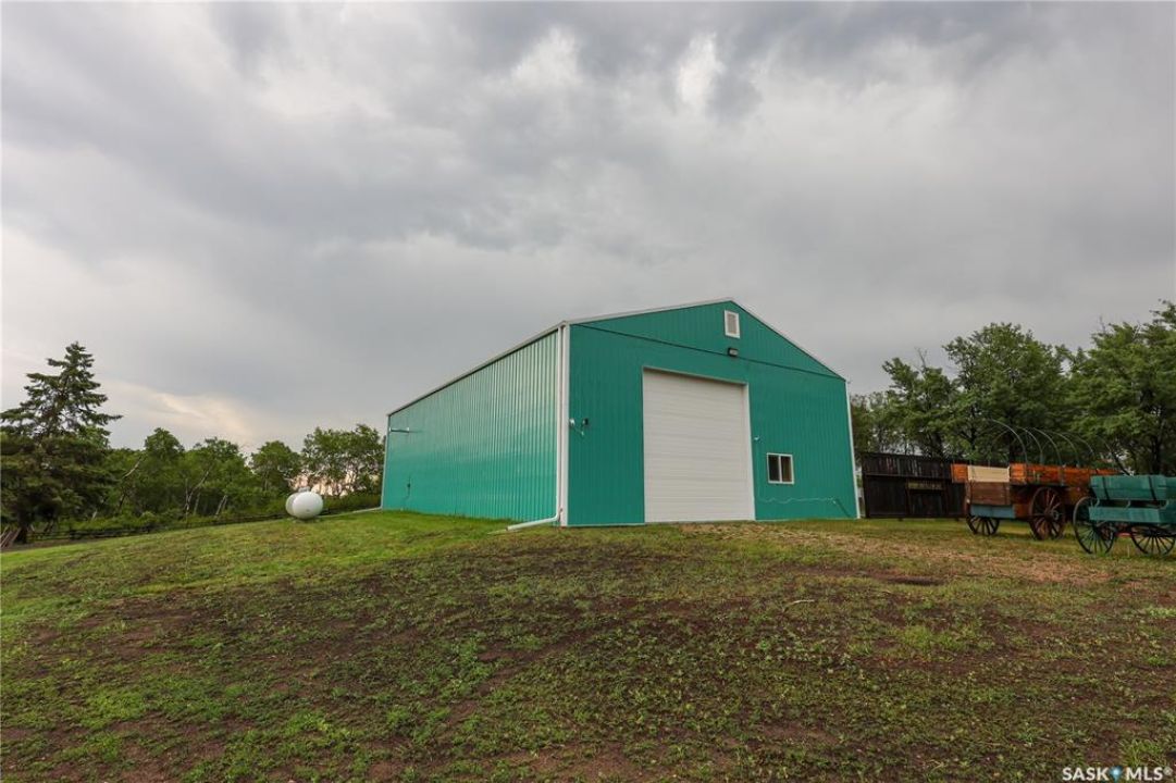 Remarkable 40 ft x 60 ft shop, built in 2021 and situated on 110.91 acres just 30 minutes from Prince Albert offers a perfect blend of functionality, space and privacy! This exceptional property features a spacious drive through shop with 14 ft overhead doors, providing ample room for large equipment or storage. The main floor includes a large workshop area, a cozy sitting space with ample cabinetry and a functional galley kitchen with sleek white cabinets. There is also a generous foyer and a 3 piece bathroom with a stand-up shower. The second level offers 2 sizable bedrooms, a combined laundry and bathroom area and an expansive storage room that provides plenty of space for all your organizational needs. Serviced by a 900 gallon concrete septic tank and a 54 ft well with a 36 inch diameter, this property provides a reliable water source, supplying approximately 25 ft of water. The mature trees surrounding the property enhance the natural beauty and offer a sense of seclusion and privacy. Additionally, the property offers many trails throughout that are perfect for quading, hiking or simply enjoying the outdoors. This acreage offers plenty of space and versatile land creating exciting possibilities for a hobby farm or ranch. Whether you envision gardens, fenced enclosures, or room to accommodate your outdoor pursuits, the options are endless. Seize the chance to own this versatile property today!